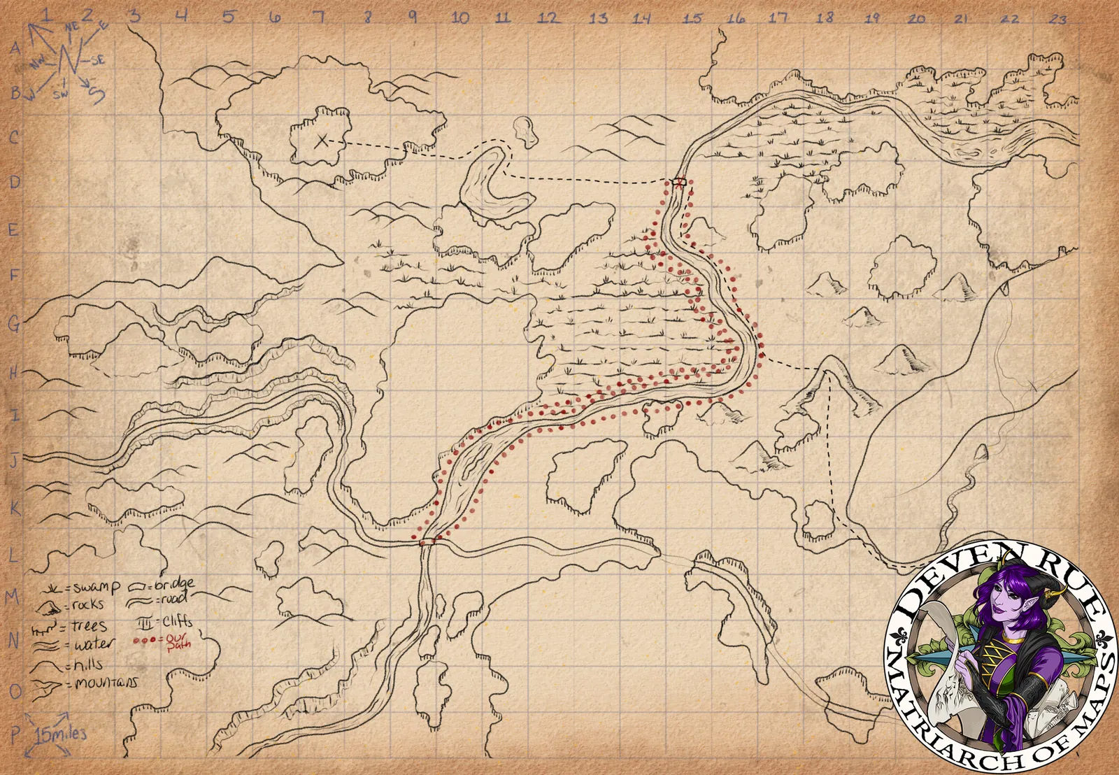 Scout Map charts a perilous route across rough terrain and river cuts. Moreover, the Scout Map fantasy route canvas highlights hazards with red markers and sparse symbols.