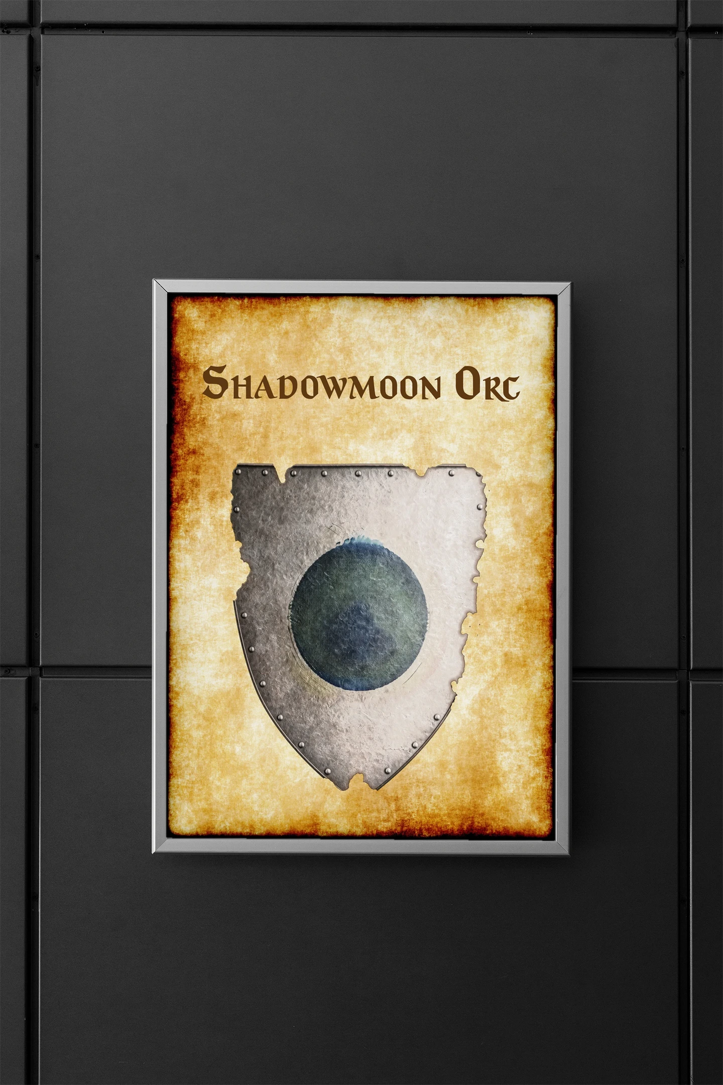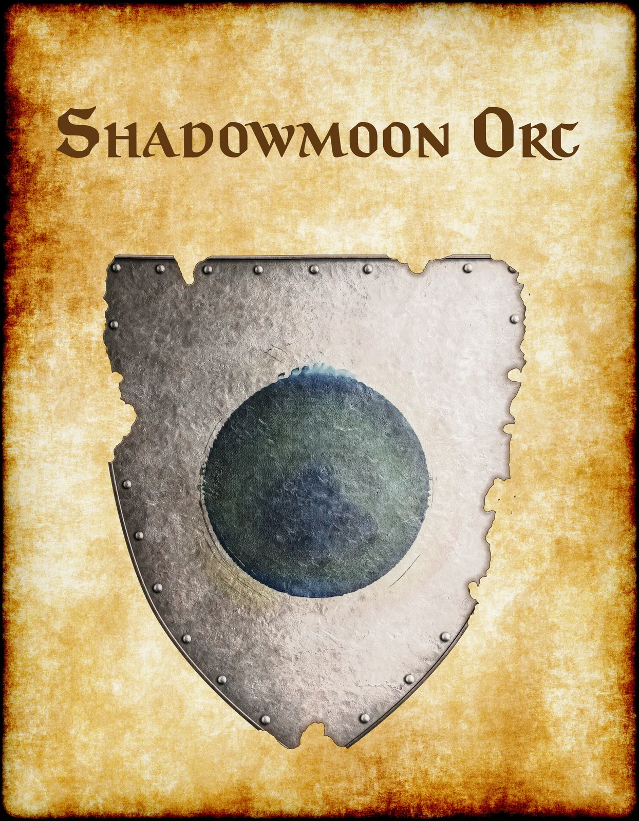 Additionally, the moon motif in muted teal connects to orcish lunar symbolism within Greyhawk’s northern wilderness tribes. The silver-gray field suggests tarnished armor worn through countless raids and territorial conflicts. Moreover, the distressed parchment background frames the device as a recovered battlefield relic or war trophy.