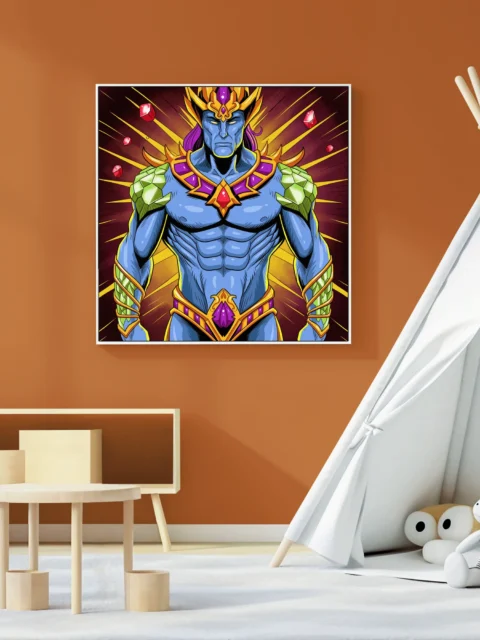 Game rooms focused on fantasy TCG collections gain a muscular centerpiece that matches bold poster aesthetics. Additionally, the frontal composition works particularly well above gaming tables or display shelves.