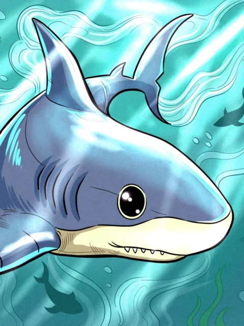 Additionally, the color palette balances cool turquoise waters against the shark’s warm cream jaw tones. Flowing white current lines and streaming light rays create directional movement across the composition. The oversized eye with white highlight reflections also gives the predator an unexpectedly friendly expression.