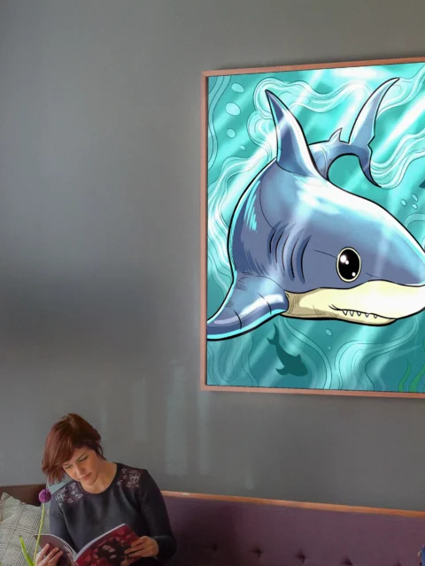 A stylized shark glides through turquoise ocean currents with oversized glossy eyes. This sharkling art trading card art canvas print presents Fabricio Vainer’s digital illustration as a standalone piece. The creature’s blue-gray body features smooth cel-shaded gradients, notably contrasting with its cream underbelly.