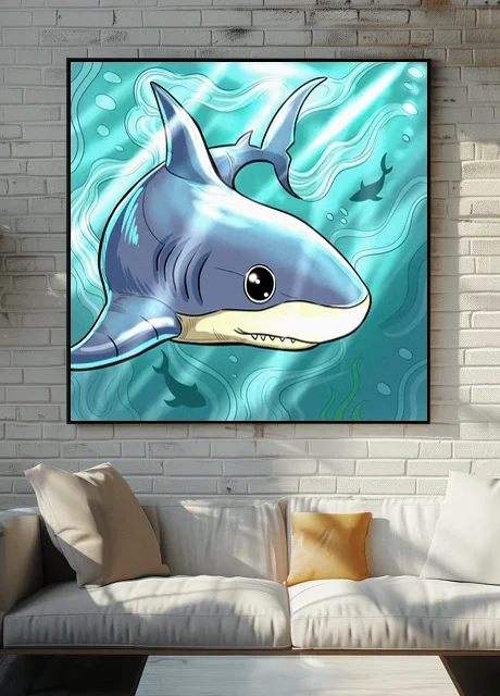 A stylized shark glides through turquoise ocean currents with oversized glossy eyes. This sharkling art trading card art canvas print presents Fabricio Vainer’s digital illustration as a standalone piece. The creature’s blue-gray body features smooth cel-shaded gradients, notably contrasting with its cream underbelly.