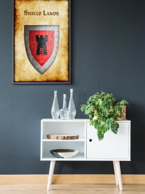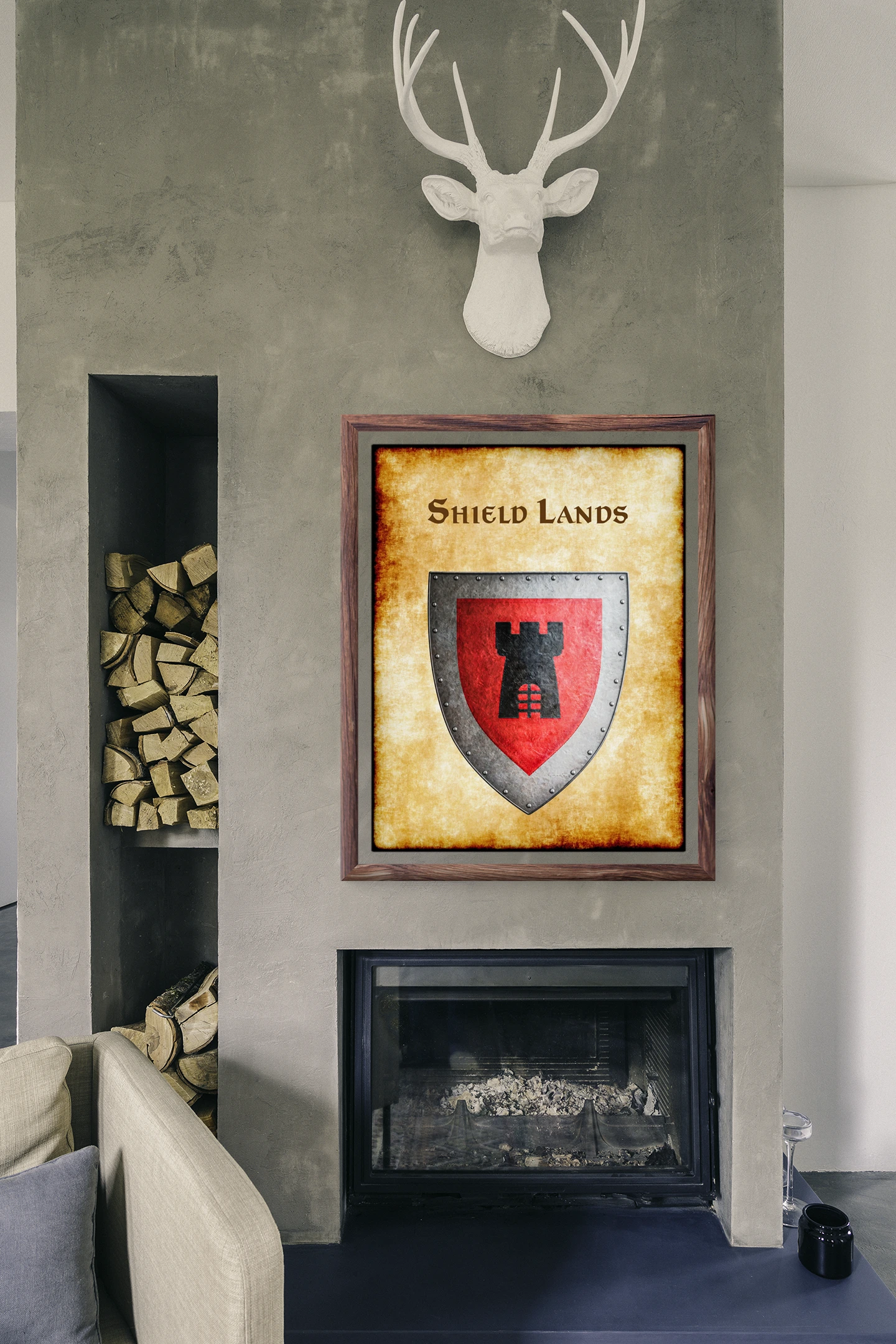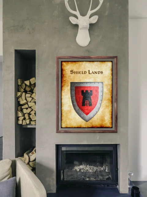 The heraldic device belongs beside a campaign journal or reference binder during Shield Lands adventures. Furthermore, the weathered aesthetic matches the kingdom’s war-torn history in your game room.