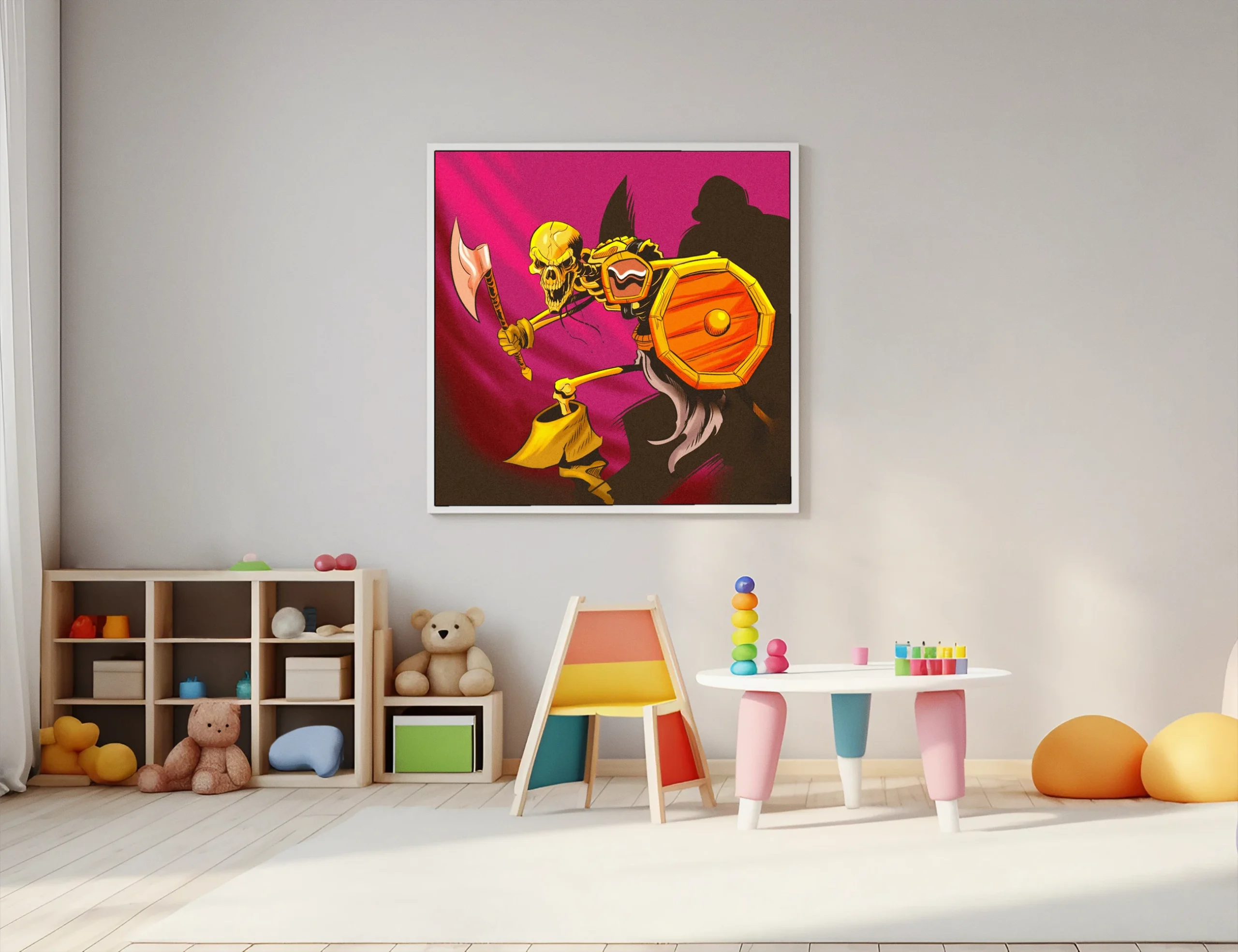 Game rooms and collector galleries benefit from the aggressive pose and high-contrast color scheme. Additionally, the bold comic book style aesthetic pairs well with other fantasy character illustrations.