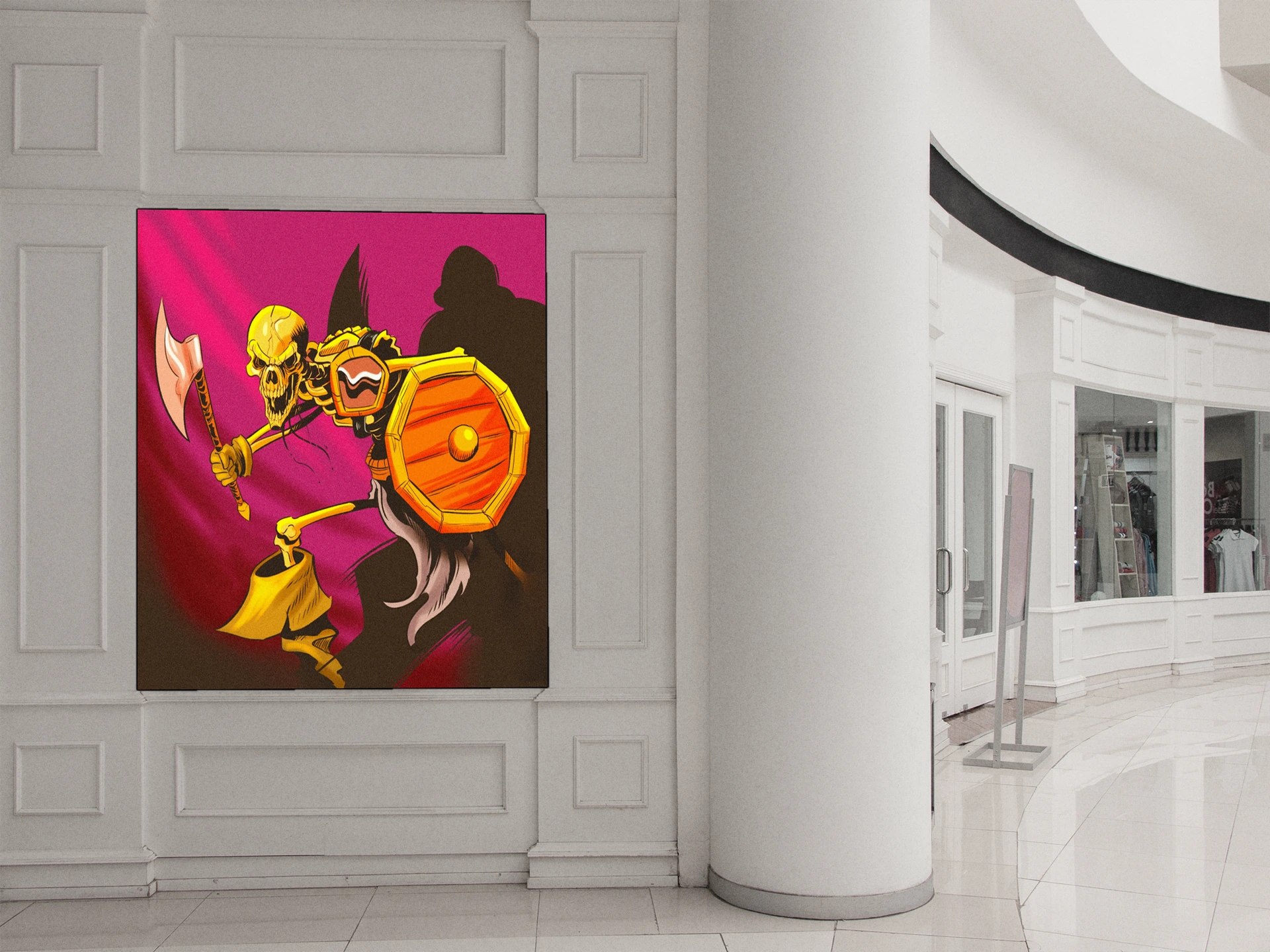 Additionally, the magenta-to-crimson gradient background creates violent energy behind the figure. Golden-yellow bone coloration contrasts sharply against the deep red atmospheric wash. The dark silhouette shadow cast behind the warrior, moreover, adds dimensional depth to the composition.