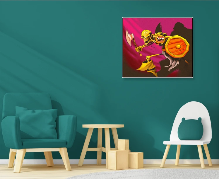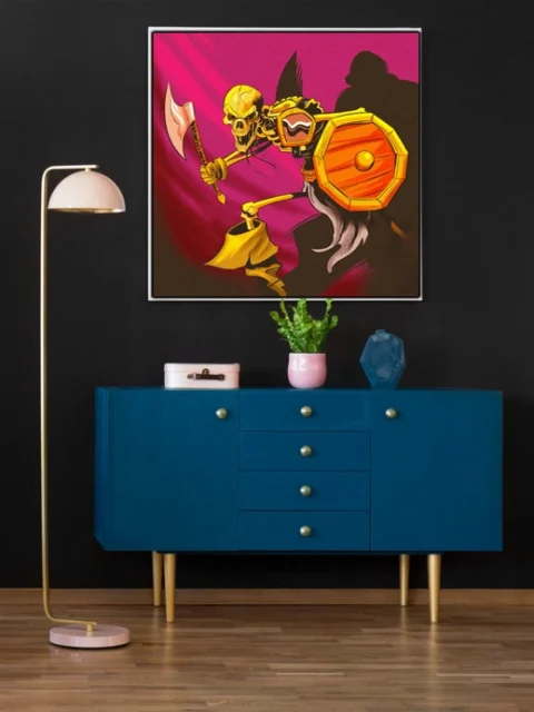 A skeleton warrior charges forward with battle axe raised overhead. This skeleton art trading card art canvas print captures Fabricio Vainer’s cel-shaded illustration in full. The octagonal wooden shield, notably, features a golden rim and central boss.