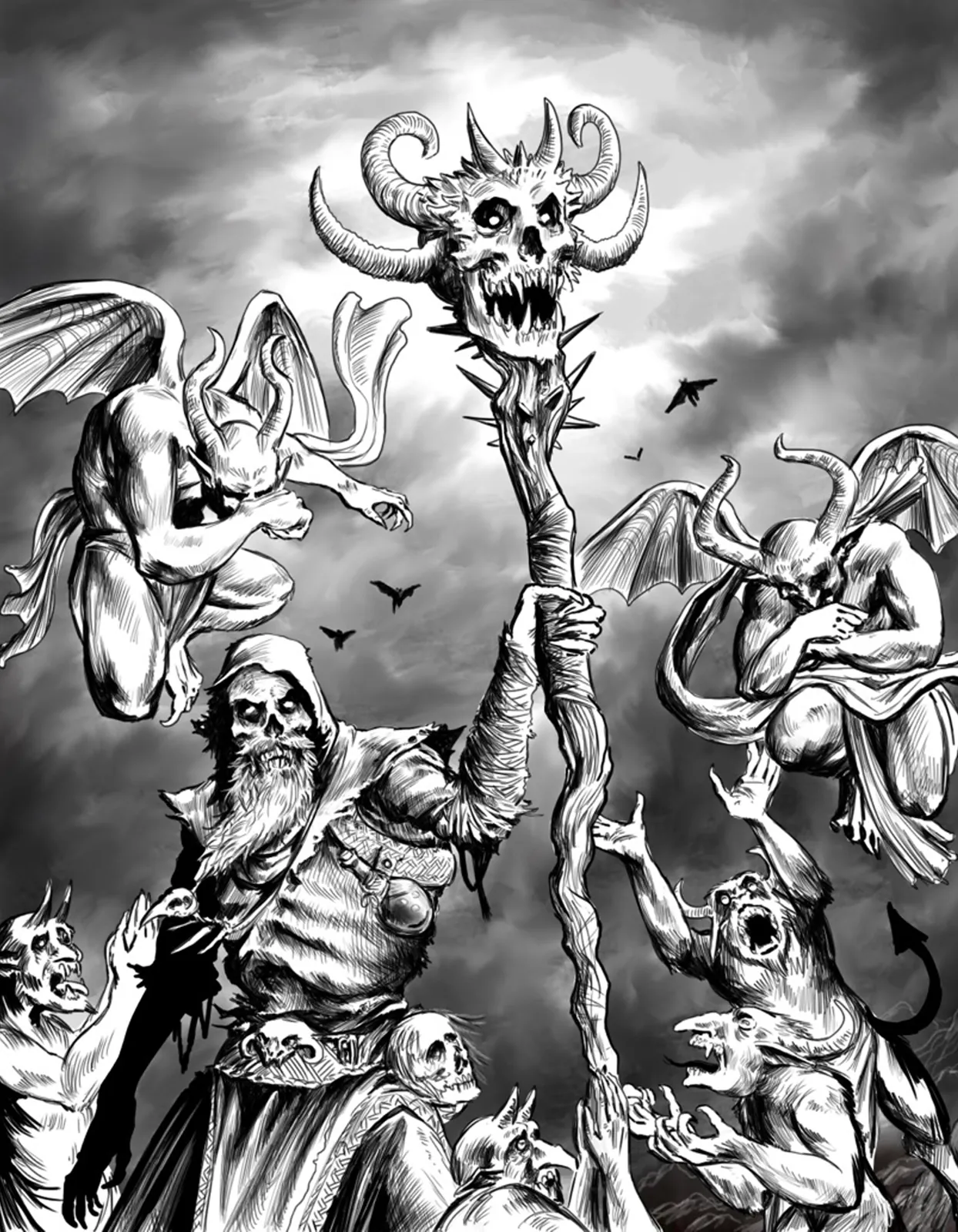 Skull Staff of Stelos captures a moment of forbidden power, where ritual, devotion, and terror converge beneath a storm-dark sky. Moreover, the horned skull staff dominates the scene, rising above its followers like a symbol of absolute authority and blasphemous command.
