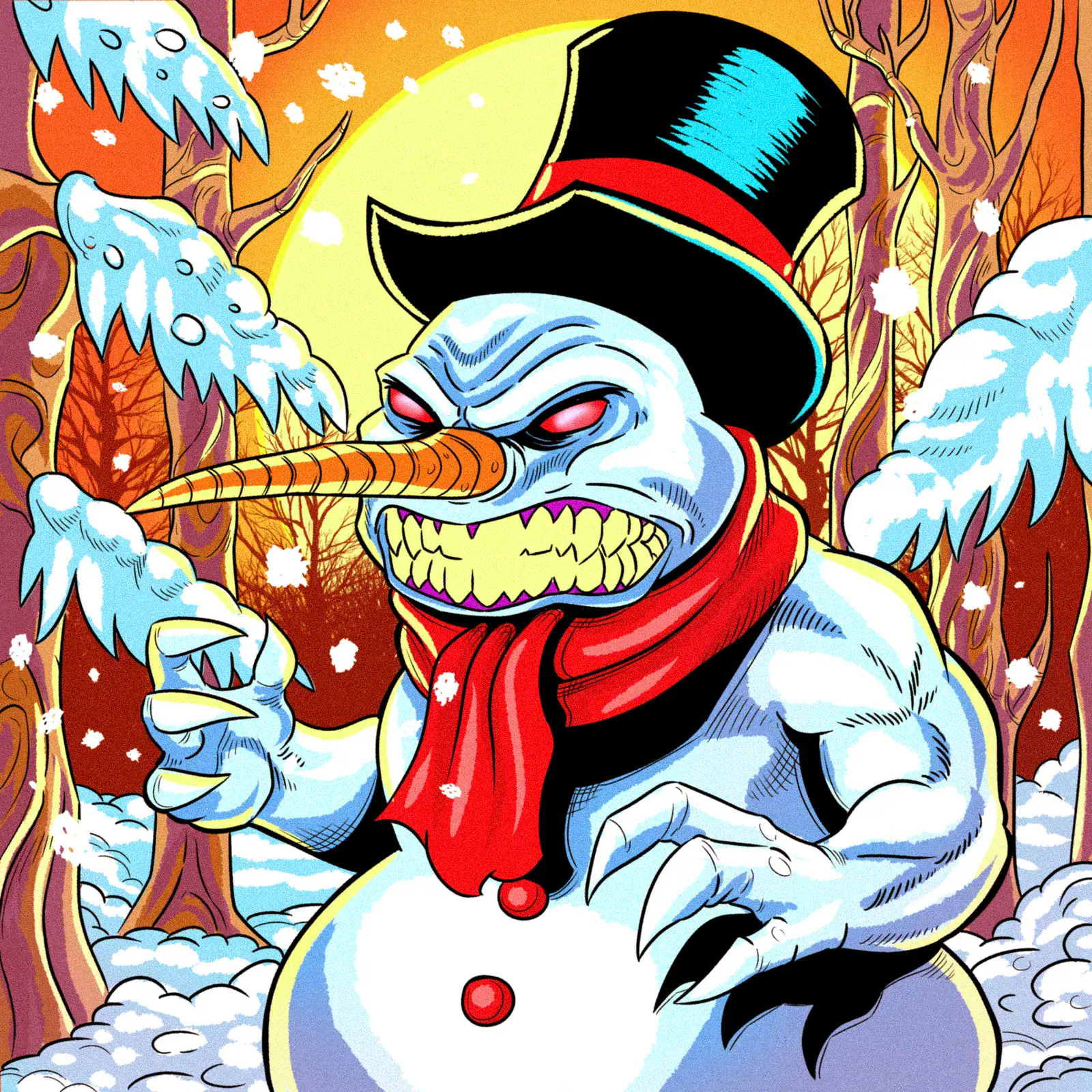 A menacing snowman creature grins wickedly with glowing red eyes and razor-sharp fangs. This snowman art trading card canvas print captures Fabricio Vainer’s retro comic book style. Notably, warm orange lighting contrasts against the pale blue monster’s threatening smile.