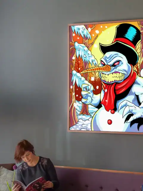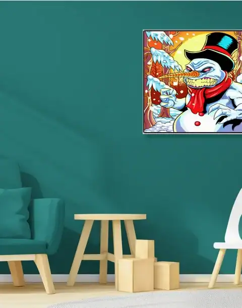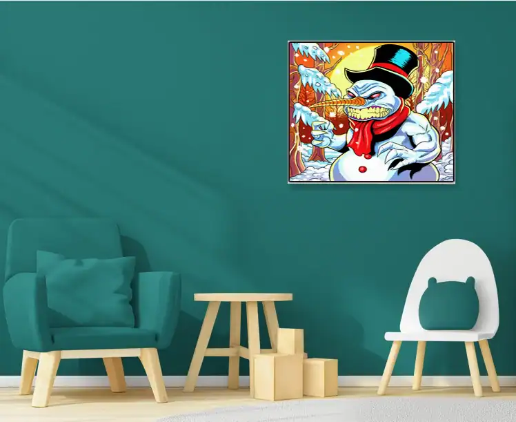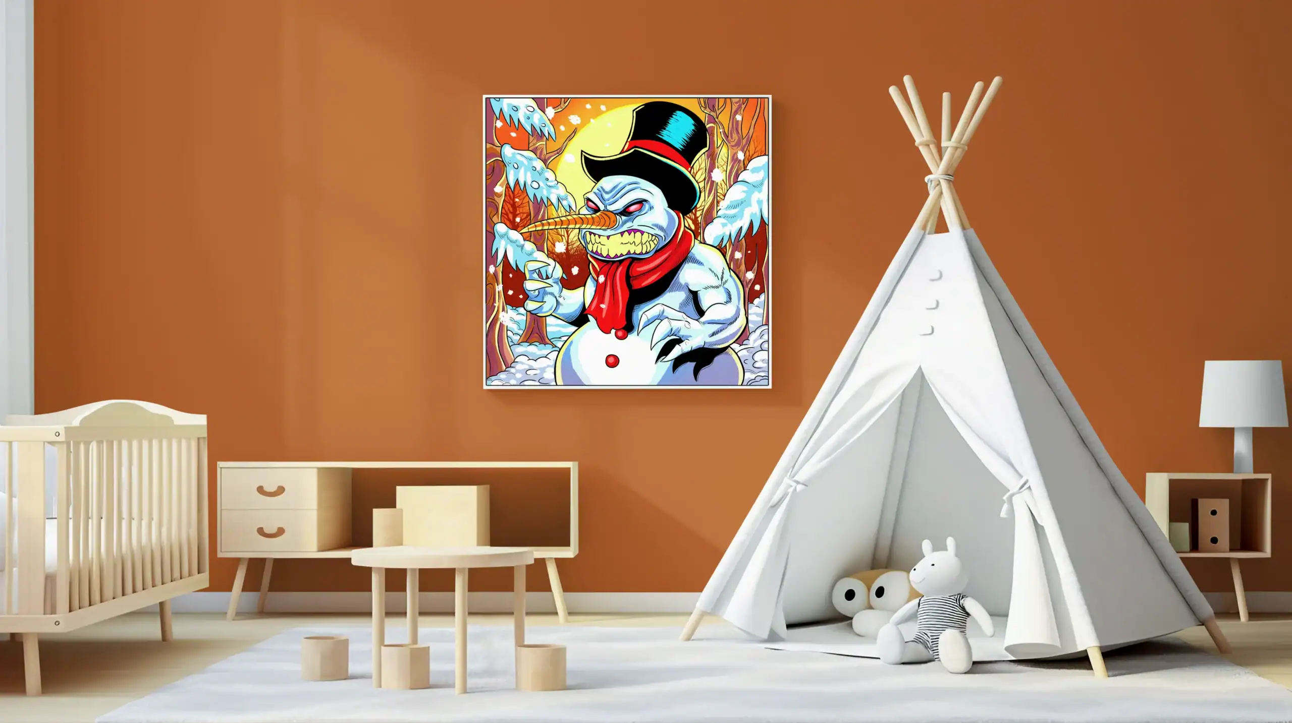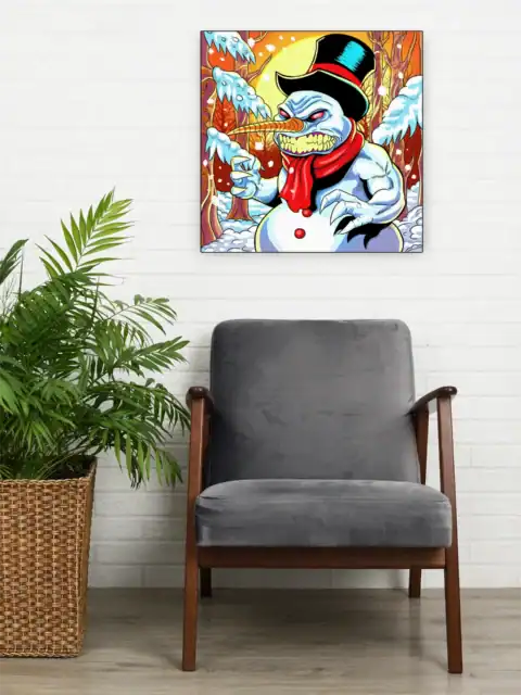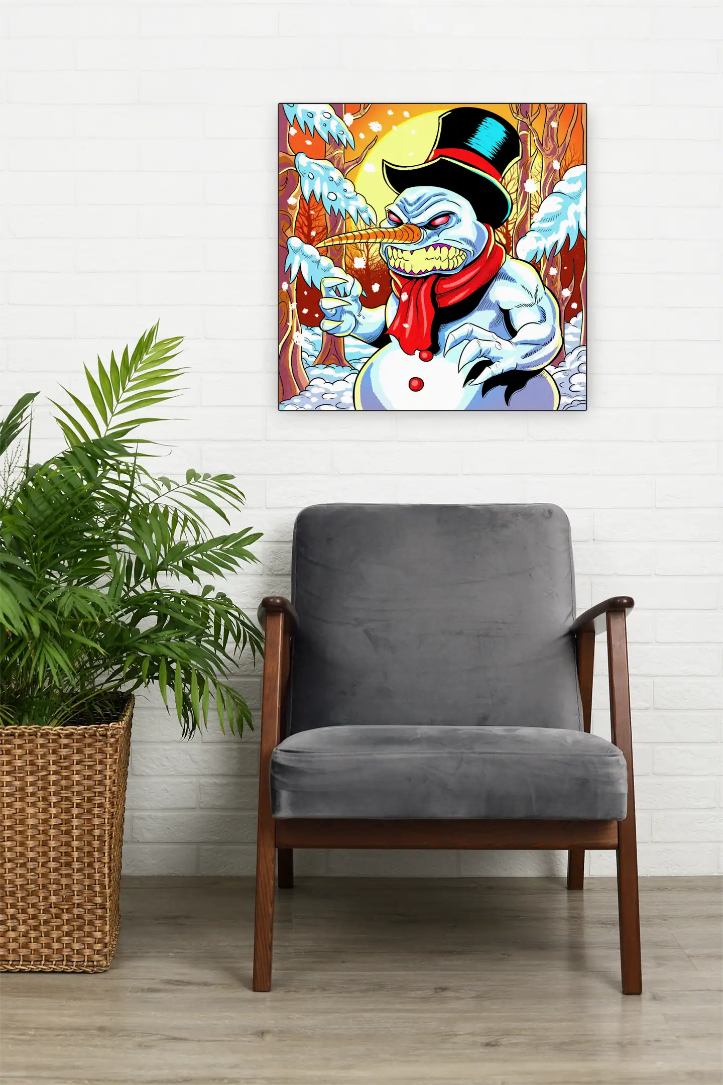 This piece brings darkly humorous fantasy into spaces that embrace unconventional art. TCG collectors and comic art fans appreciate Vainer’s distinctive 1990s aesthetic. Particularly, this snowman art trading card canvas print commands attention in any collection.