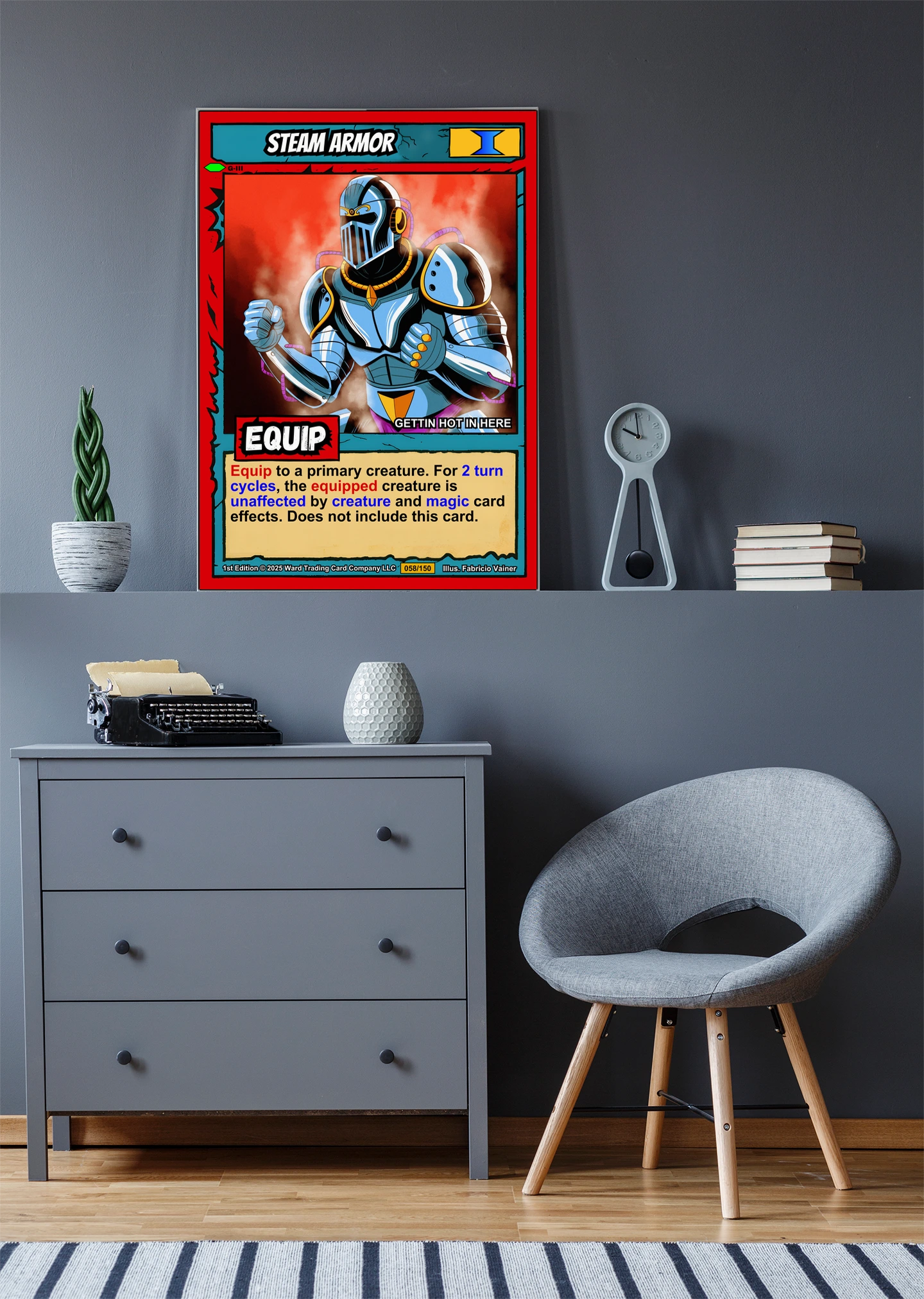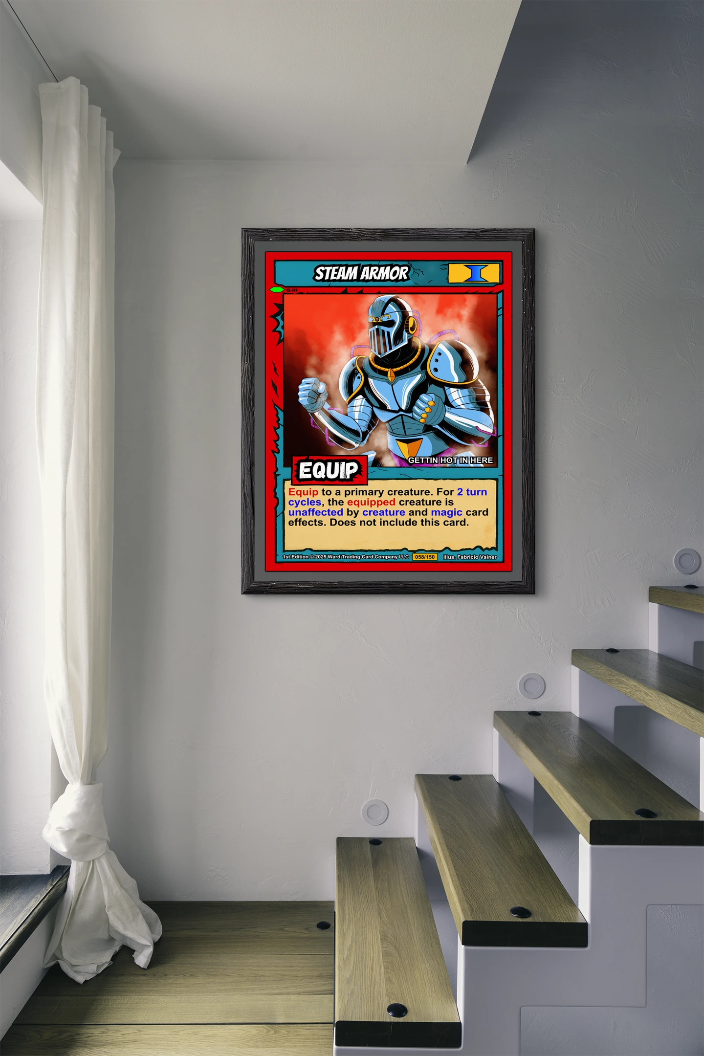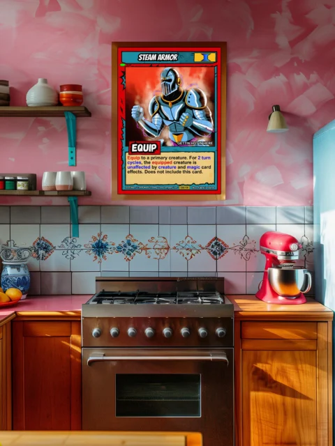 The cel-shaded illustration reads clearly from across a room. Collectors of Ward equipment cards and fantasy armor art will recognize the bold comic book linework. This steam armor trading card canvas print preserves Fabricio Vainer’s original 058/150 1st Edition composition.
