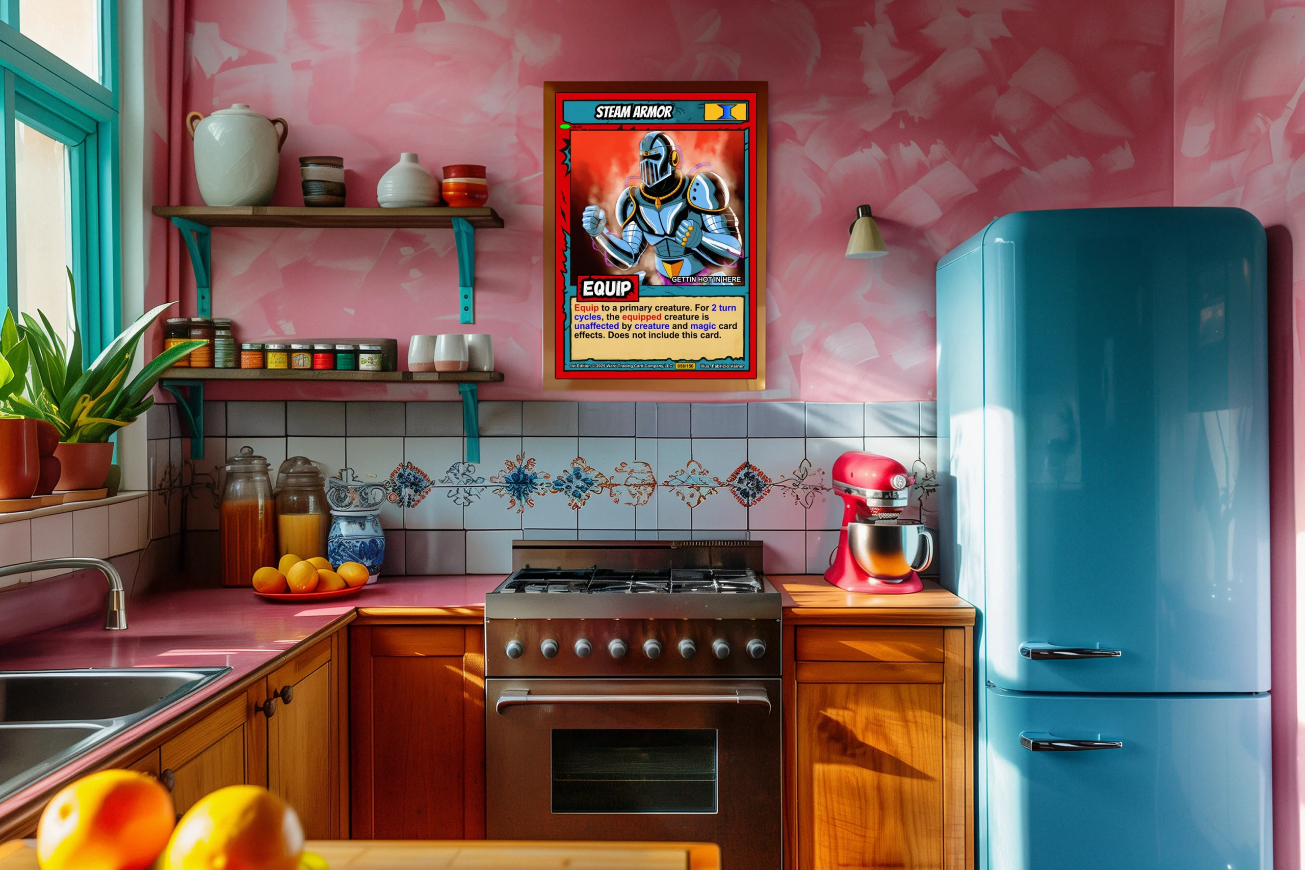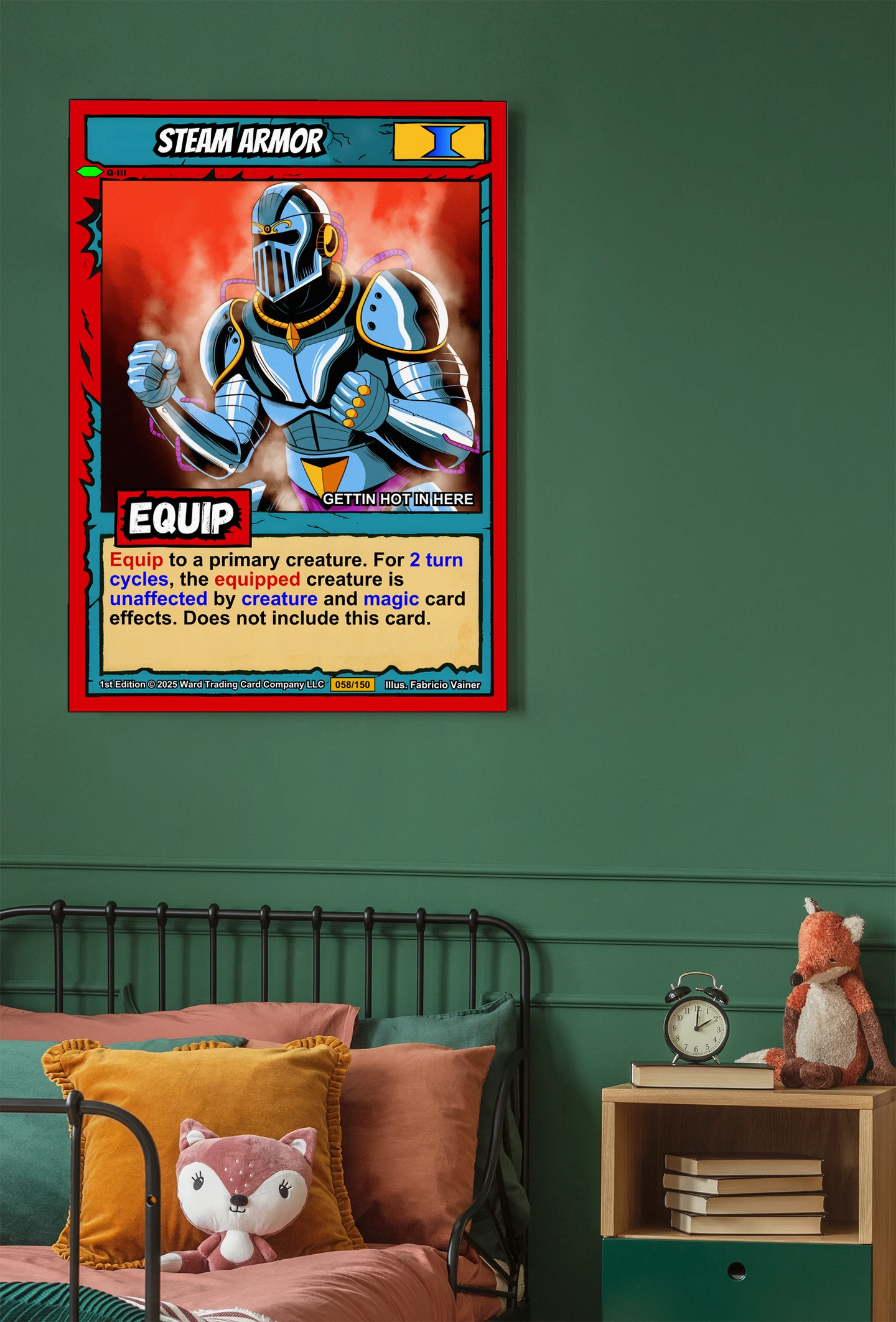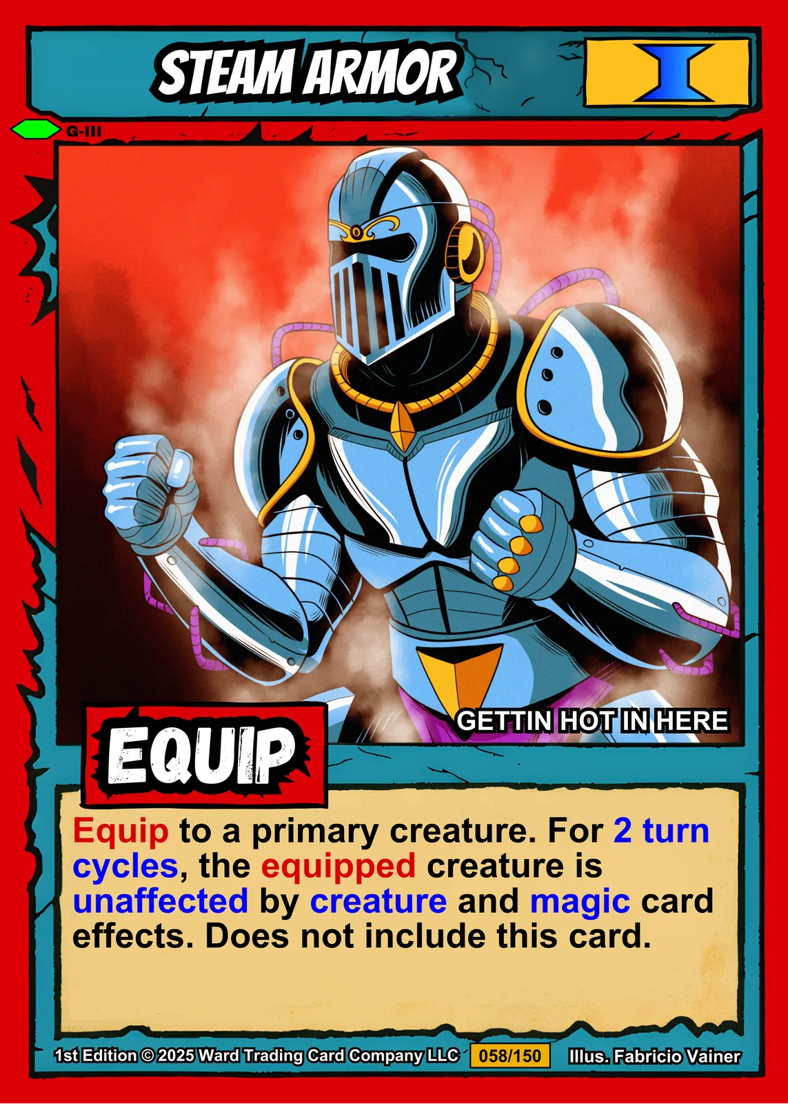 The cel-shaded illustration reads clearly from across a room. Collectors of Ward equipment cards and fantasy armor art will recognize the bold comic book linework. This steam armor trading card canvas print preserves Fabricio Vainer’s original 058/150 1st Edition composition.