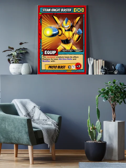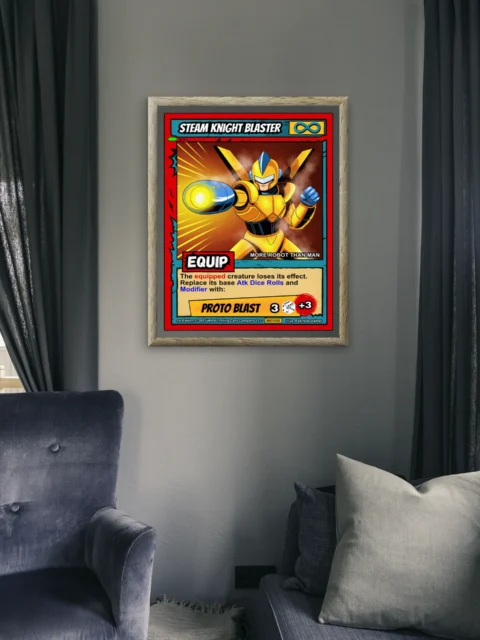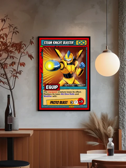 At display scale, the striking gold and blue armor commands immediate attention. Every detail from the V-shaped helmet crest to the glowing energy blast remains sharp. This steam knight blaster trading card canvas print transforms any space into a gamer’s paradise.