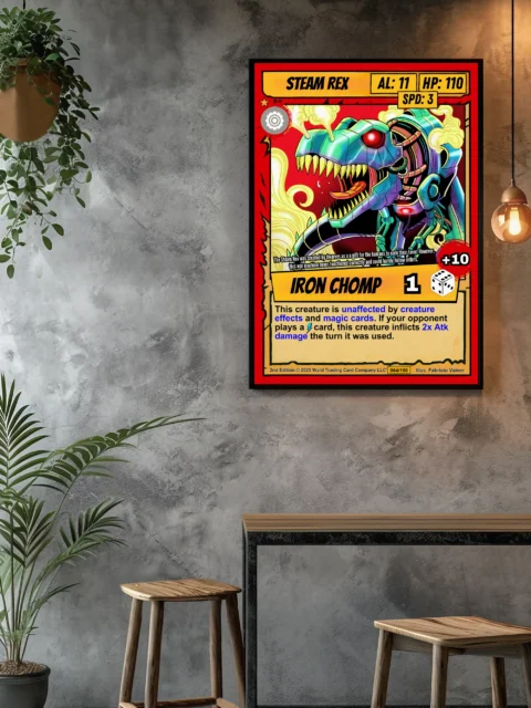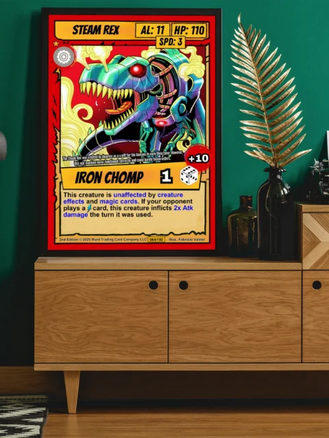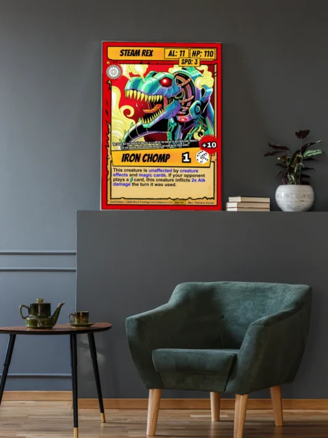 This piece works in game rooms where bold mechanical creatures anchor the wall. Furthermore, it pairs well with other Ward TCG steampunk dinosaur cards from the same set.
