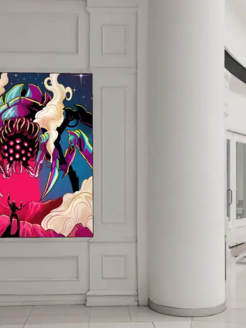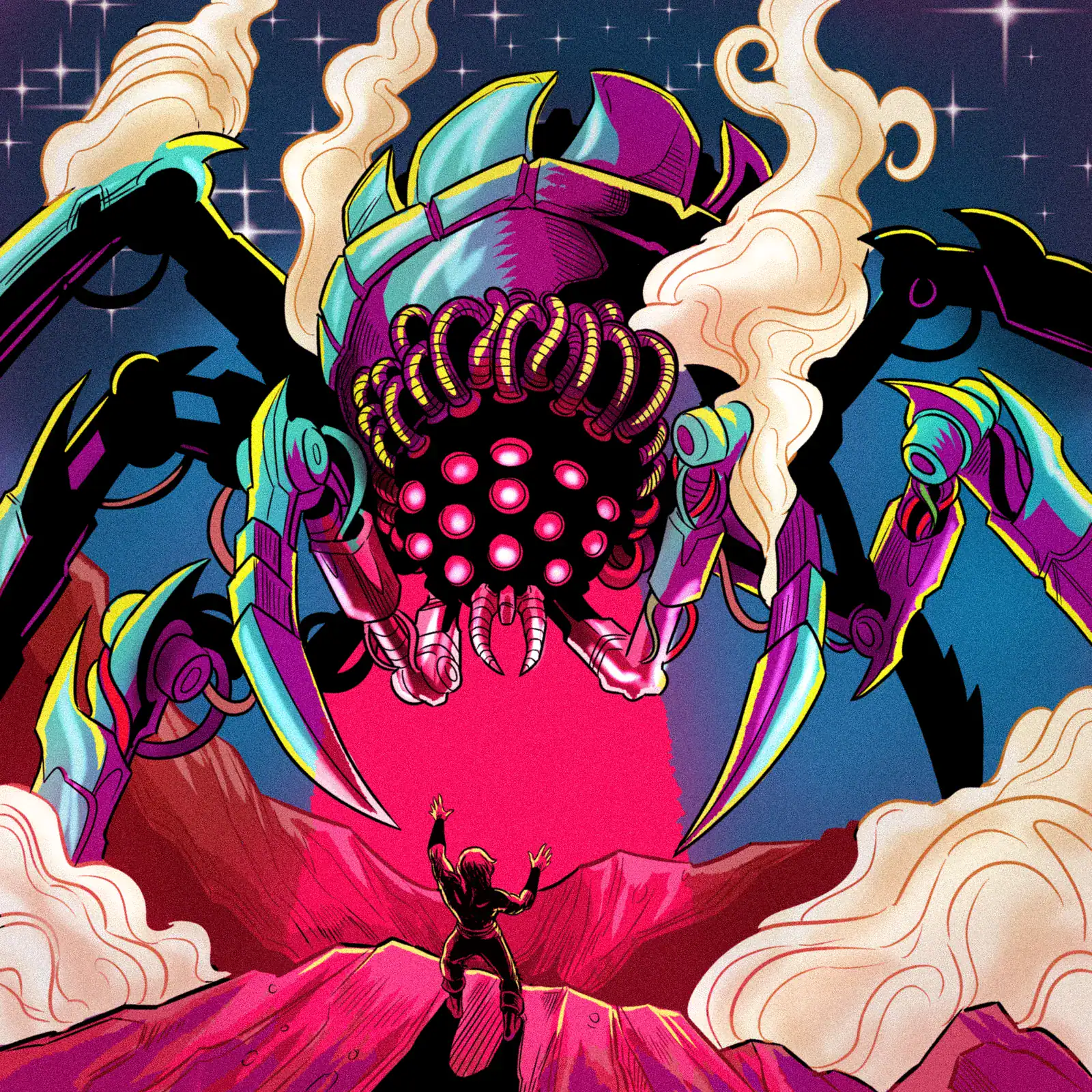 A colossal spider towers over a tiny human figure, its magenta body blazing with pink markings. This steam spider art trading card canvas print captures Fabricio Vainer’s bold comic styling. Turquoise armor plating catches starlight against the deep blue night sky.