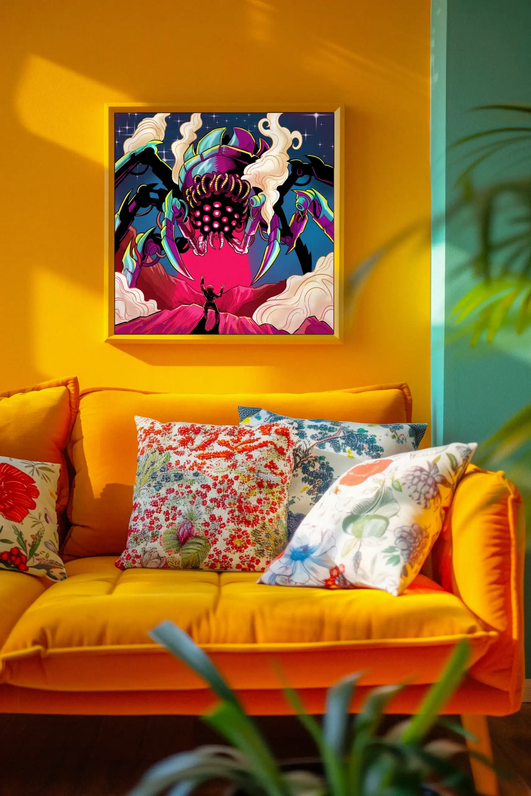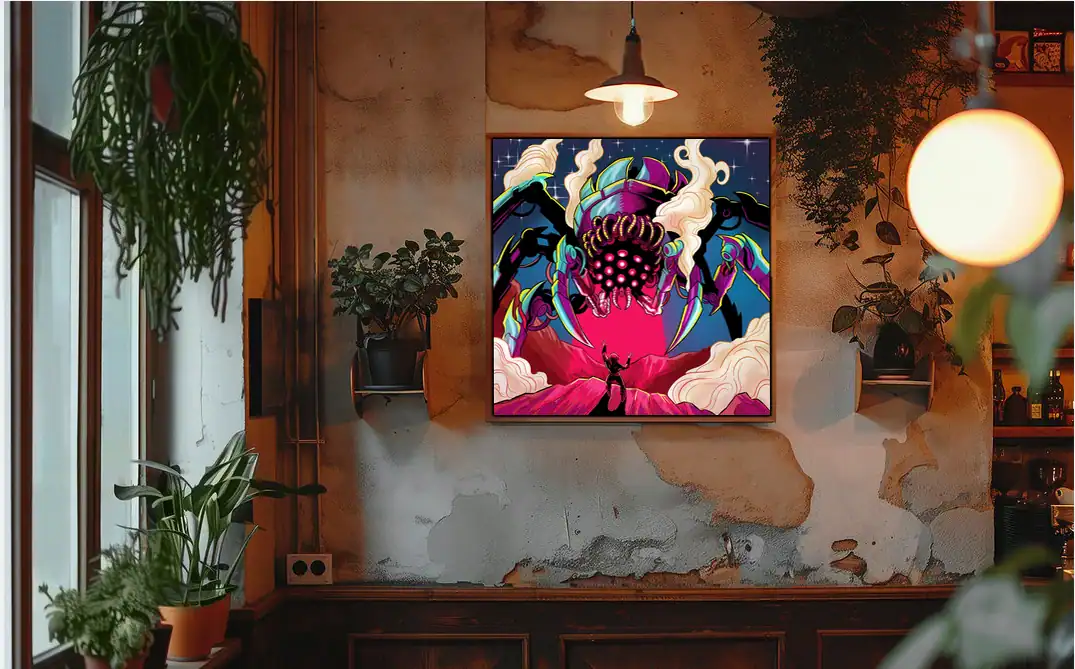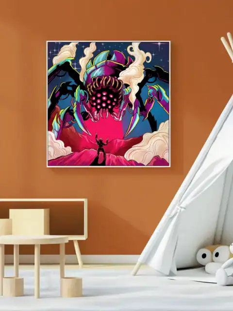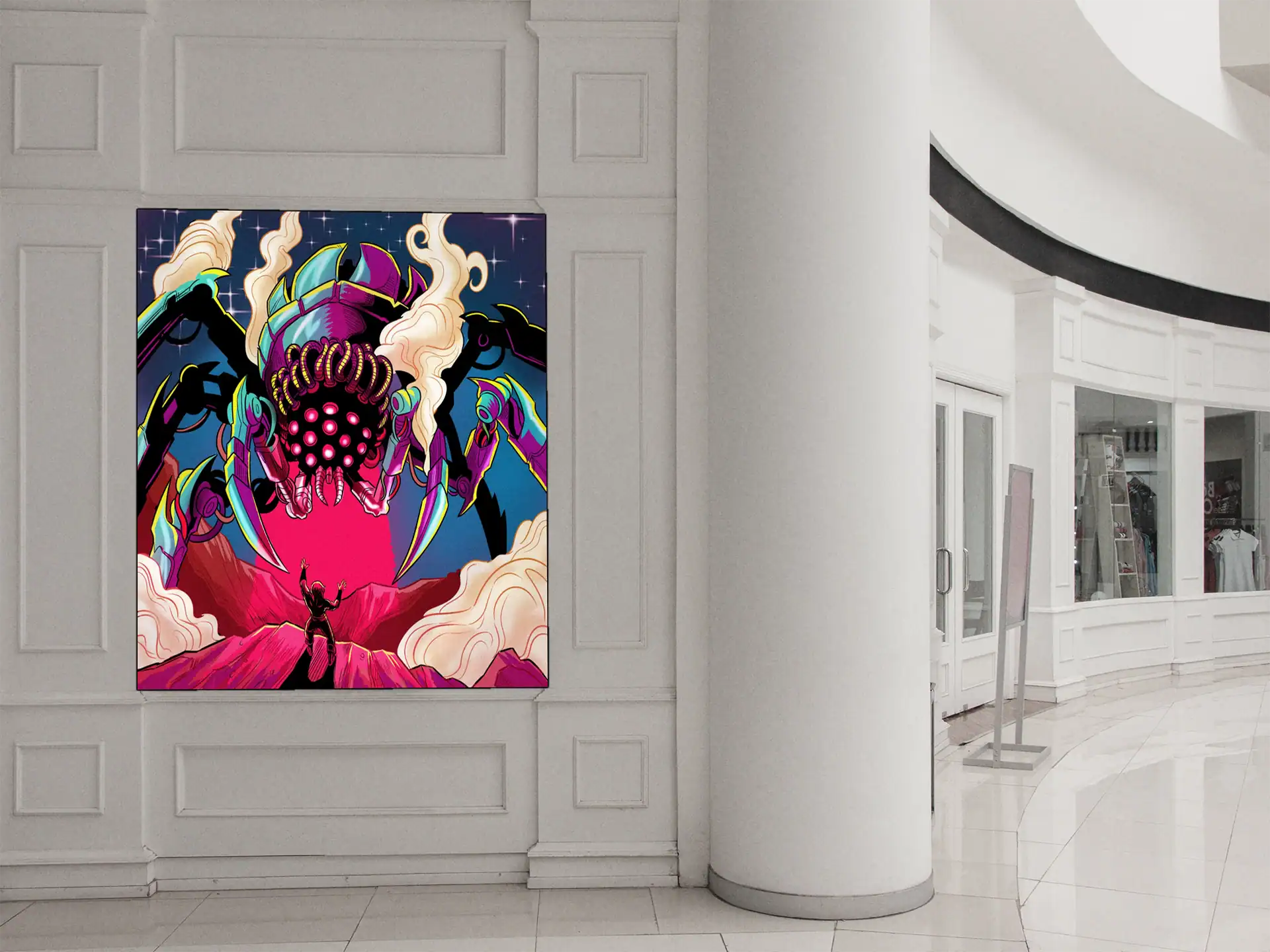 Owning this declares your appreciation for classic TCG monster design and comic artistry. Collectors who value Fabricio Vainer’s work recognize authentic 90s-inspired creature illustration. Moreover, this steam spider art trading card canvas print commands respect in any collection.