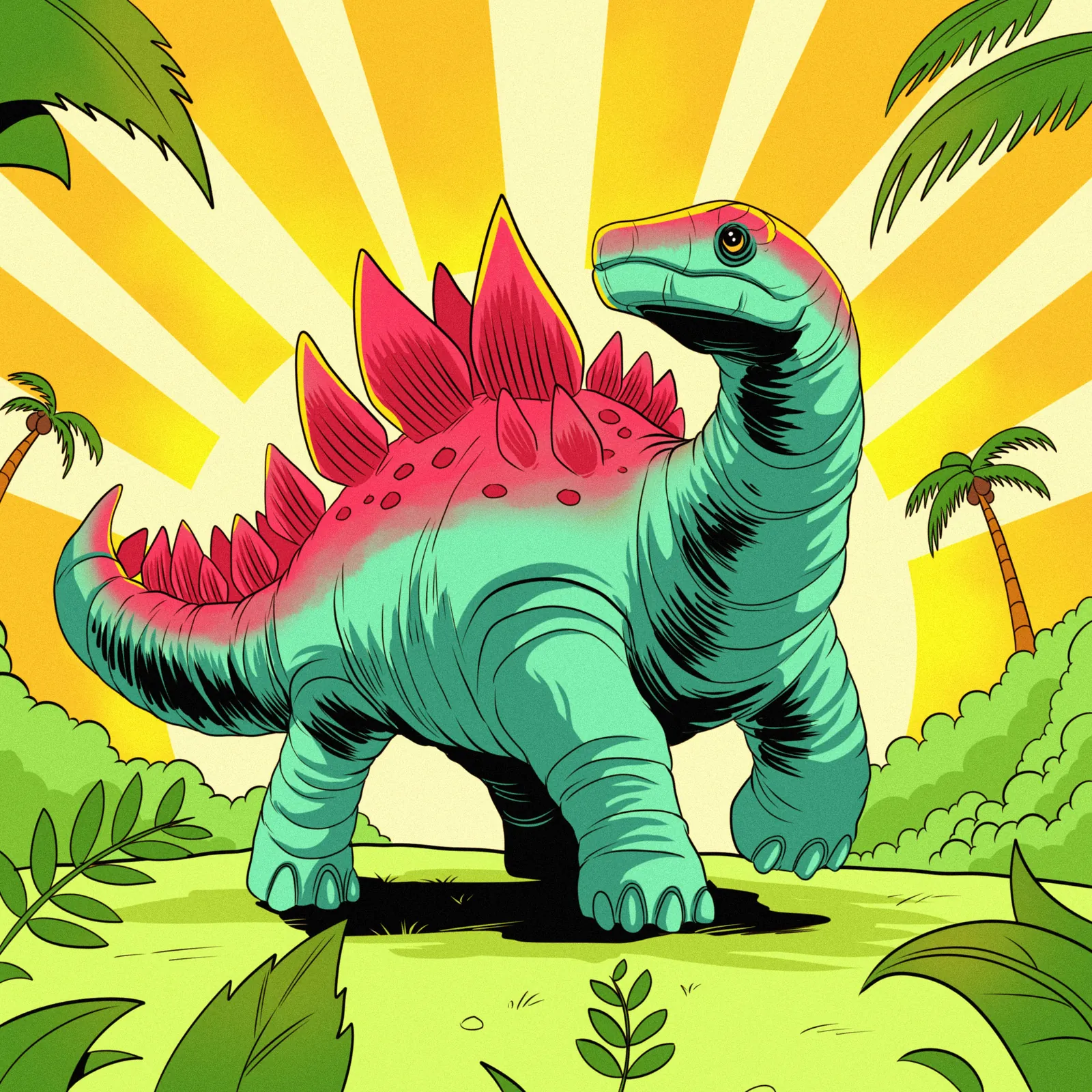 Additionally, thick black outlines define every element from the teal-green body to the palm tree silhouettes. The tropical foliage bushes anchor the composition in saturated greens against the warm backdrop. Flat color fills with hatched shading create a vintage pop-art aesthetic, moreover.