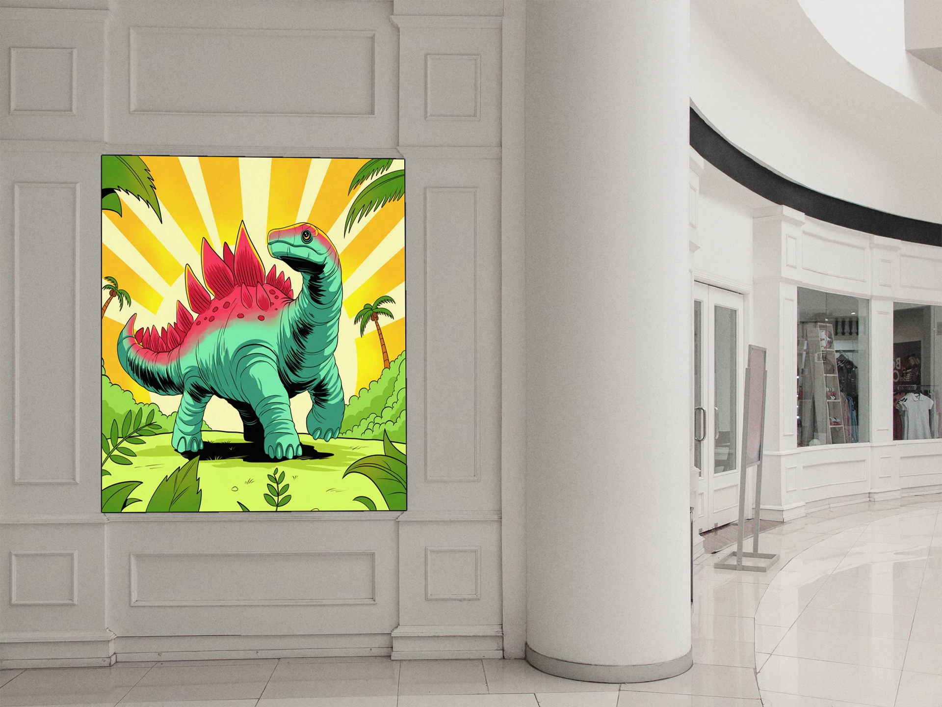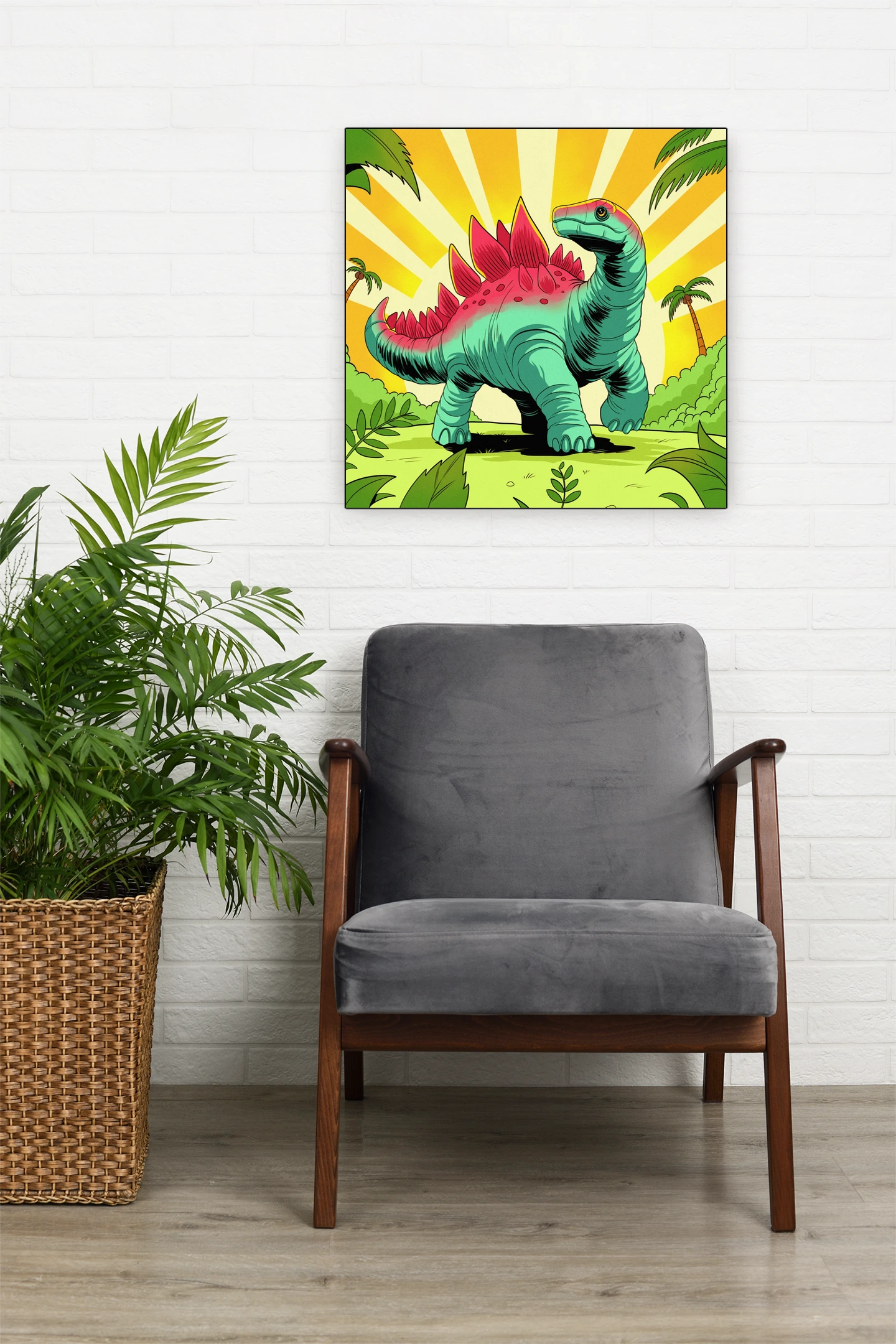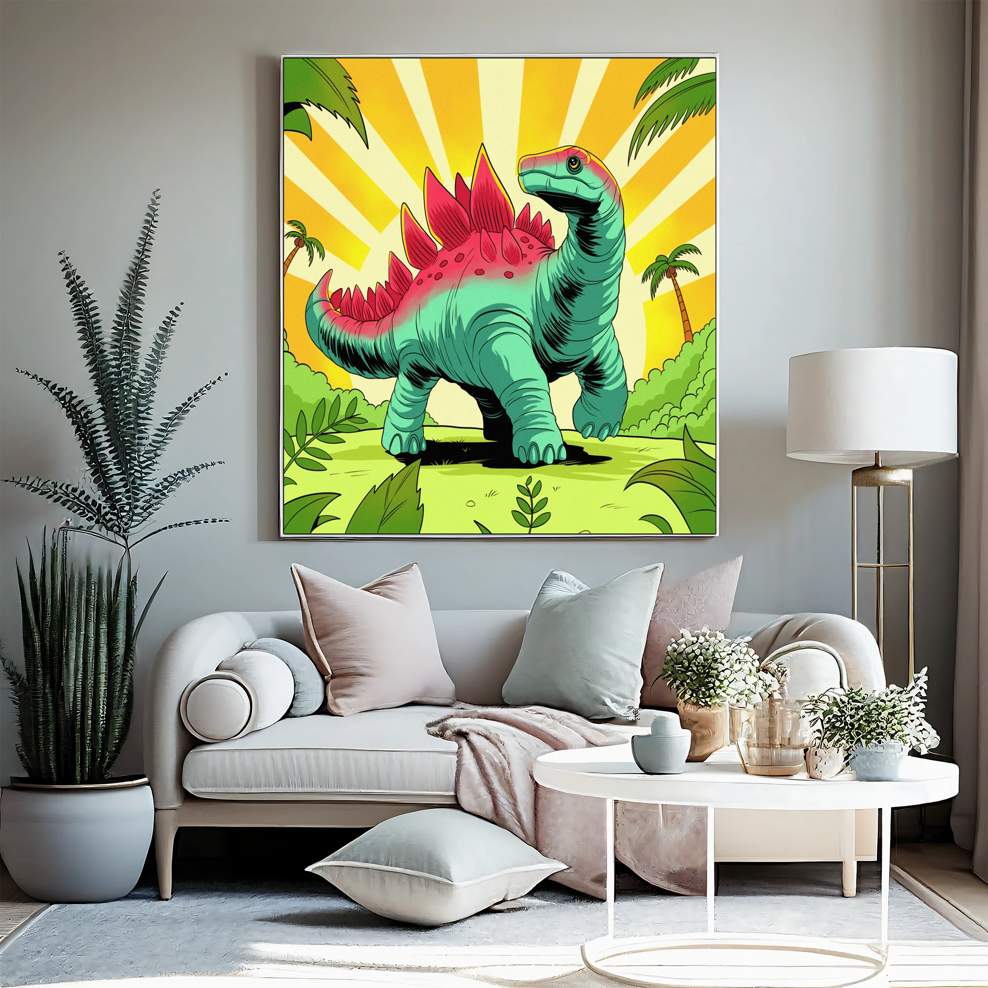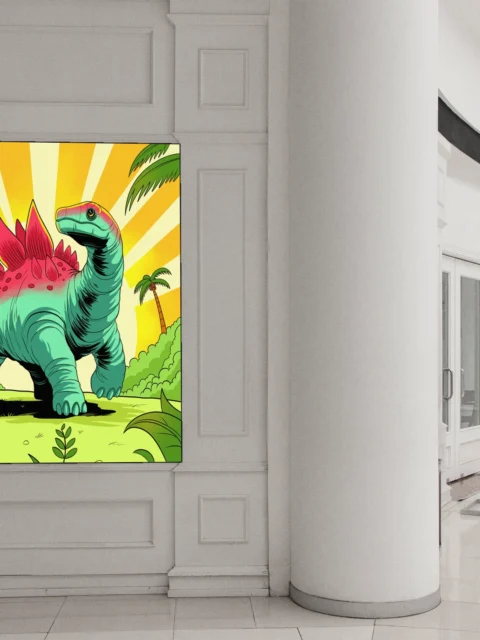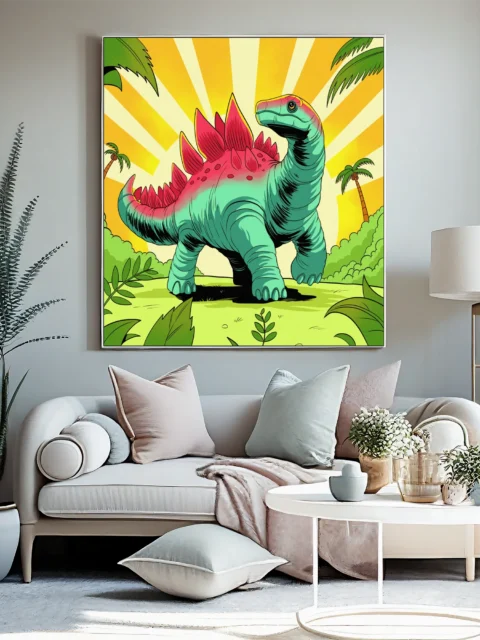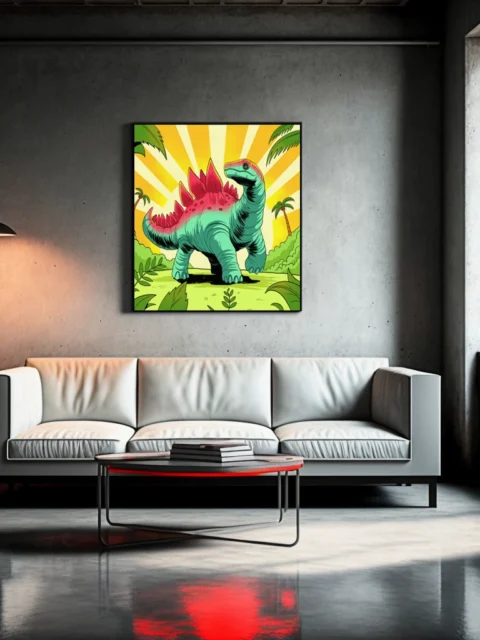Game rooms gain immediate personality from the retro palette and friendly dinosaur subject. Additionally, creative studios benefit from the nostalgic cartoon style and bold graphic composition.