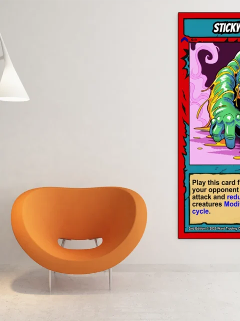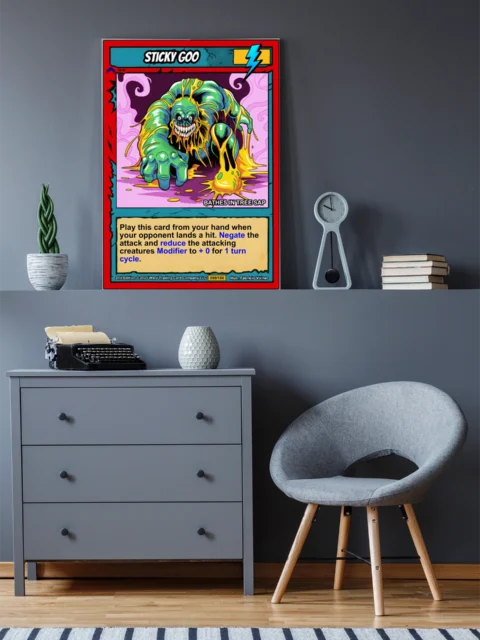 This piece works in game rooms where playful horror and retro trading card aesthetics dominate. Additionally, it fits collections focused on creature-based card art.