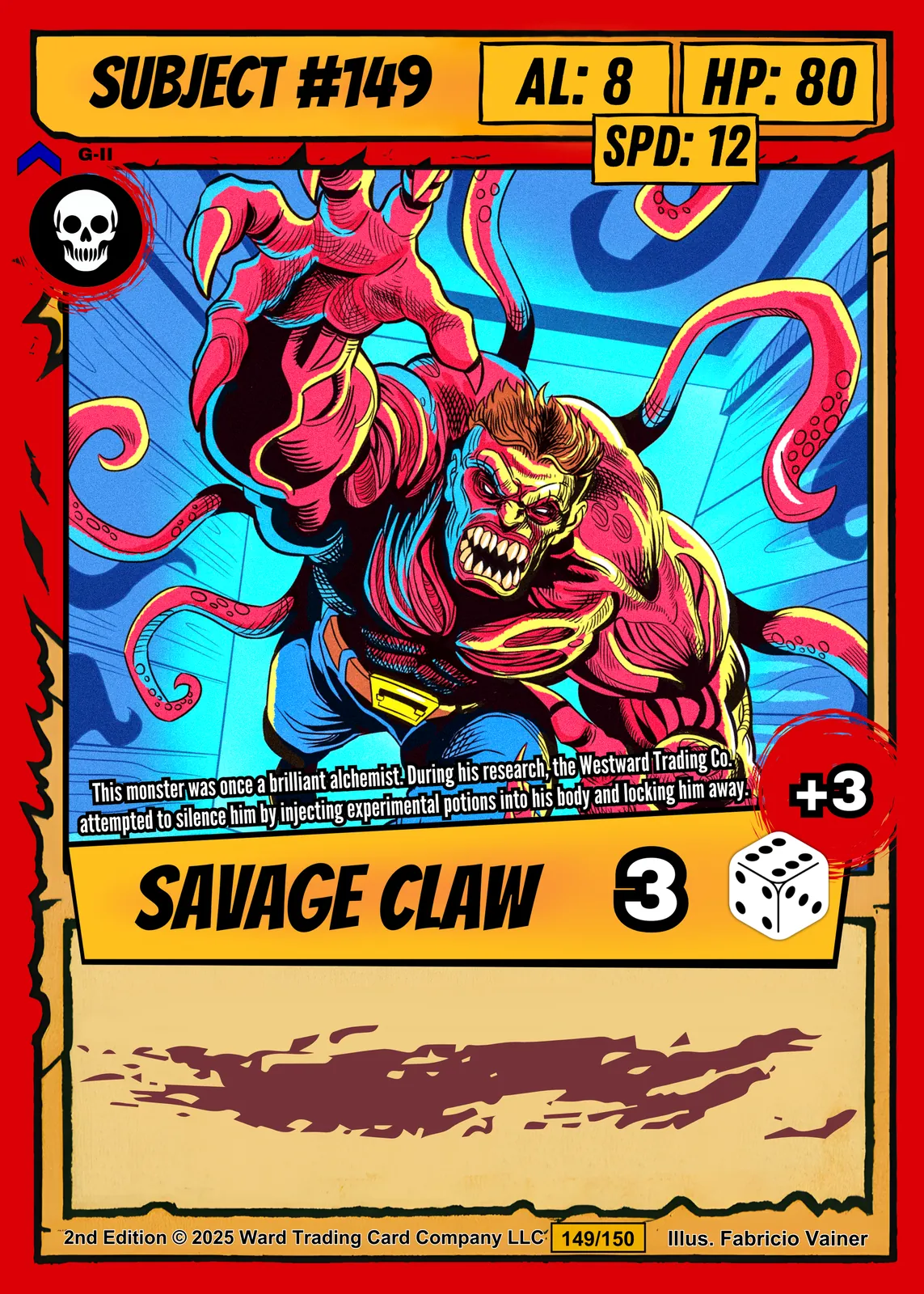 Additionally, the bold red border uses distressed edges for a worn look. Yellow-orange header boxes display stats: AL: 8, HP: 80, SPD: 12. A black banner at bottom shows the Savage Claw ability with a damage value of 3.