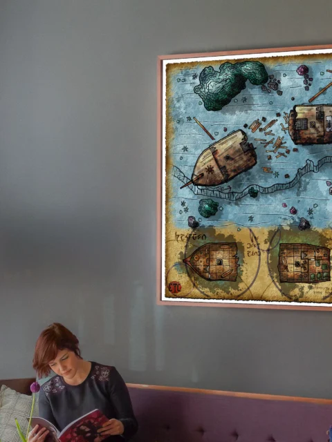 A dungeon master planning an underwater salvage mission wants the encounter visible between sessions. The buyer runs nautical campaigns where shipwrecks matter and reference tools belong in sight. This sunken ship fantasy battle map canvas print particularly serves tables where ocean adventures define the campaign arc.