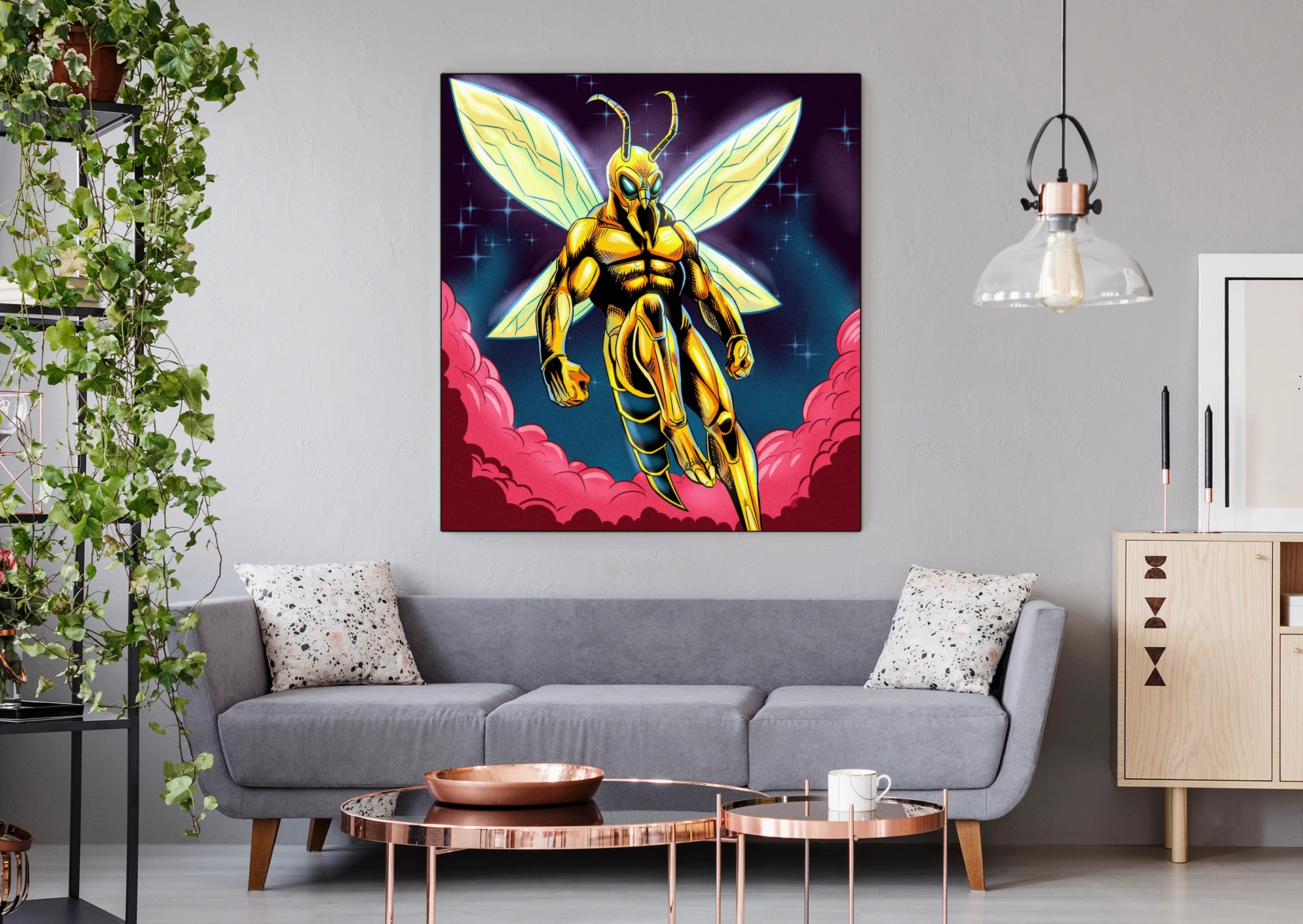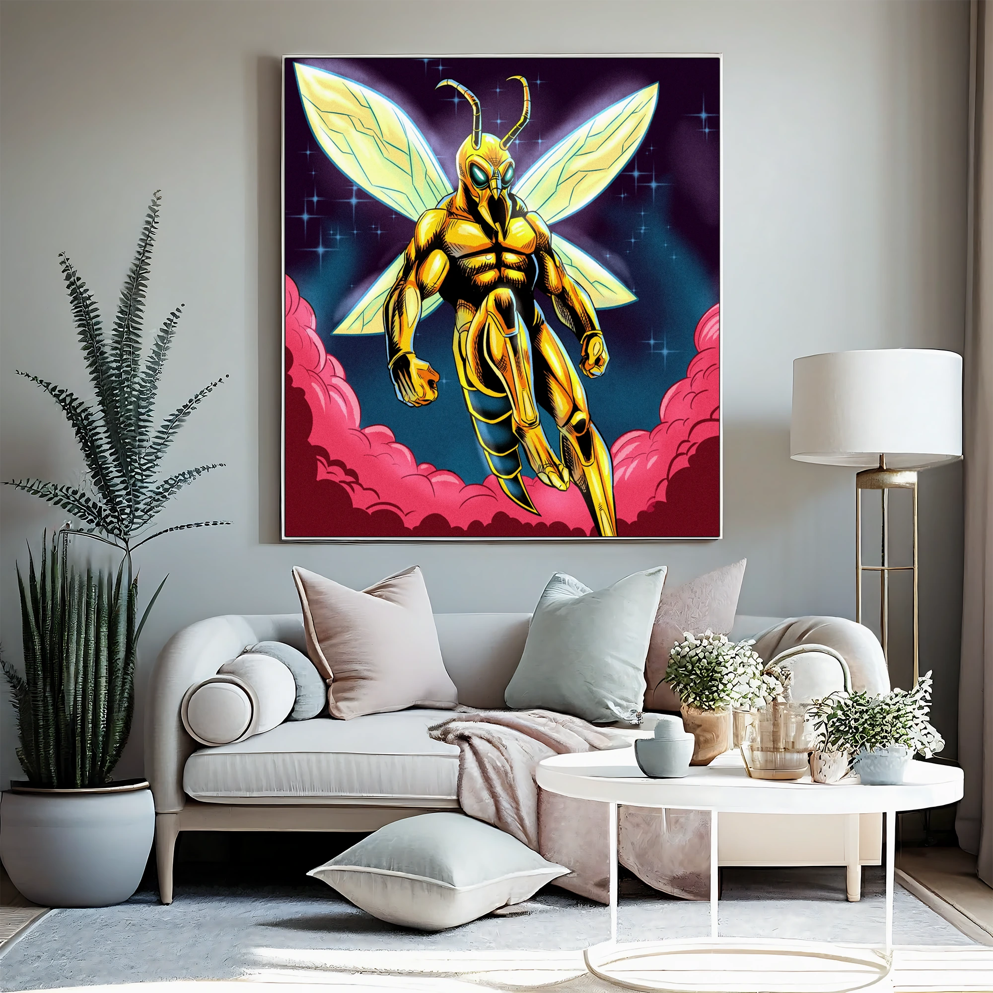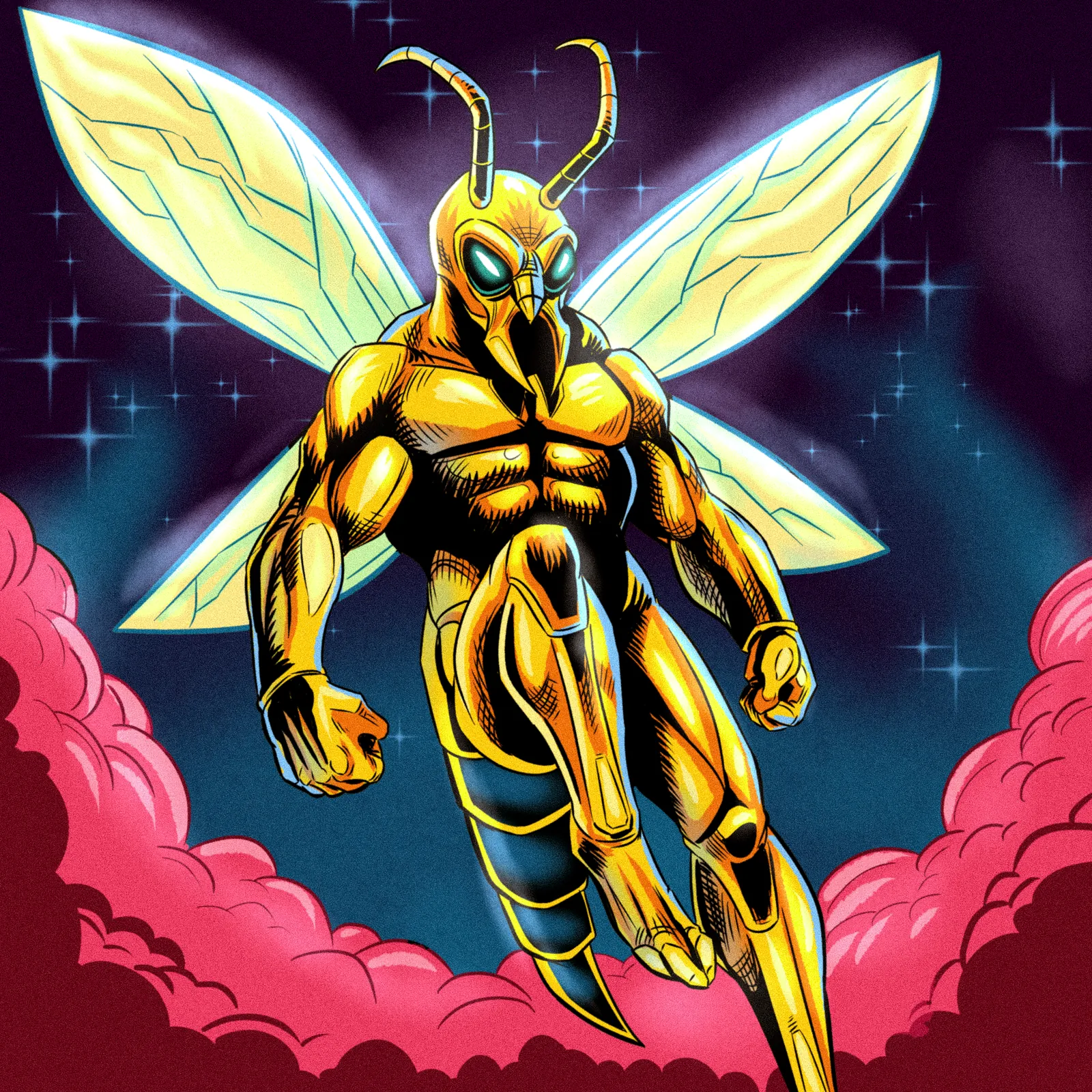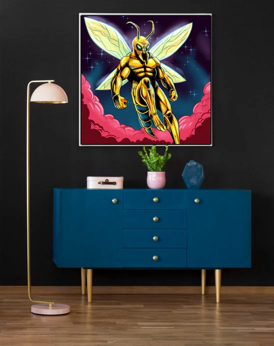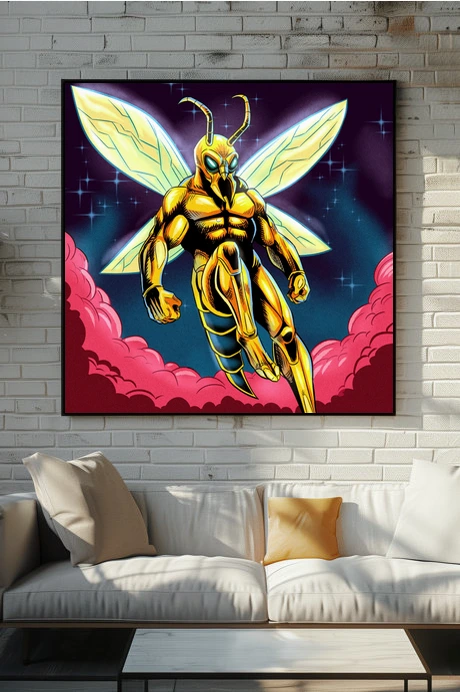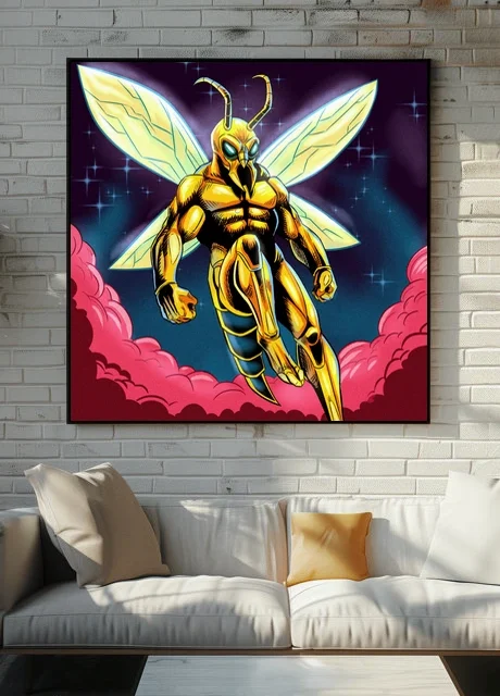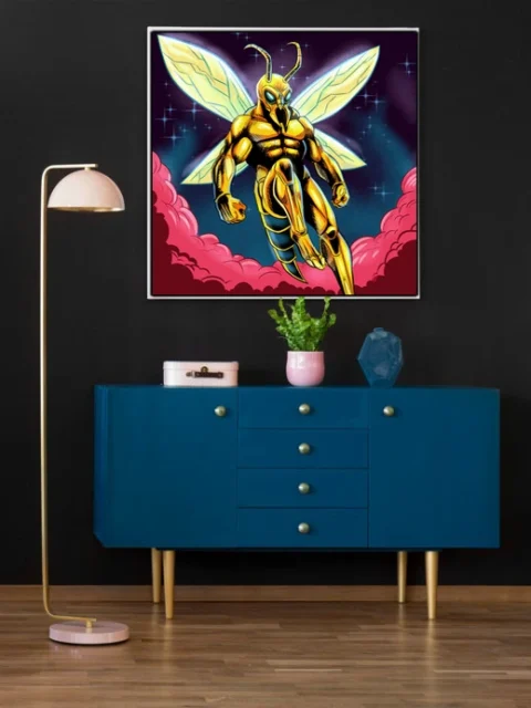 A humanoid wasp warrior floats in heroic pose against cosmic darkness. This super hornet2 art trading card art canvas print captures Fabricio Vainer’s illustration at full scale. Notably, the golden-yellow exoskeleton armor features bold black cross-hatching for texture.