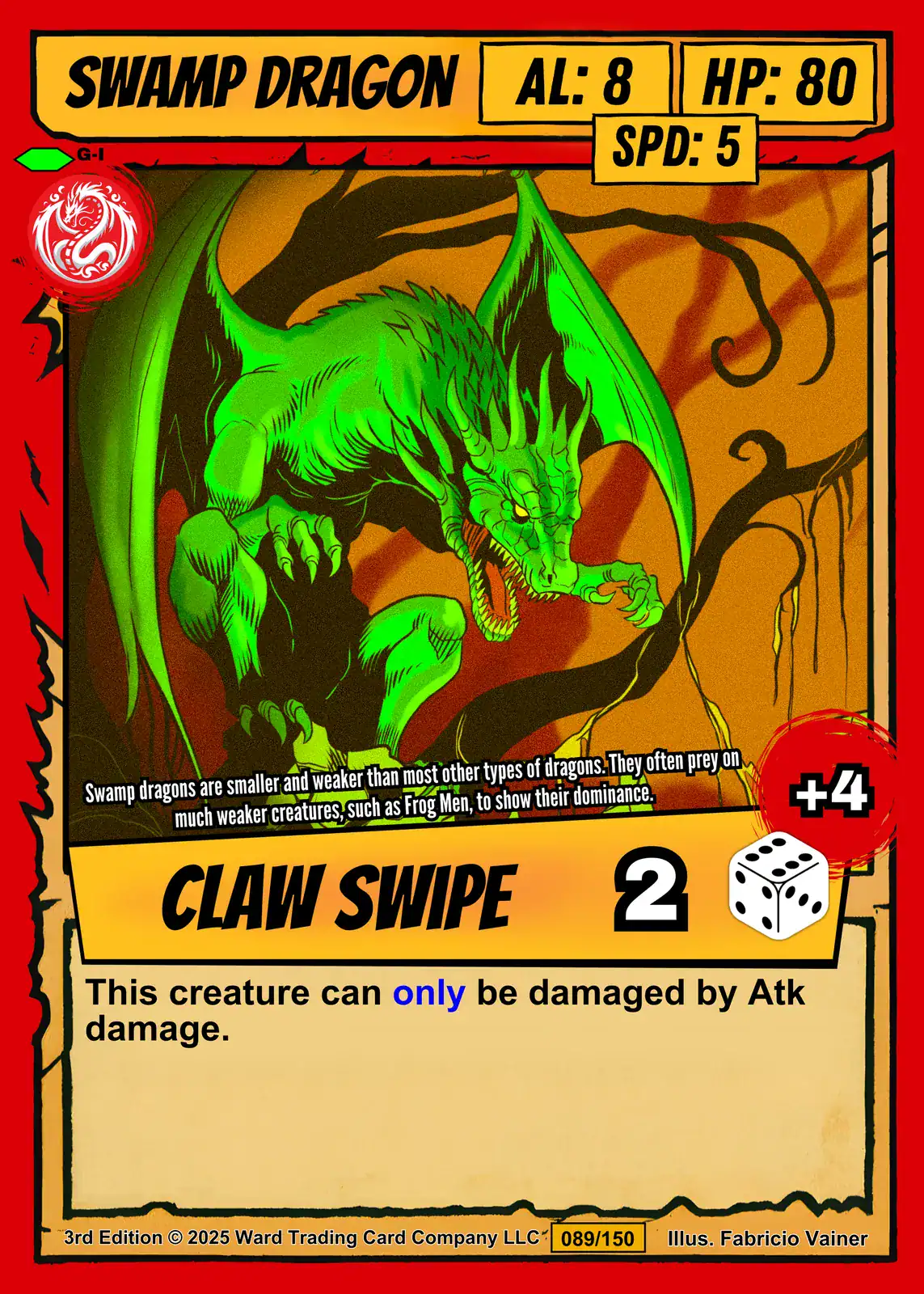 A bright green dragon lunges forward with massive wings spread and claws extended. This swamp dragon trading card canvas print captures Fabricio Vainer’s bold comic book illustration. The creature’s mouth opens wide, revealing sharp teeth against vibrant yellow-orange backgrounds.