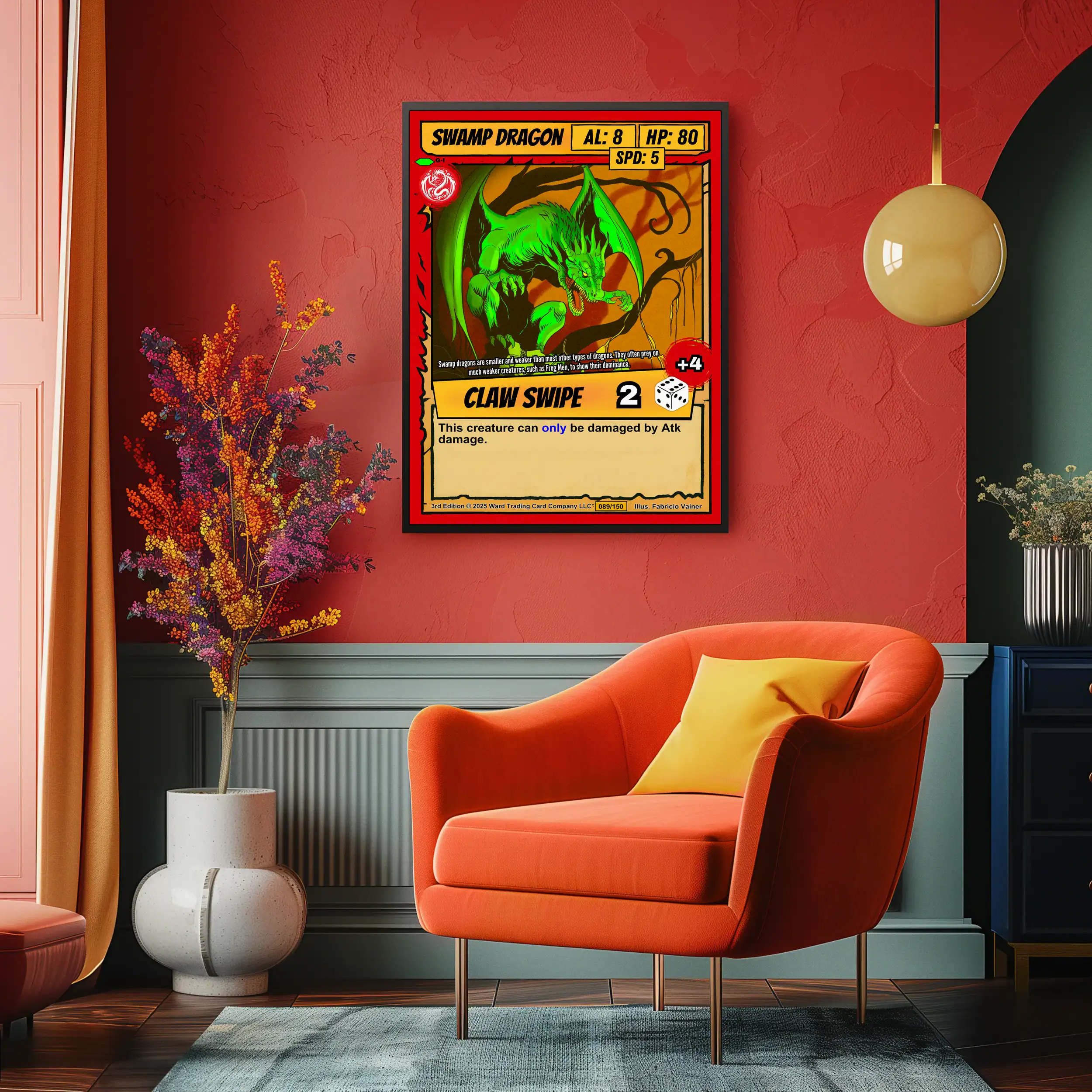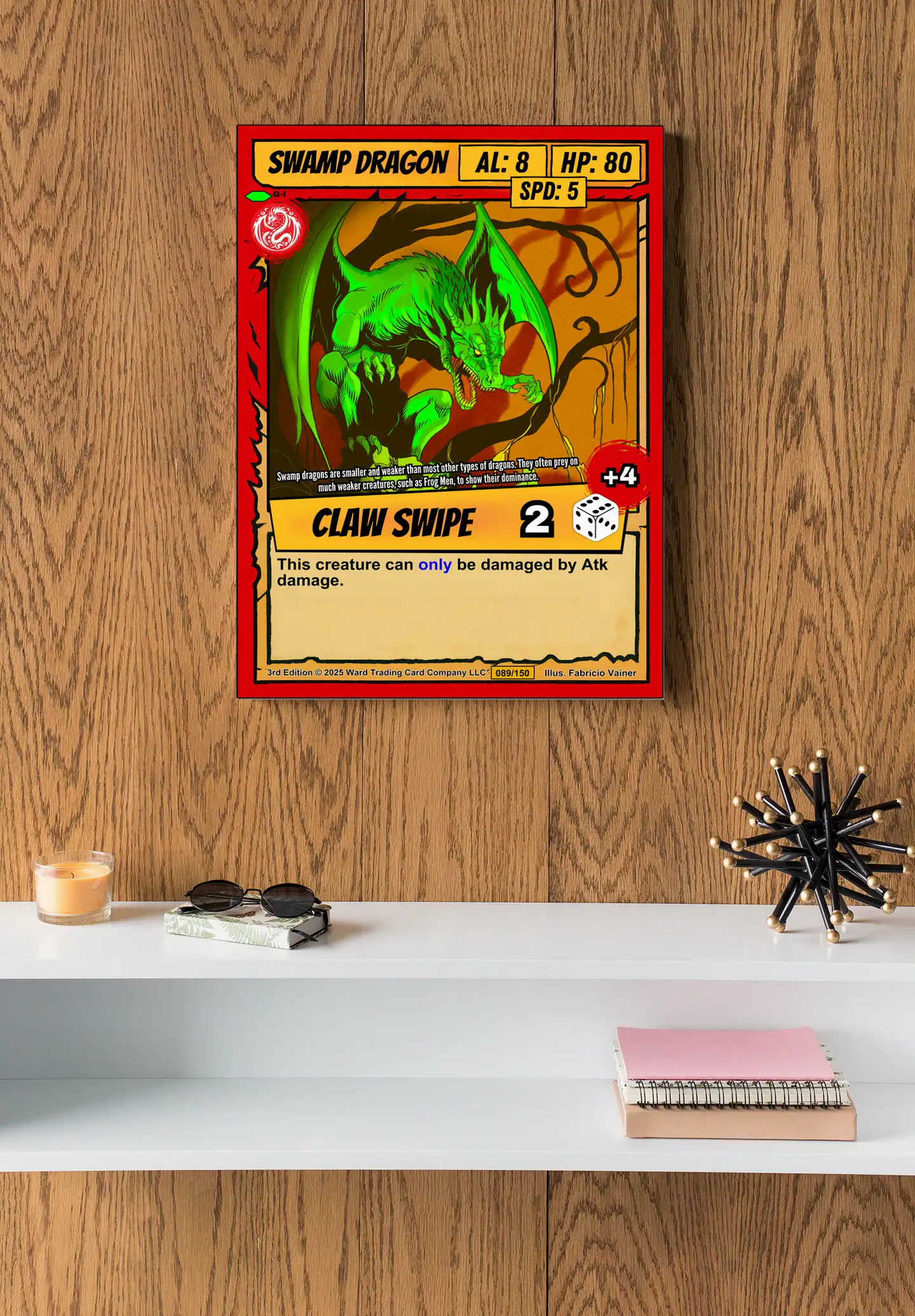 Above a bookshelf in a reading room, the dragon’s aggressive stance commands attention. Moreover, the card format preserves every game detail at readable scale.