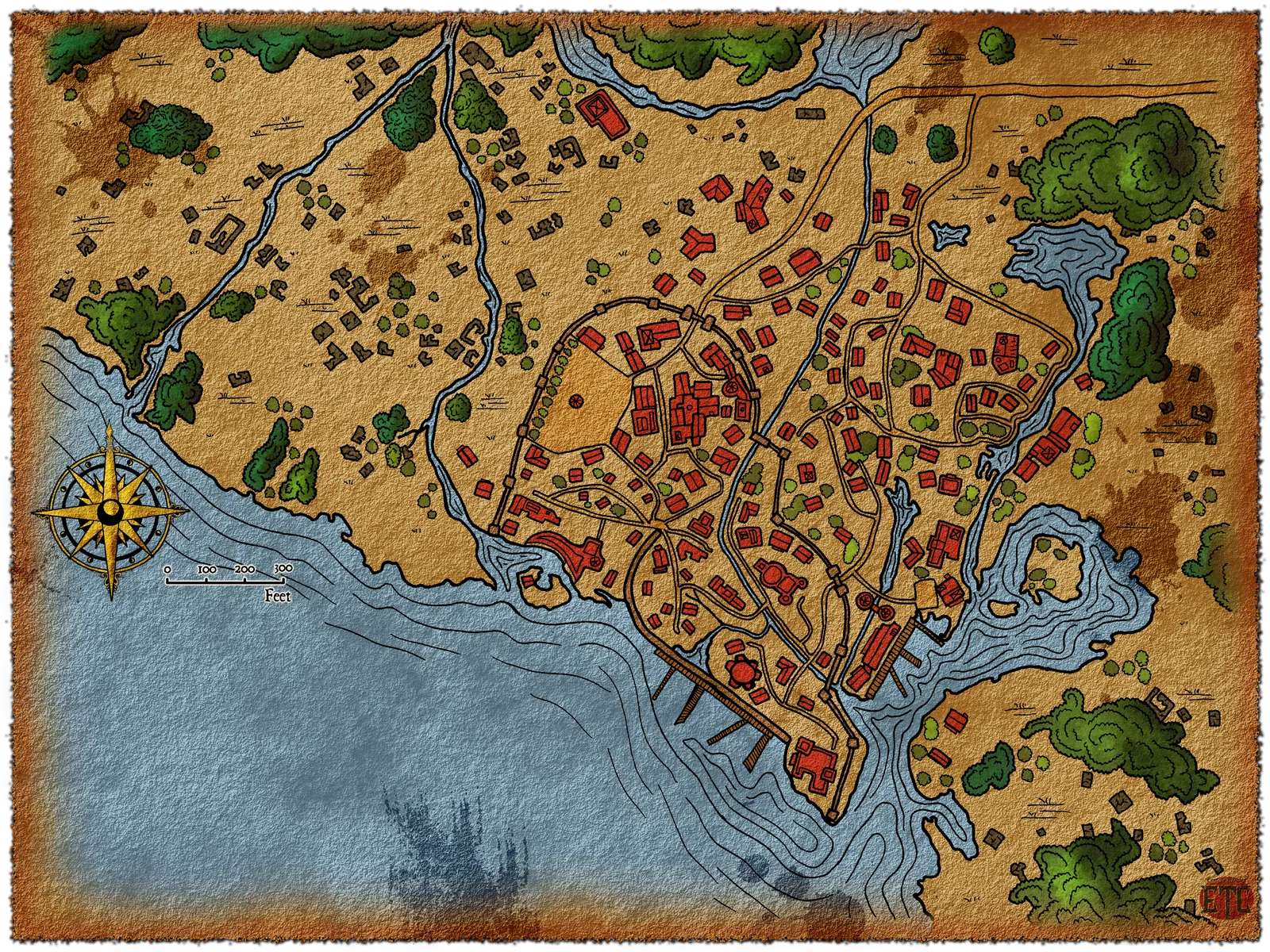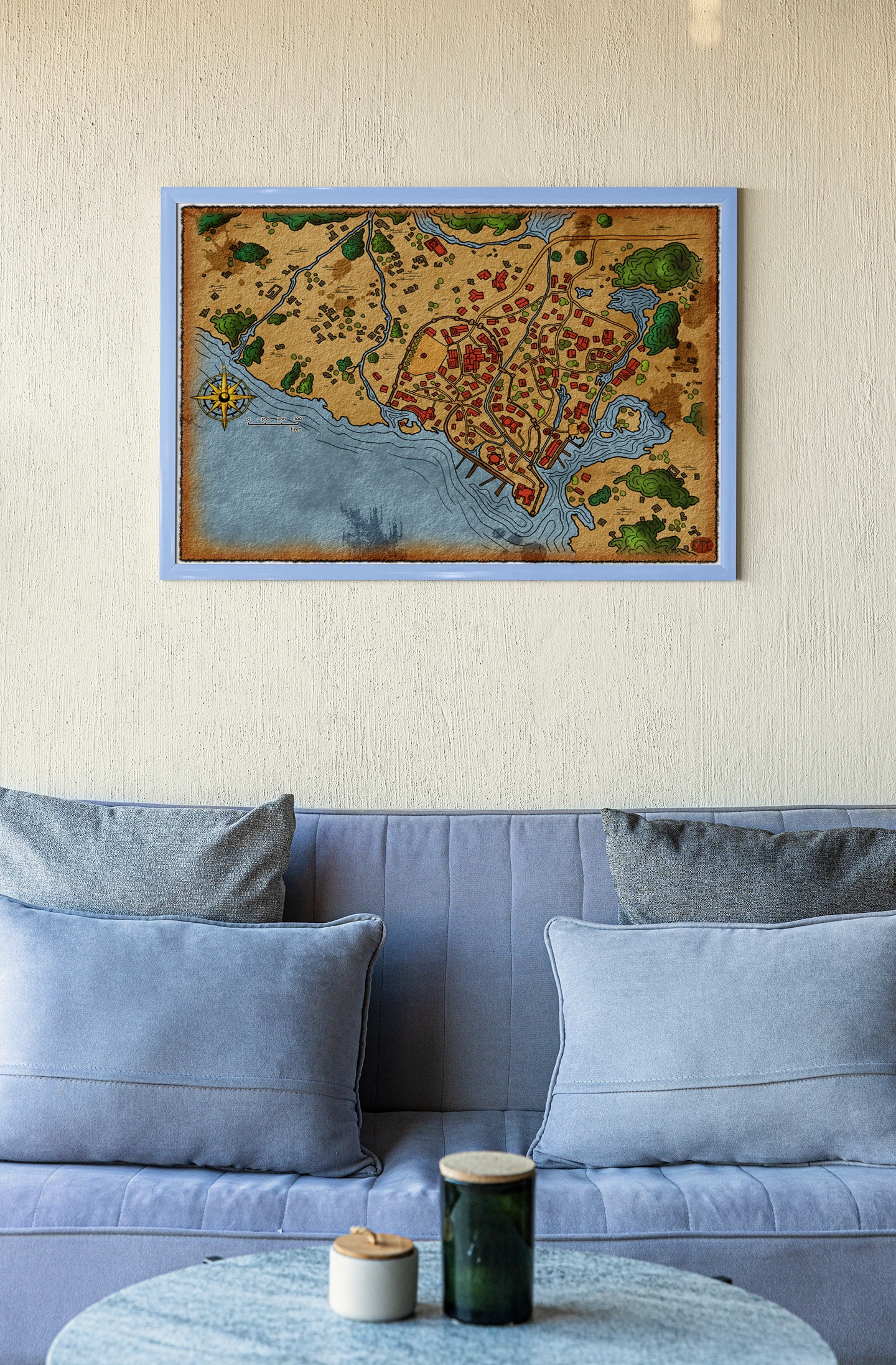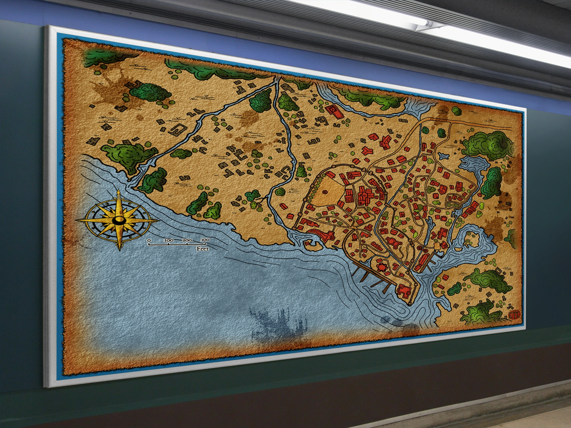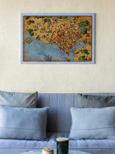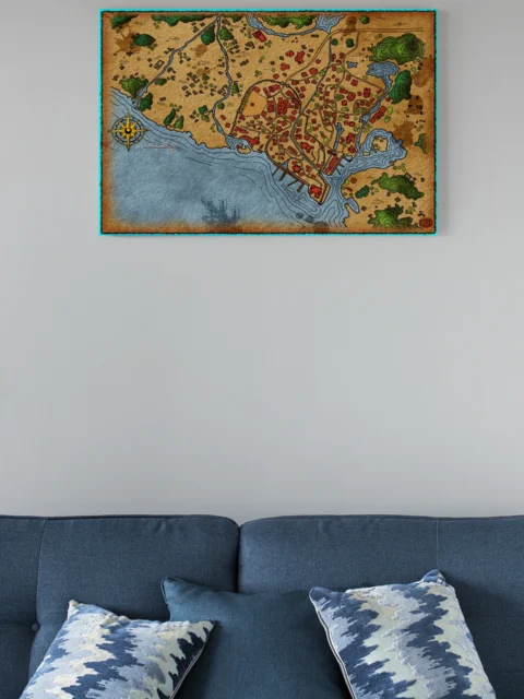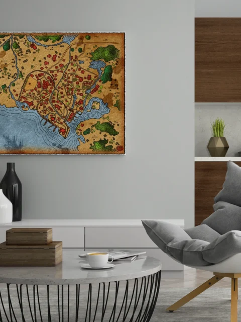A study or library where worldbuilding happens benefits from visual references that inform session prep. The canal layout supports encounter design, especially for campaigns centered on waterborne trade or wetland exploration.