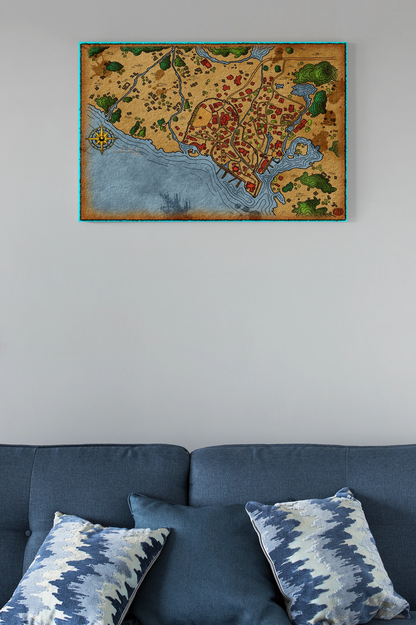 Dungeon masters running coastal campaigns need encounter sites where water routes matter as much as streets. This map serves players who build sessions around port intrigue, smuggling runs, and amphibious encounters. The swamp settlement fantasy battle map canvas print gives DMs a tactical reference. Particularly for tracking movement through canal districts.