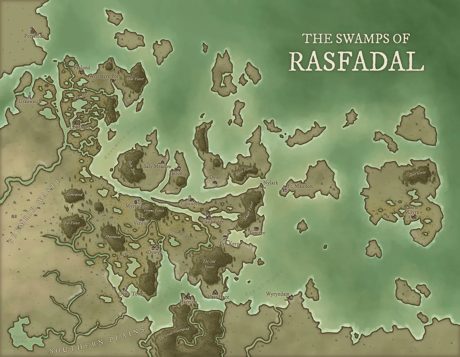 The Swamps of Rasfadal fantasy map presents a sprawling wetland region shaped by flooded lowlands, winding waterways, and scattered islands. Marsh channels, coastal inlets, and swamp forests dominate the terrain. As a result, the region immediately conveys danger, secrecy, and difficult travel.