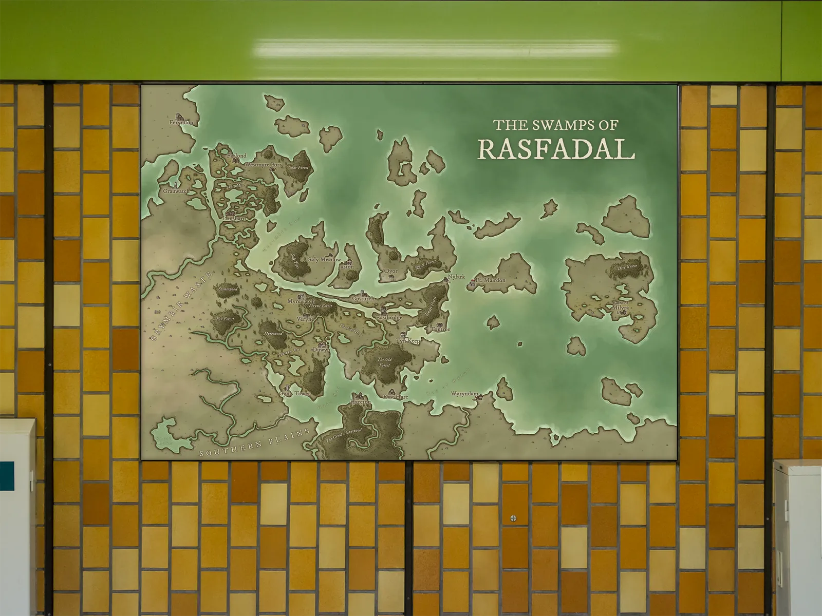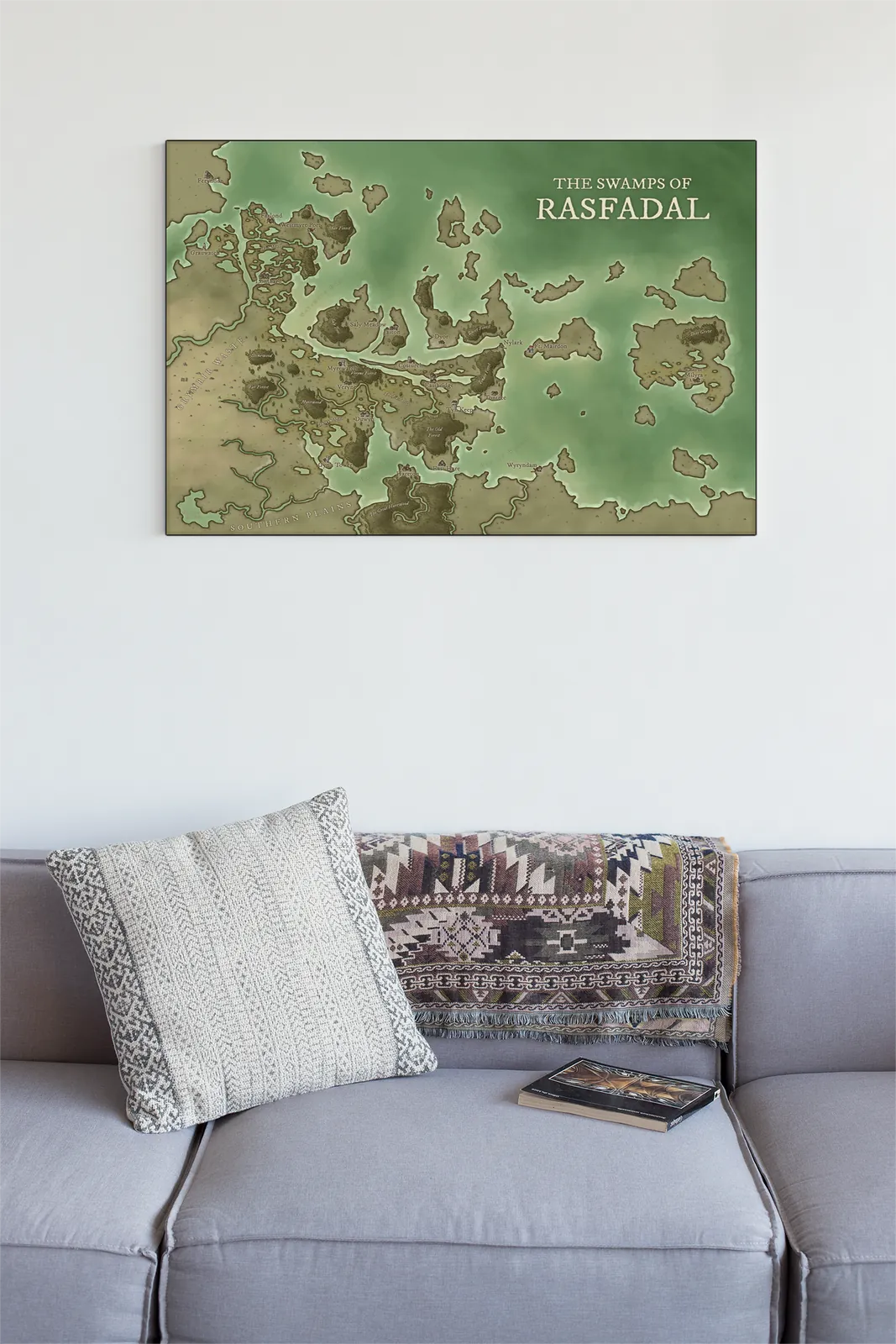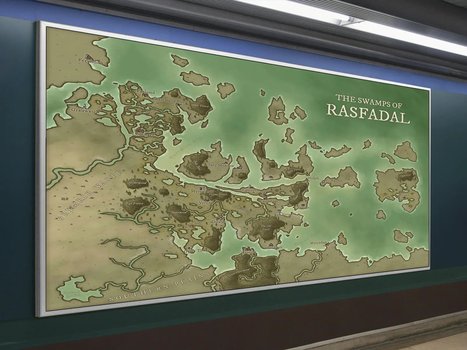 Finally, the Swamps of Rasfadal fantasy map works as both a narrative tool and a clear tabletop reference. Above all, it supports immersive regional storytelling. Therefore, the layout remains readable for repeated campaign use or long-term display.