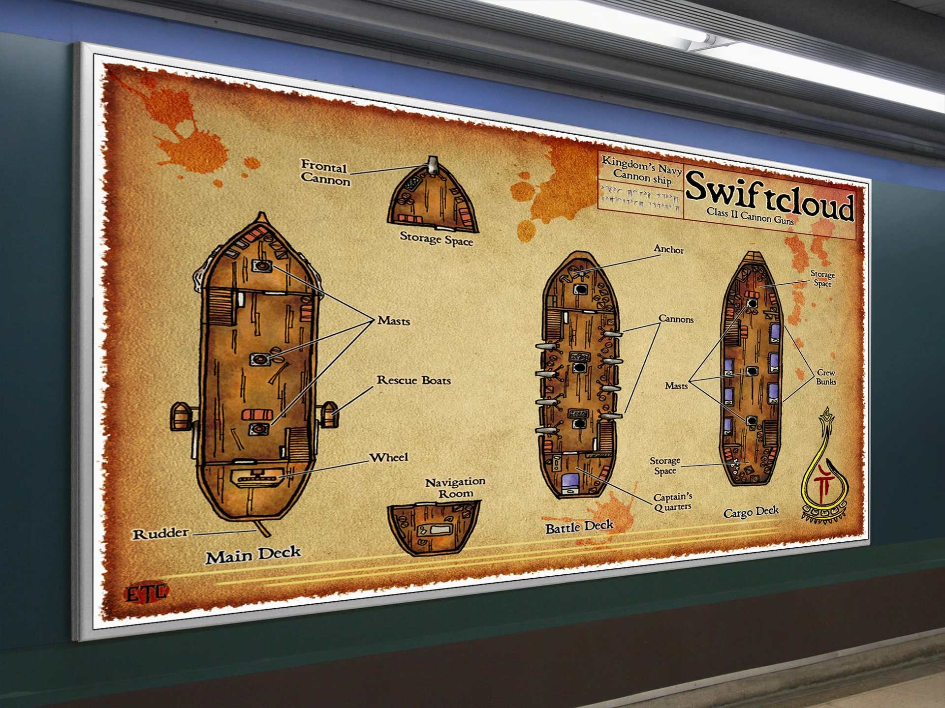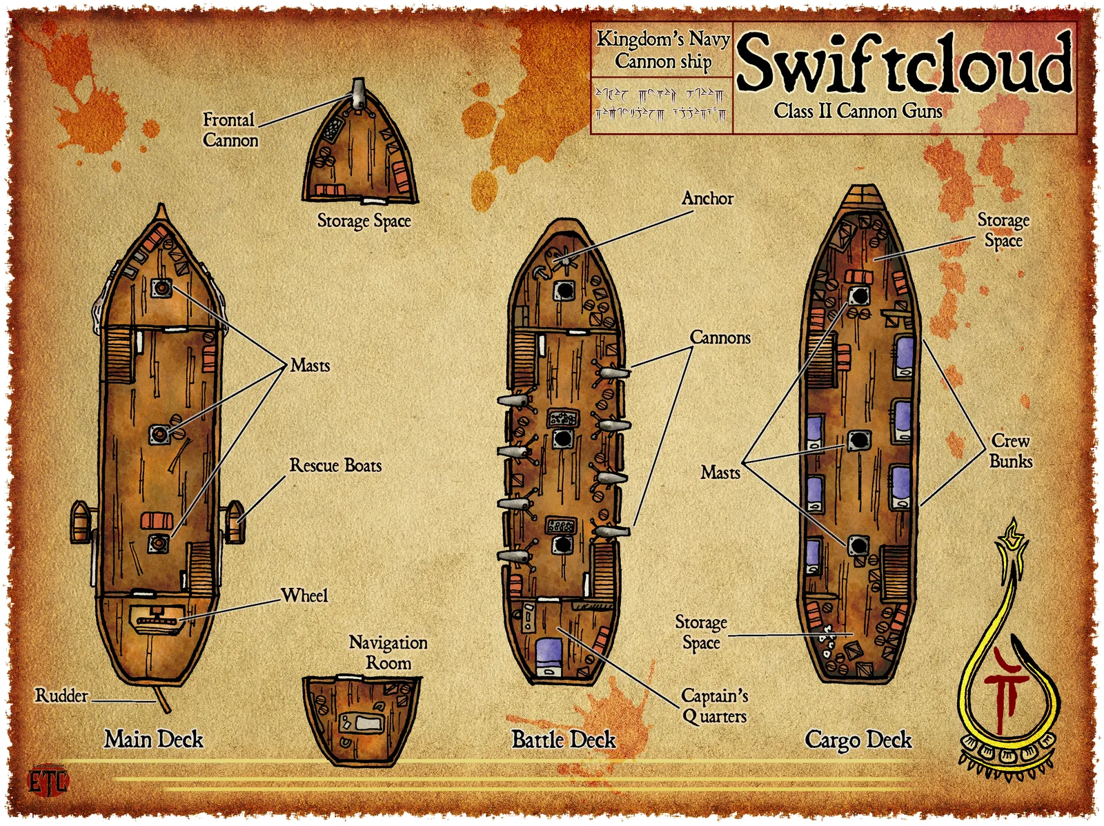 A Class II cannon ship schematic spreads across aged parchment with burnt edges. This swiftcloud fantasy battle map canvas print shows four deck views in rust and sepia tones. Notably, gothic lettering labels each section from anchor to rudder with nautical precision.
