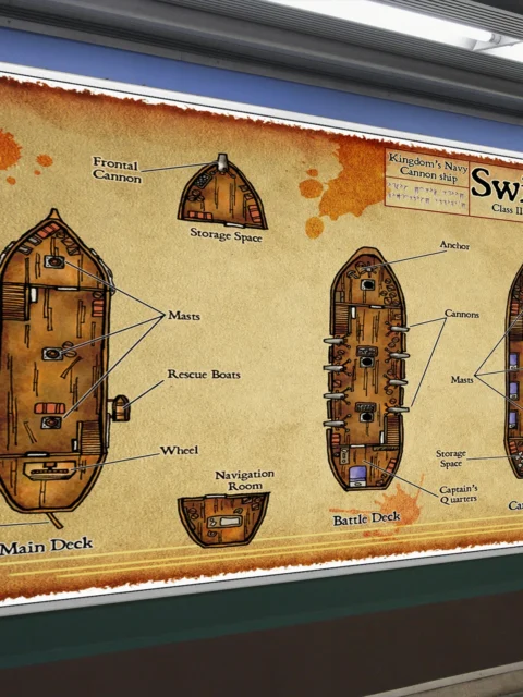 A creative studio or gaming den gains reference material for naval encounters and ship-based adventures. Furthermore, the schematic serves as visual shorthand for cannon placement and crew quarters during session prep.