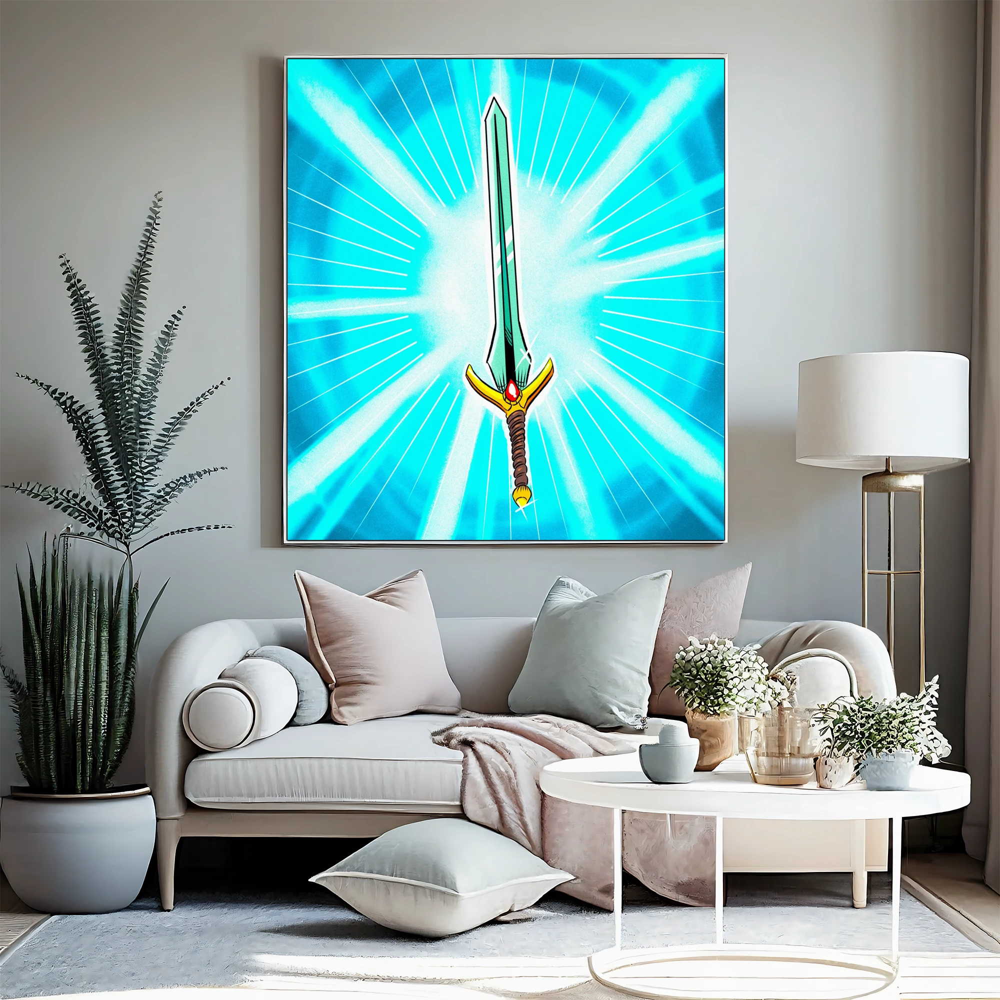Mount this in dedicated gaming spaces where the comic book aesthetic complements TCG collections and tabletop setups. Additionally, the vertical sword composition works particularly well in narrow wall sections between shelves.