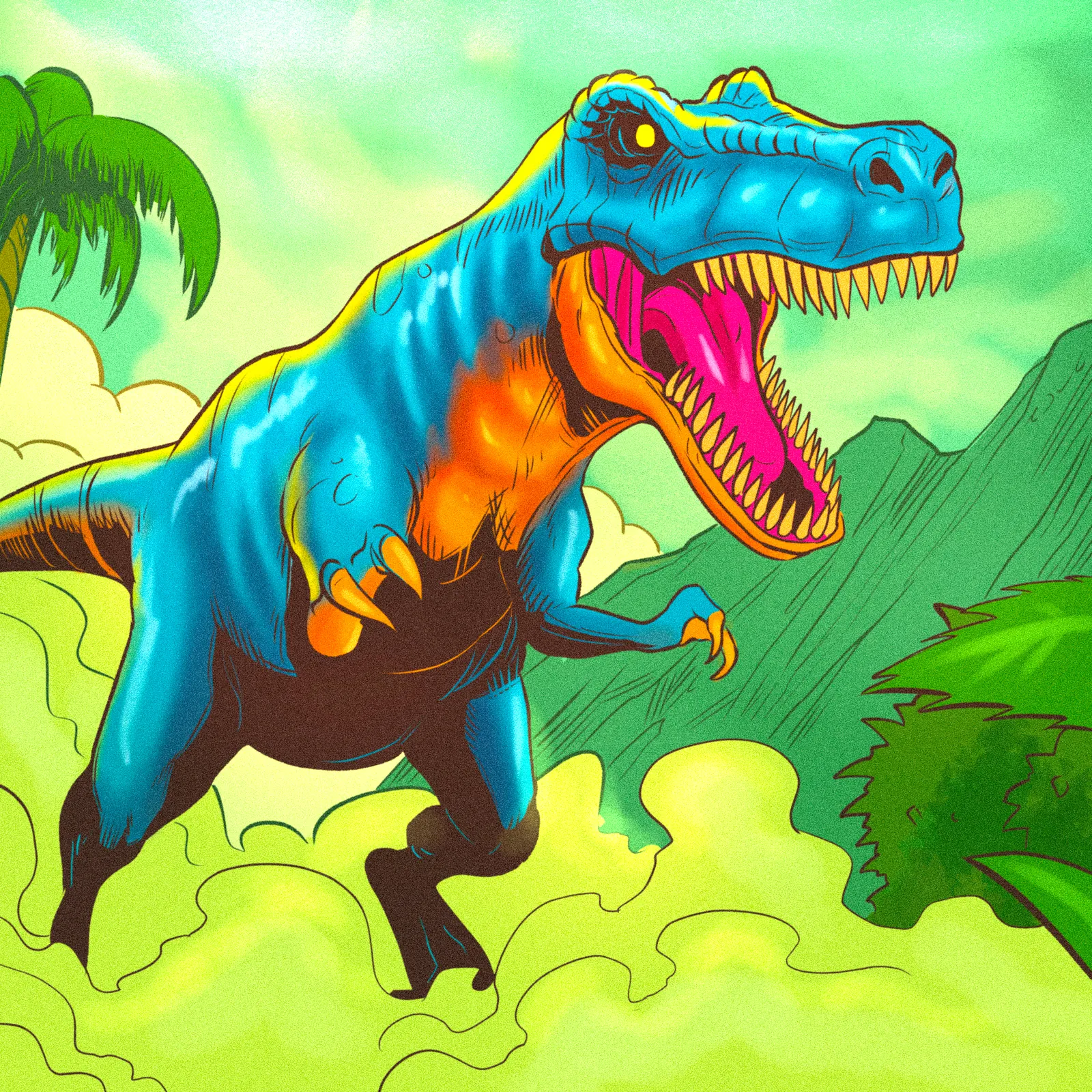 Additionally, the color palette leans into bold primaries—cyan scales against orange-yellow throat markings and underbelly sections. A gradient sky shifts from yellow-green ground dust to cyan overhead, framing the dinosaur’s mid-stride action pose. Moreover, black outlines and high saturation evoke 1980s Saturday morning cartoon aesthetics.