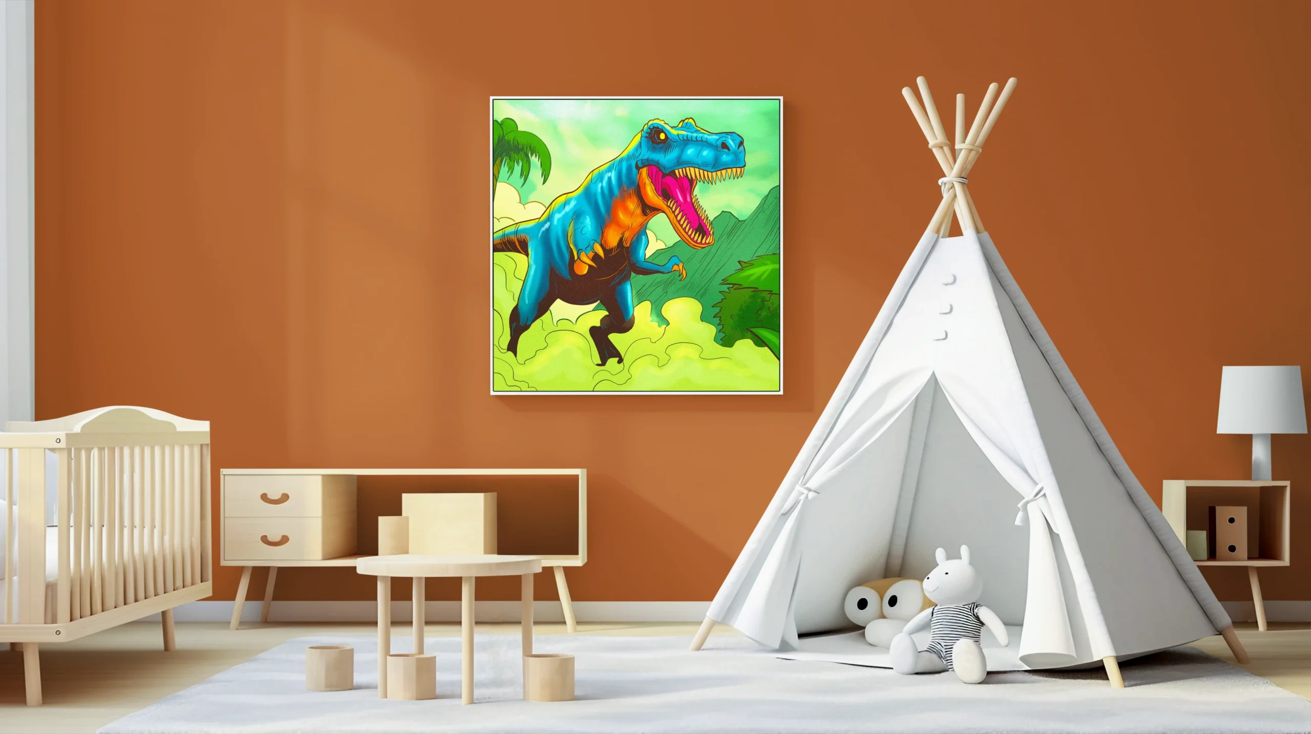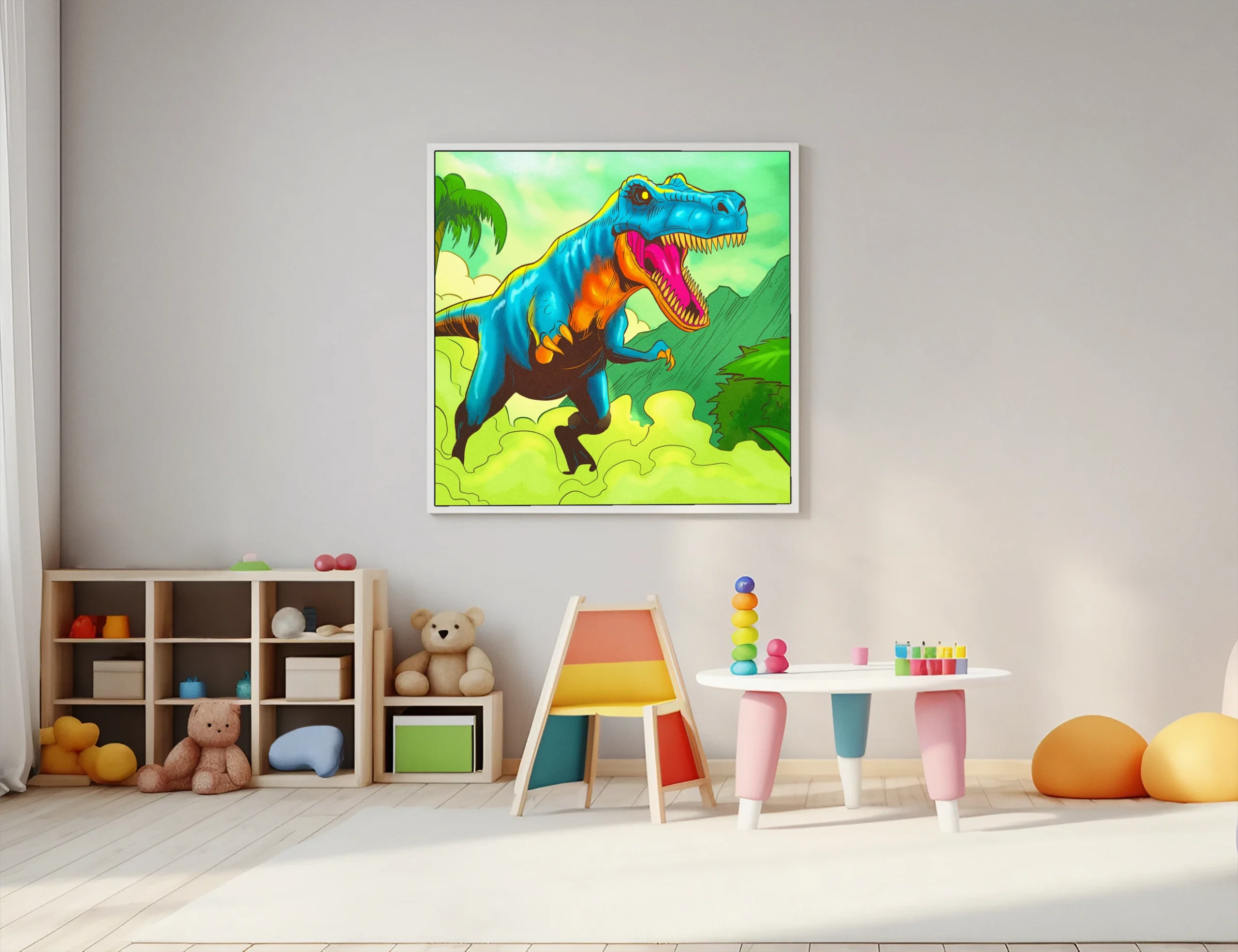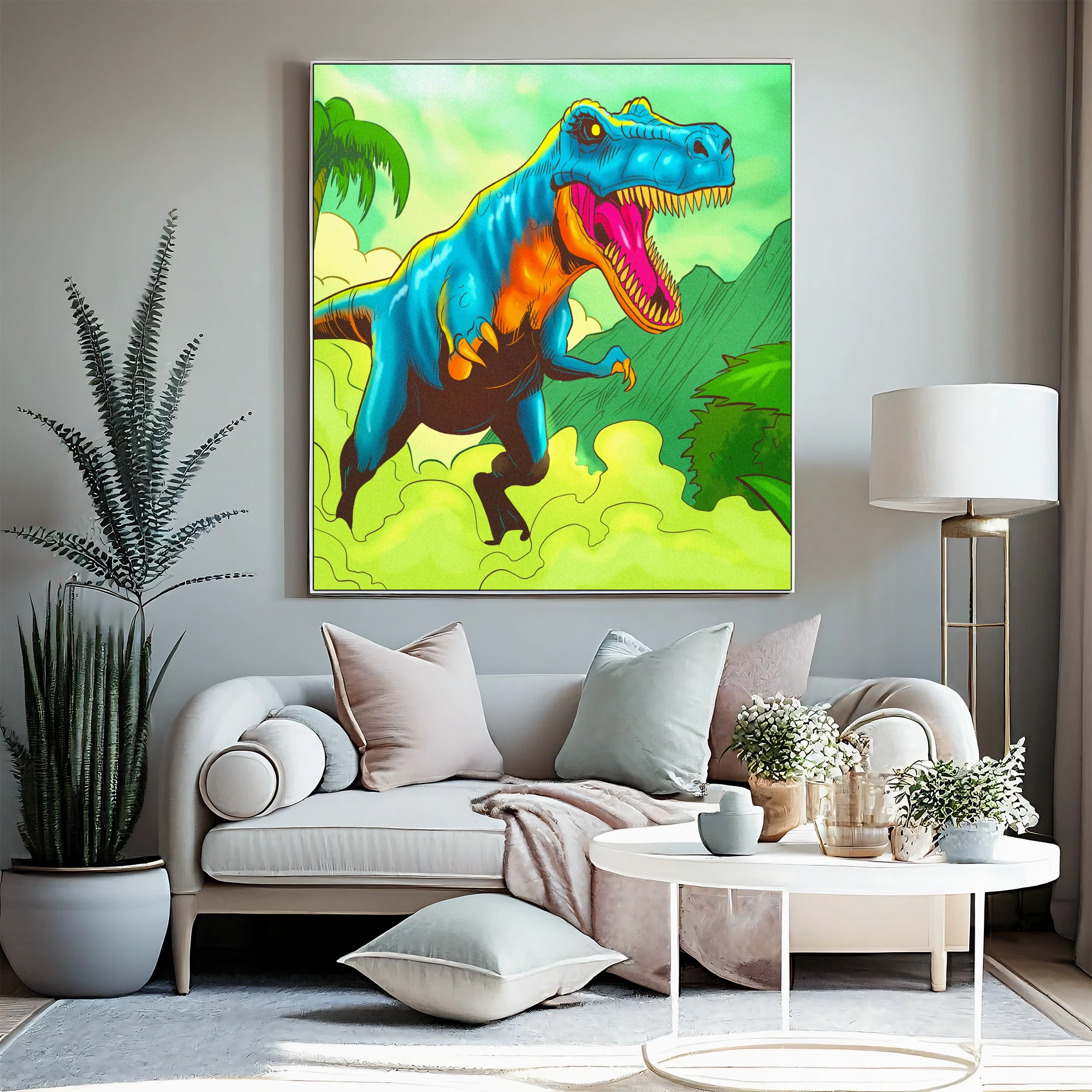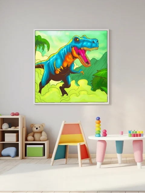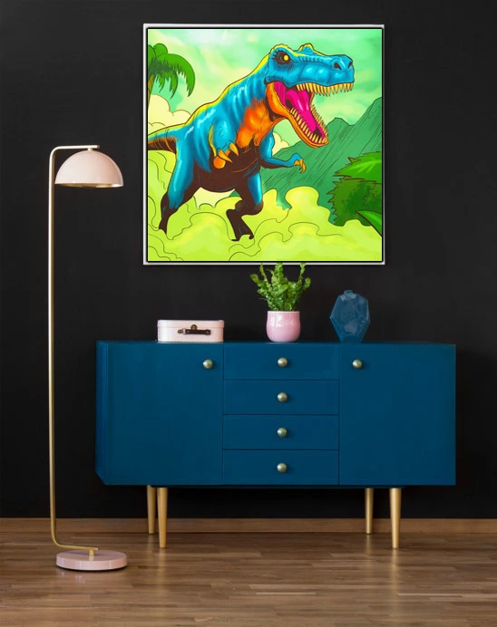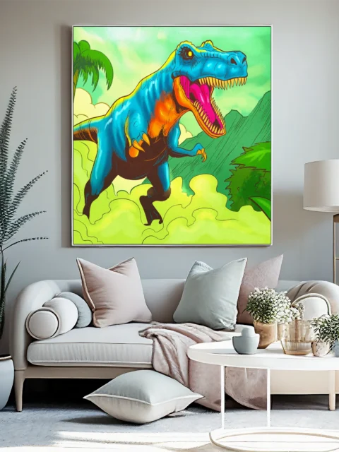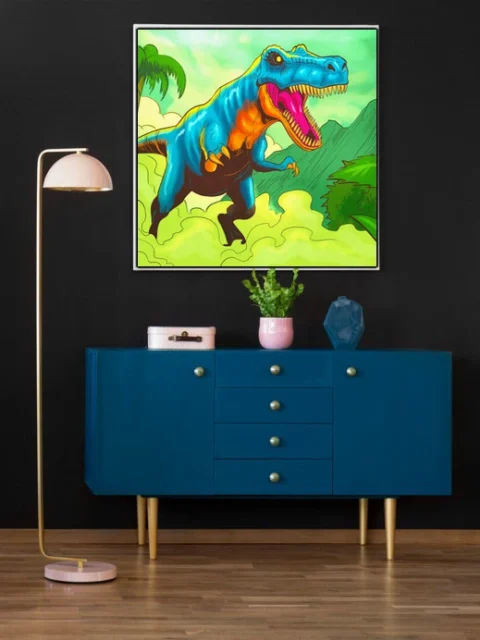 Game rooms and collector galleries benefit from the prehistoric jungle setting and bold creature-focused composition. Additionally, creative studios gain a nostalgic pop-art anchor that reads clearly from across the space.