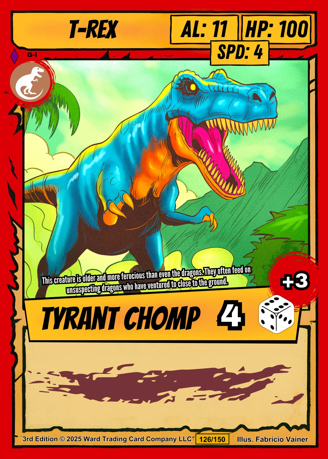 Dedicated display space for tabletop art benefits from Ward TCG’s bold dinosaur presence. Furthermore, the full card format preserves every stat and ability detail.