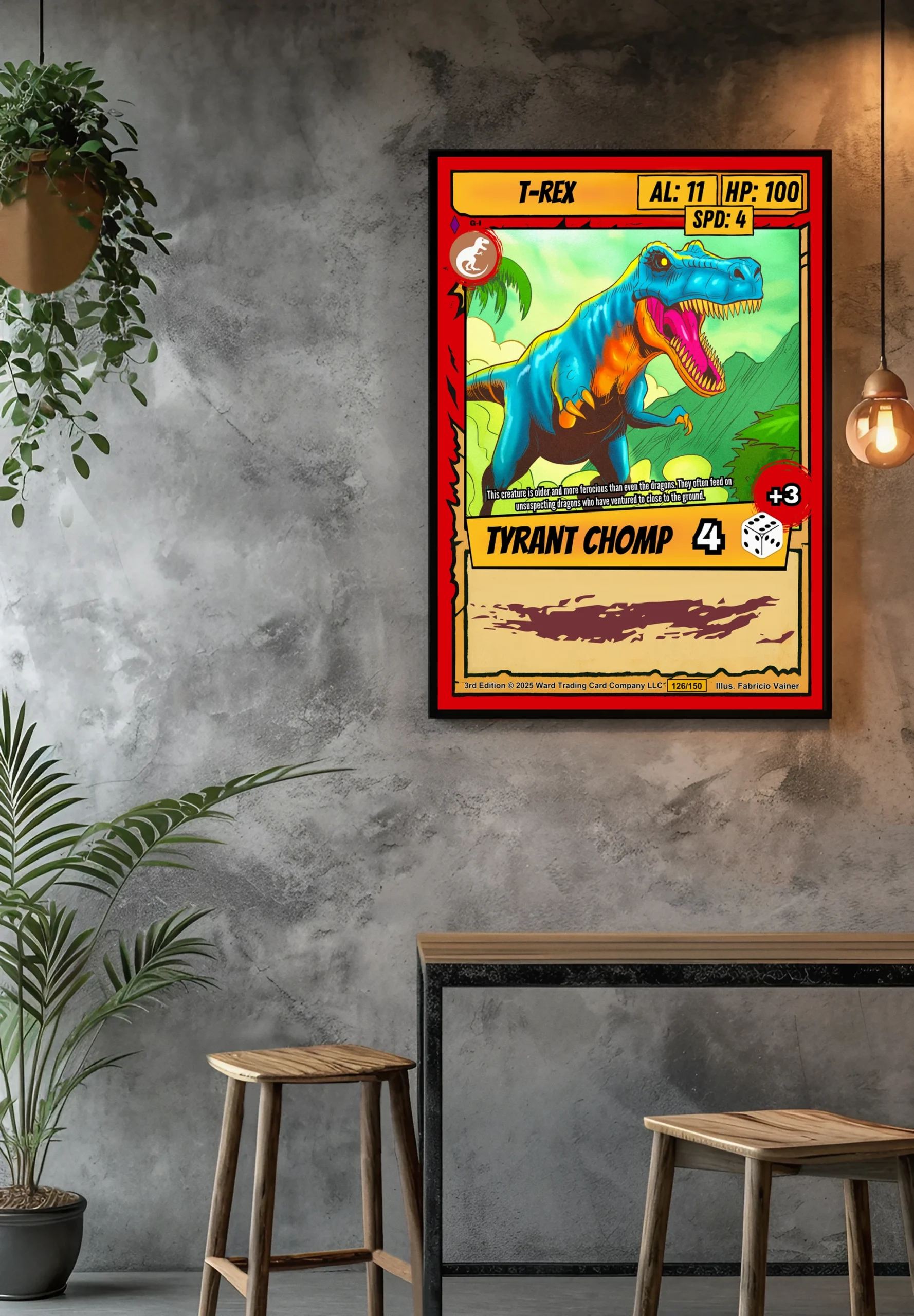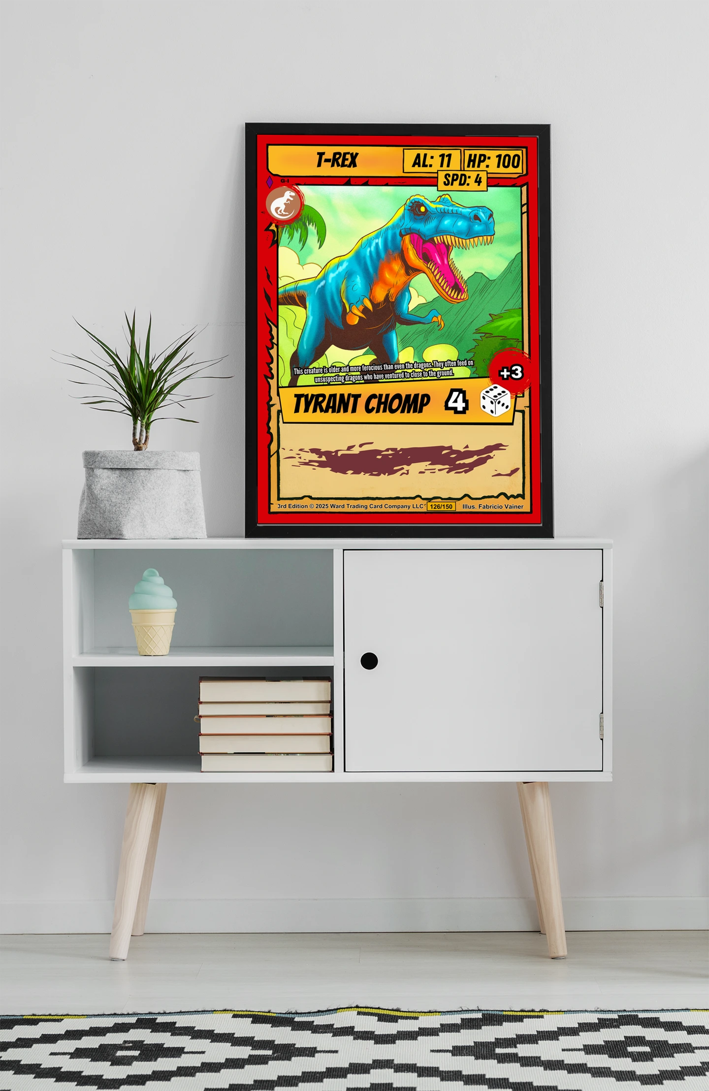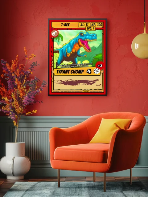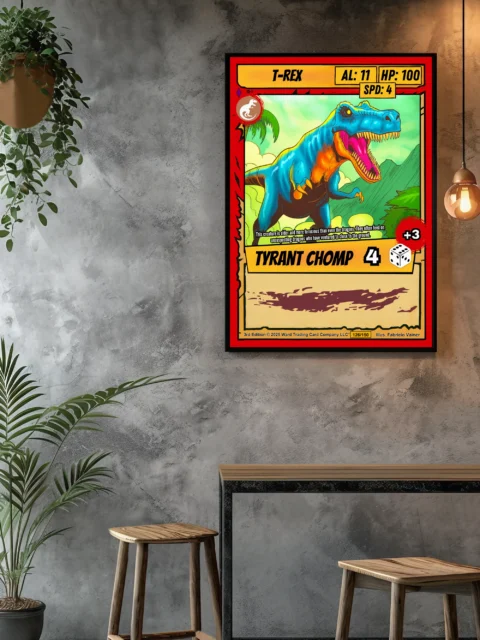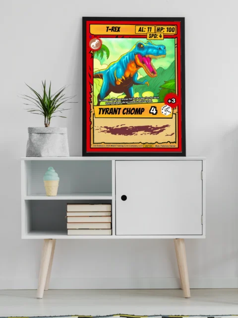 DMs running prehistoric campaigns need this apex predator watching over their table. TCG collectors recognize authentic card art that honors the hobby’s golden age. Particularly, this t rex trading card canvas print commands respect from any gaming space.
