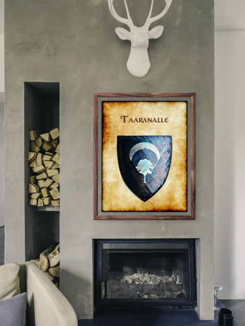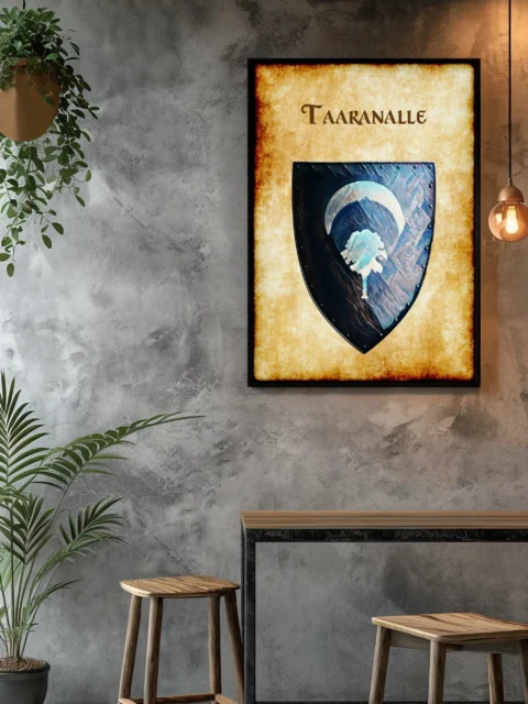 Additionally, the aged parchment background shows heavy weathering with darkened edges. The decorative serif lettering of ‘TAARANALLE’ crowns the heater-shaped shield. Metal studs ring the shield’s perimeter, particularly enhancing its medieval authenticity.