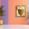 A red heraldic tree spreads across weathered wood within a riveted shield. This telaneteculi Greyhawk heraldry canvas print captures the mystical faction’s ancient emblem. Notably, verdigris-green metal rims frame the symbol against aged parchment.