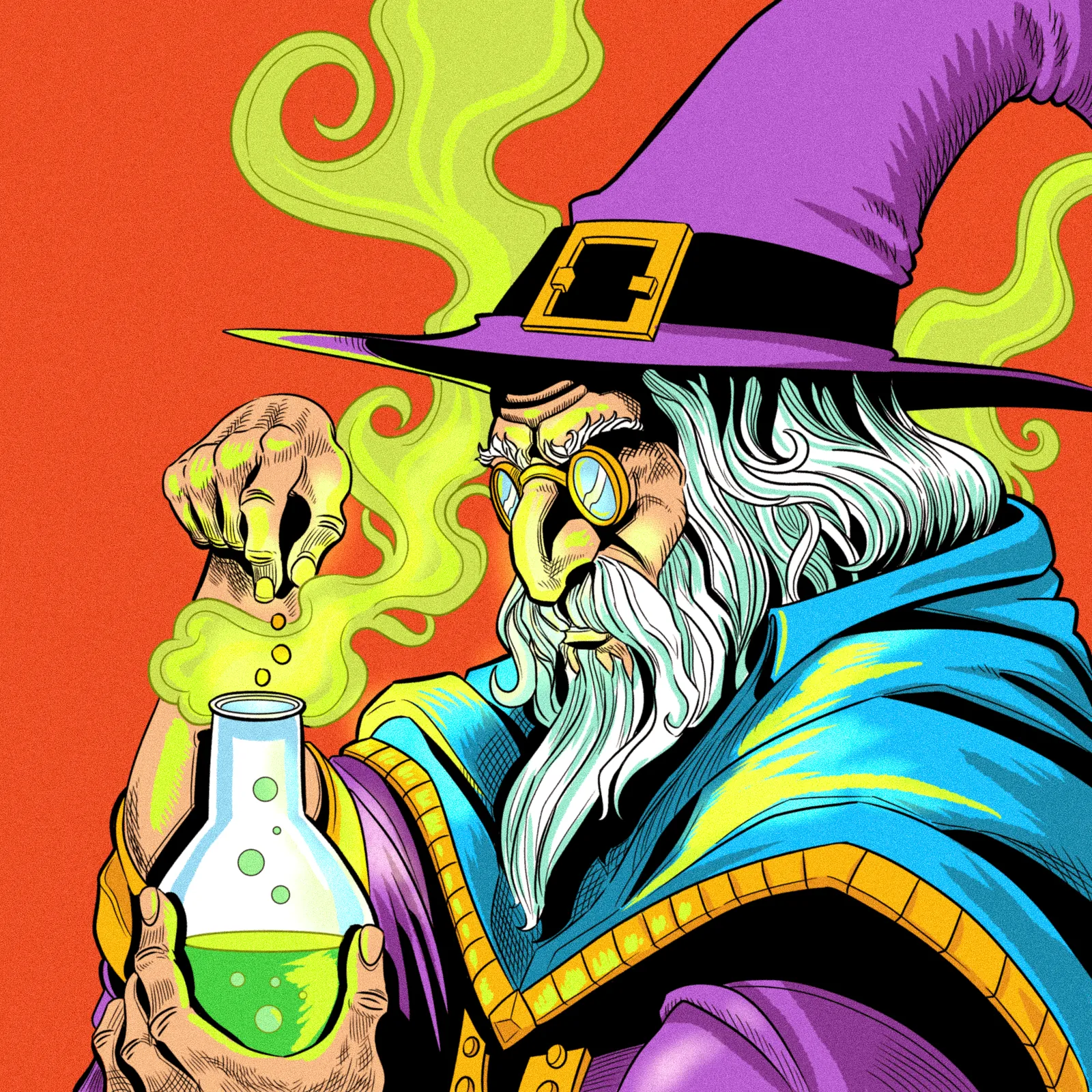Additionally, the complementary color palette contrasts saturated purples and blues against the warm orange-red backdrop. Bold black outlines with cross-hatching details define the flowing white beard and brass-rimmed spectacles. Moreover, the acid green potion creates a focal point that anchors the swirling composition.