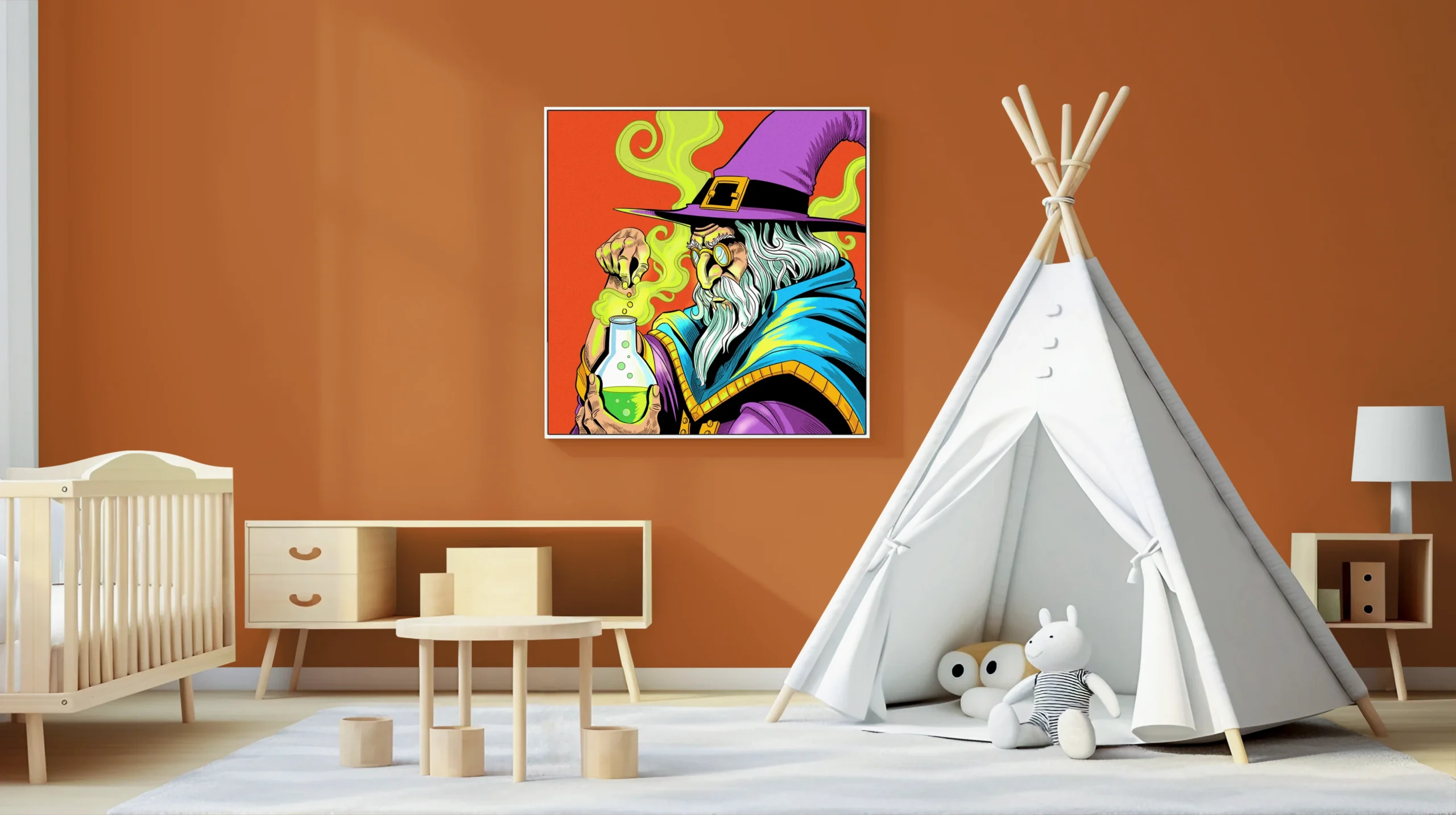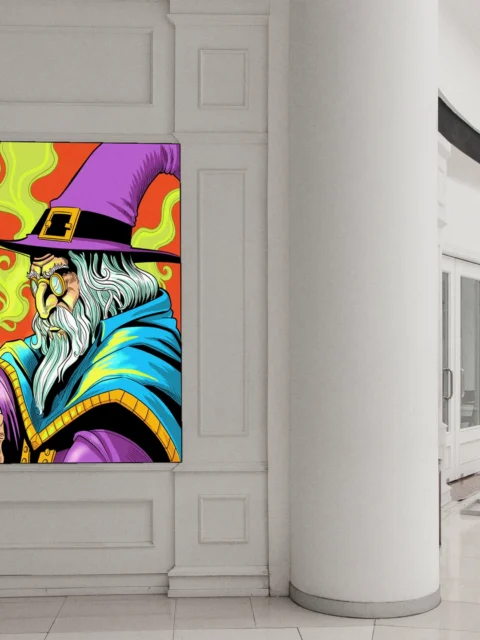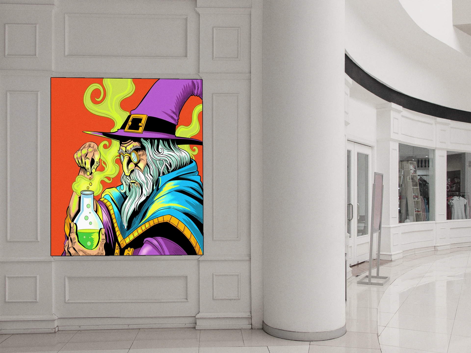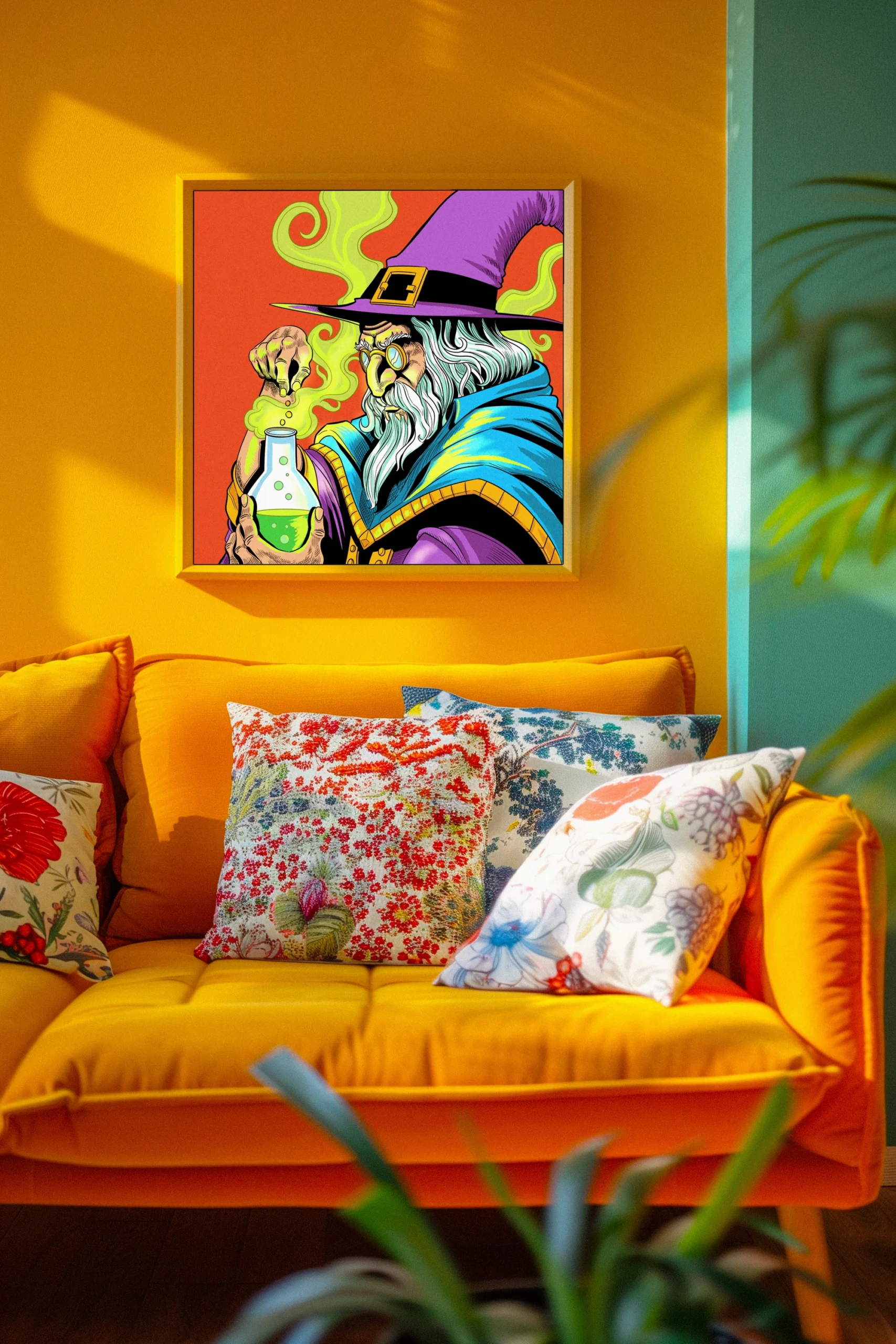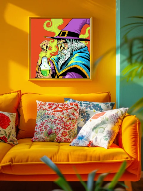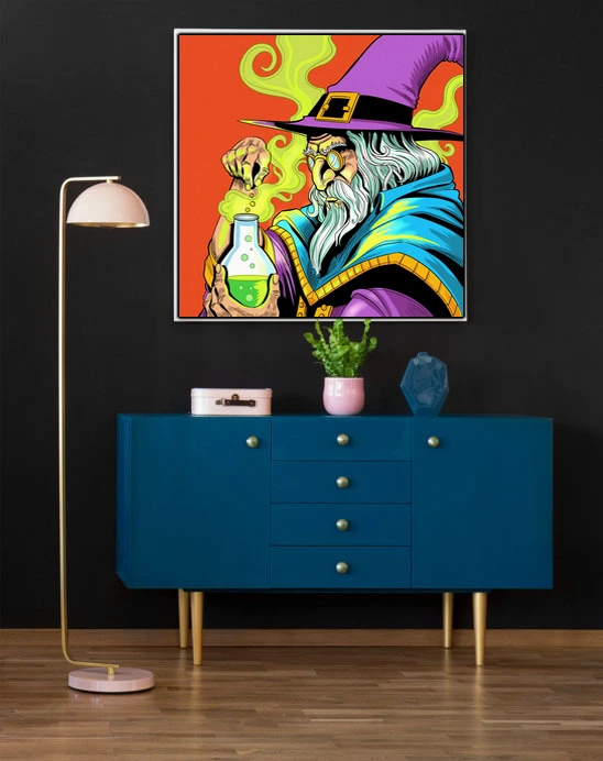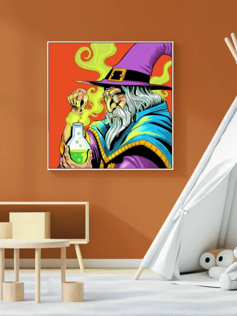 On the wall, the saturated colors maintain their comic book intensity at full scale. This appeals to Ward TCG collectors and fans of graphic novel fantasy illustration. The alchemist art trading card art canvas print delivers Vainer’s whimsical wizardry without card borders.
