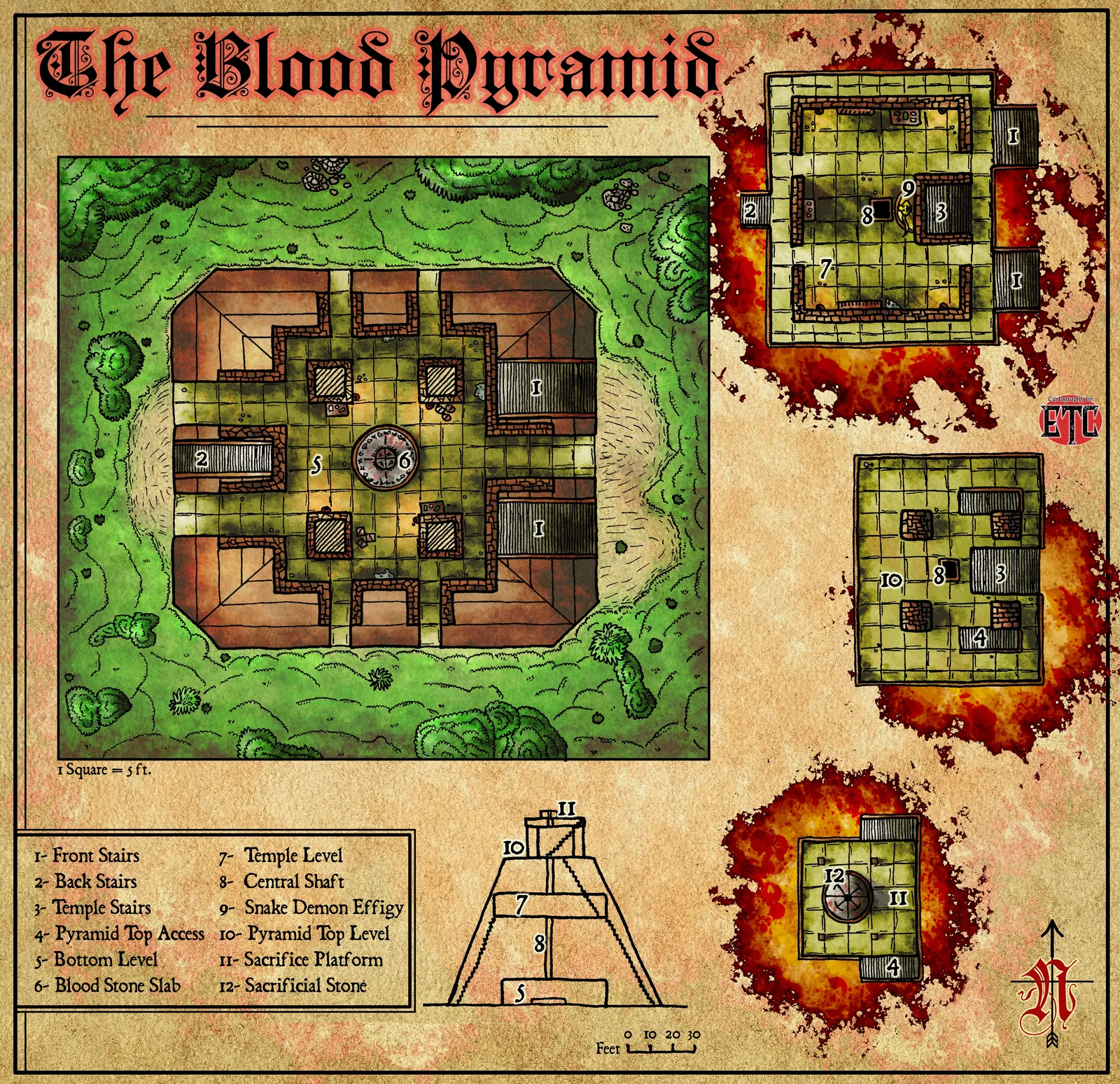What is more, the side-view cross-section reveals the pyramid’s vertical internal structure across all levels. Grid overlays mark eleven distinct locations including temple chambers and sacrificial platform. The legend system anchors each numbered room to specific encounter areas.