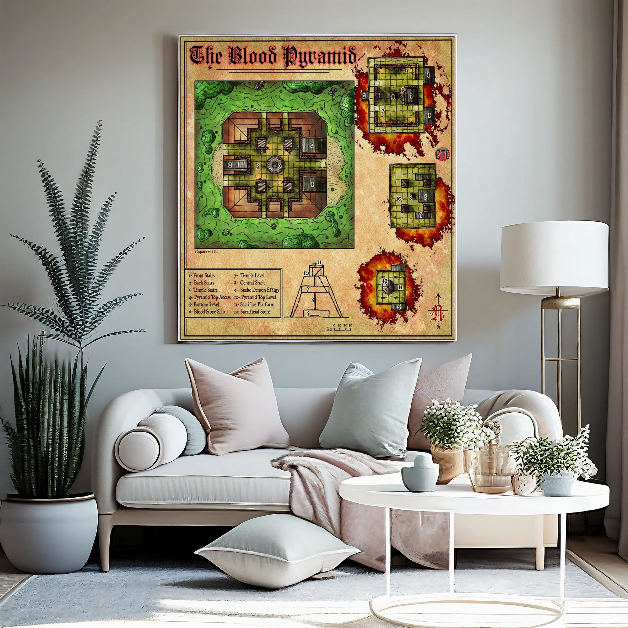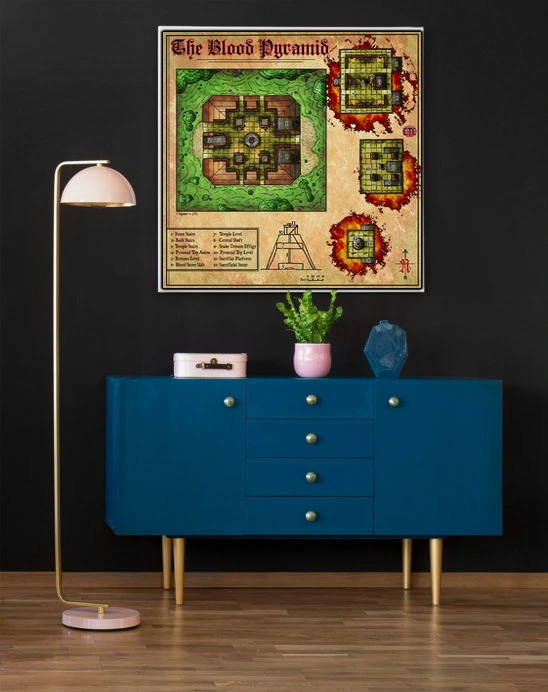 Dungeon masters running jungle temple campaigns recognize the layered utility immediately. Derek Ruiz designed this for Elven Tower’s Dungeon Vault catalog after writing for Candlekeep Mysteries. The blood pyramid fantasy battle map canvas print functions as reference tool and campaign statement, particularly for tomb-crawl adventures.