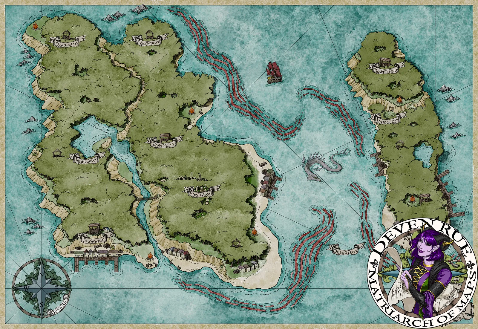 This map supports tabletop campaigns centered on sea travel, smuggling, or exploration. It also serves writers designing island chains where navigation and isolation shape daily life.