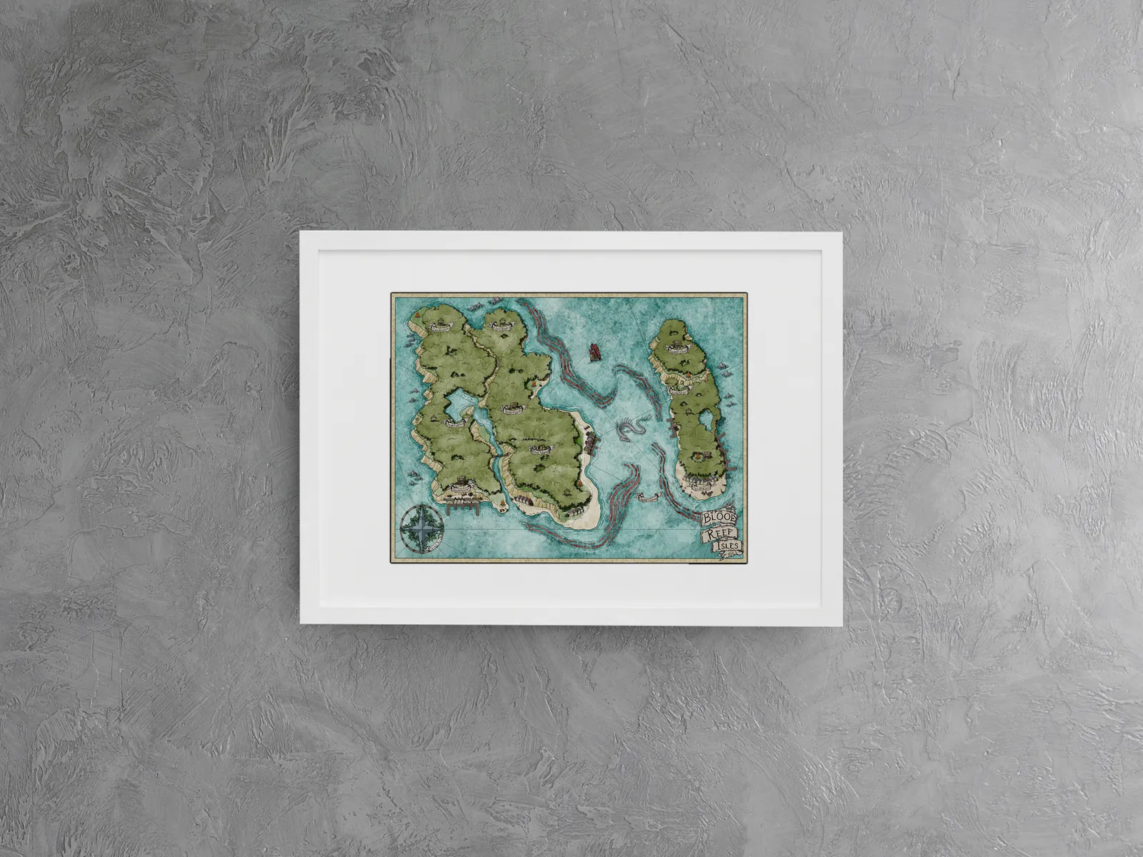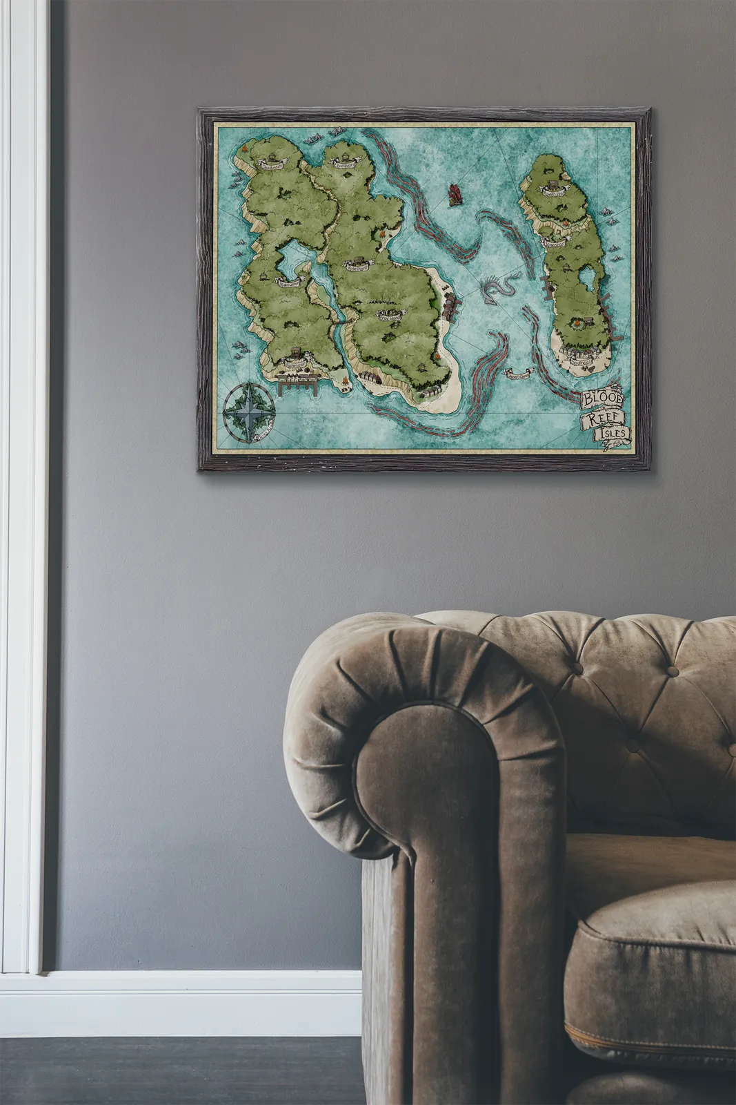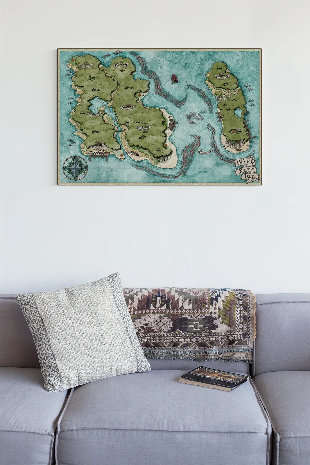 The Blood Reef Isles Map Gallery Canvas Print by Deven Rue depicts a dangerous island chain shaped by currents, reefs, and narrow coastal settlements. In the opening view, the Blood Reef Isles Archipelago Map defines a maritime setting where navigation determines survival. Moreover, the surrounding waters dominate the composition, therefore emphasizing isolation between islands. However, visible routes and landmarks suggest hard-won familiarity earned through repeated passage.