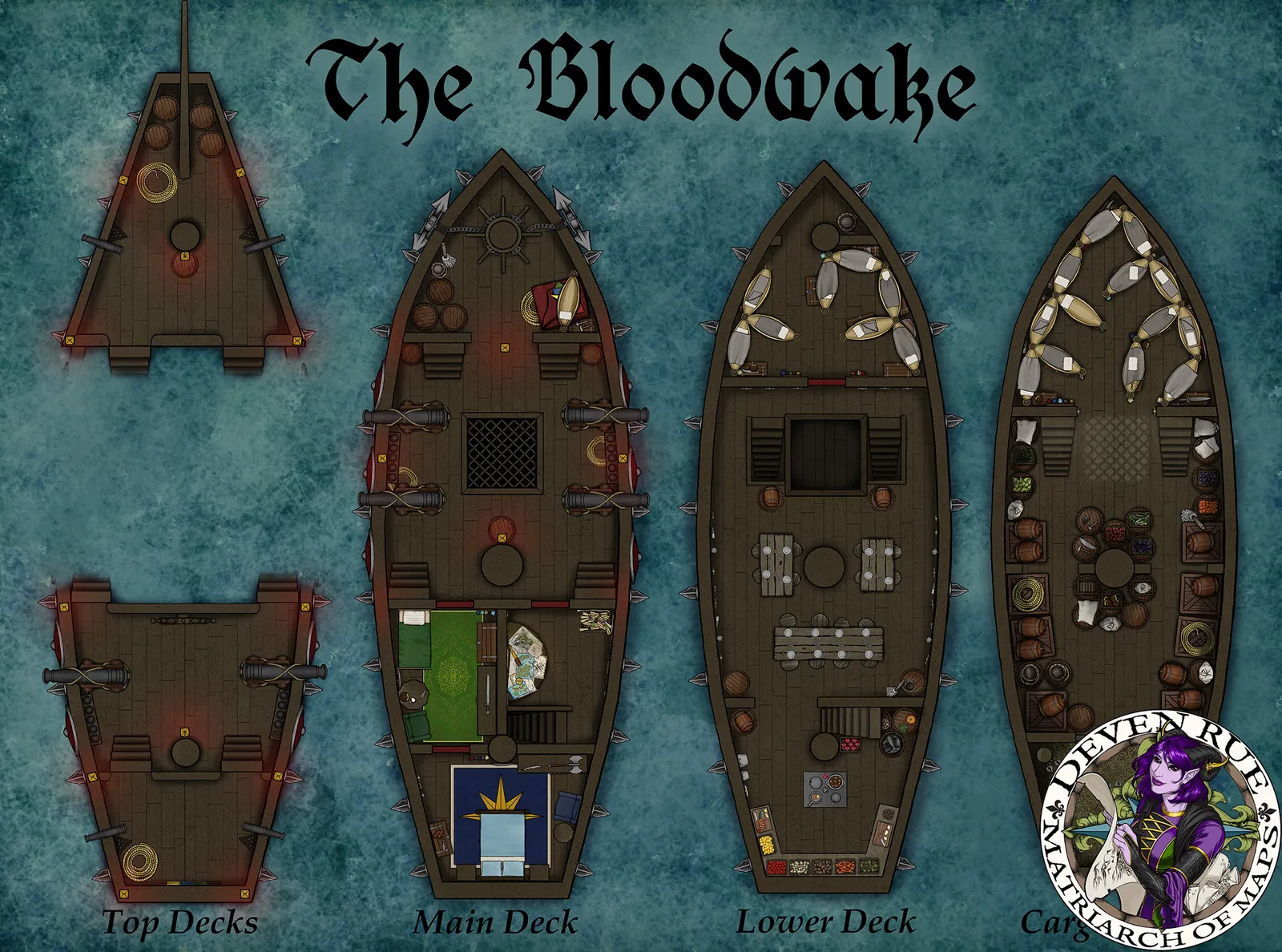 The Bloodwake Pirate Ship Map opens on a razor-scarred vessel cutting through hostile seas as danger presses from every direction. The Bloodwake Pirate Ship Map canvas vividly captures the atmosphere of peril at sea. Moreover, jagged hull spikes and weapon placements suggest imminent boarding while shadowed decks imply ruthless intent. Consequently, the scene establishes tension through implied conflict rather than explicit violence.