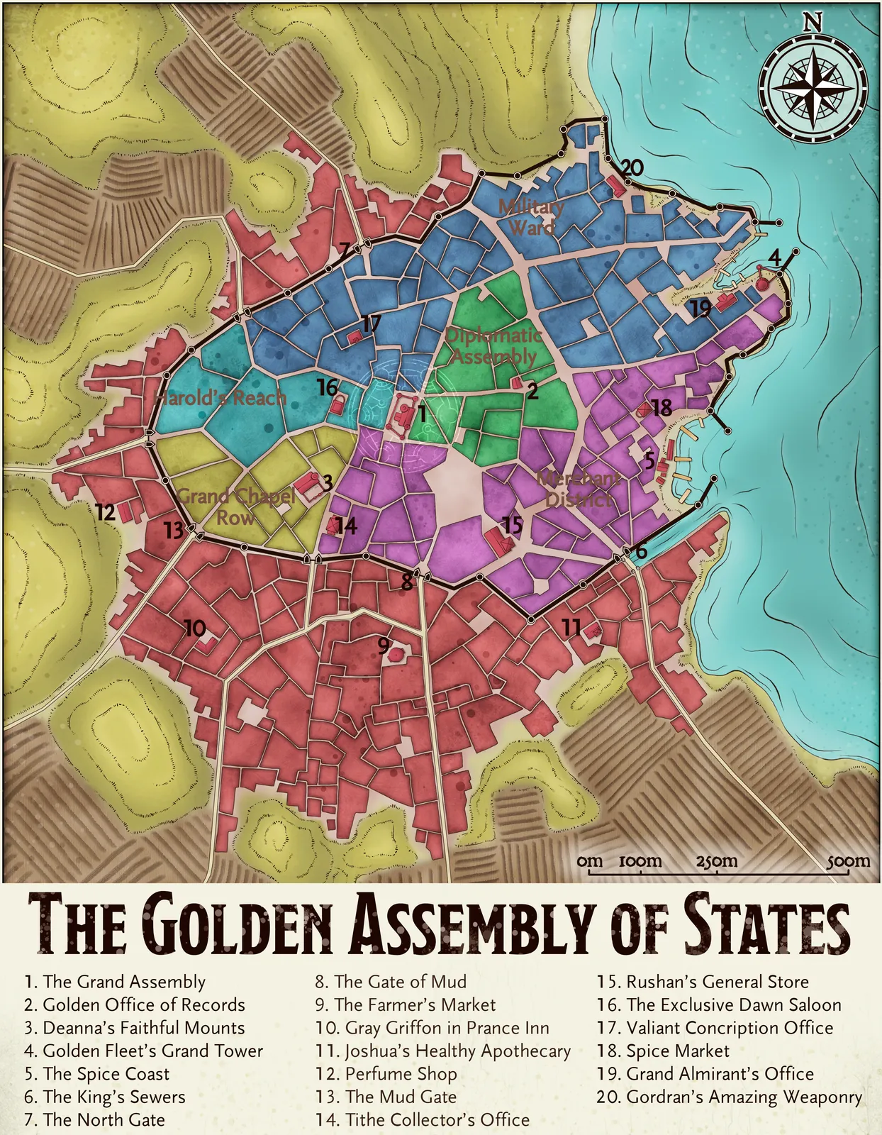 Six color-coded districts divide a coastal settlement into distinct neighborhoods around white roads. The Golden Assembly of States fantasy battle map canvas print charts a functioning city keyed to twenty numbered locations. Turquoise water wraps the eastern shore while topographic hills fill the western terrain.
