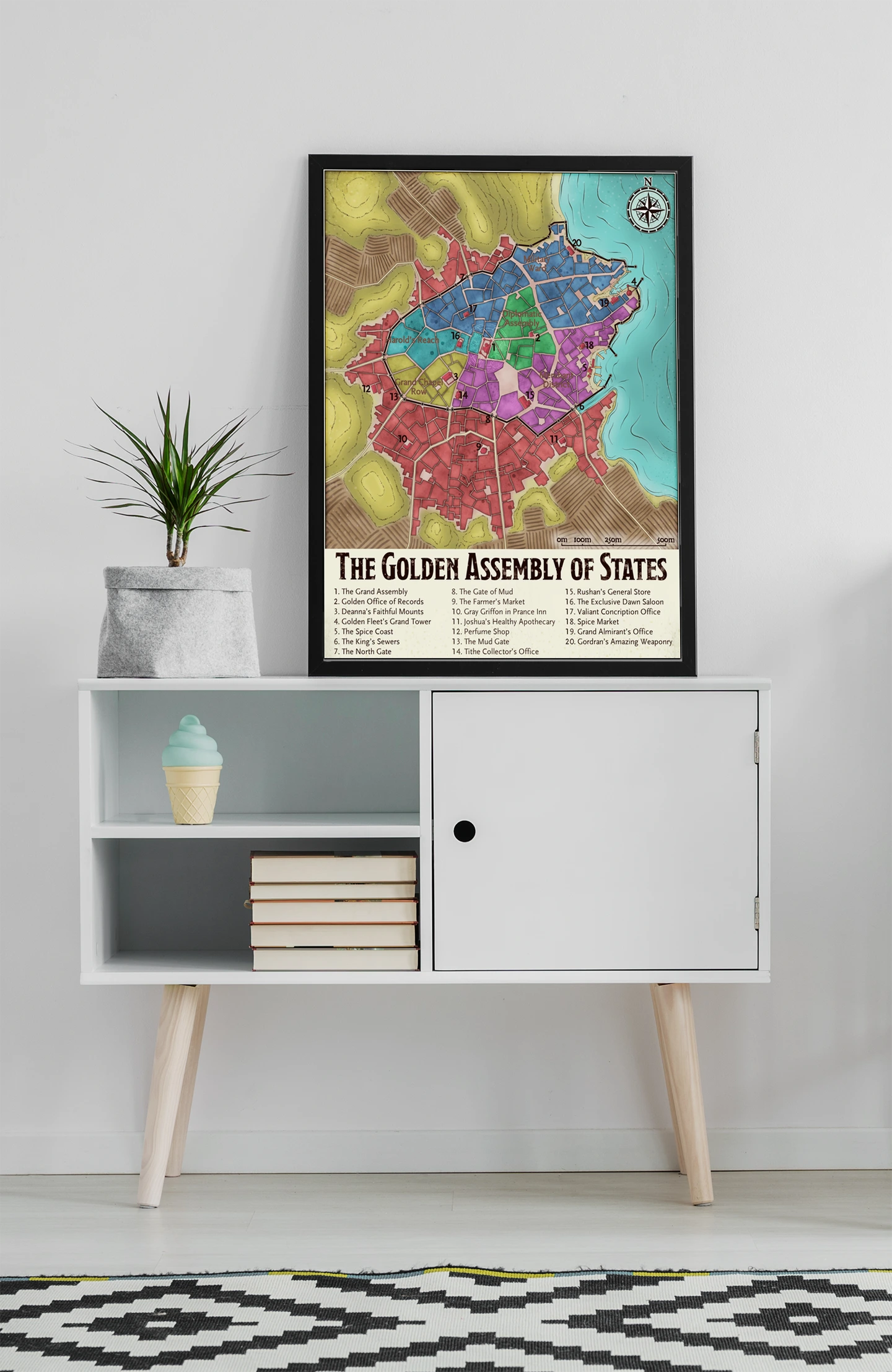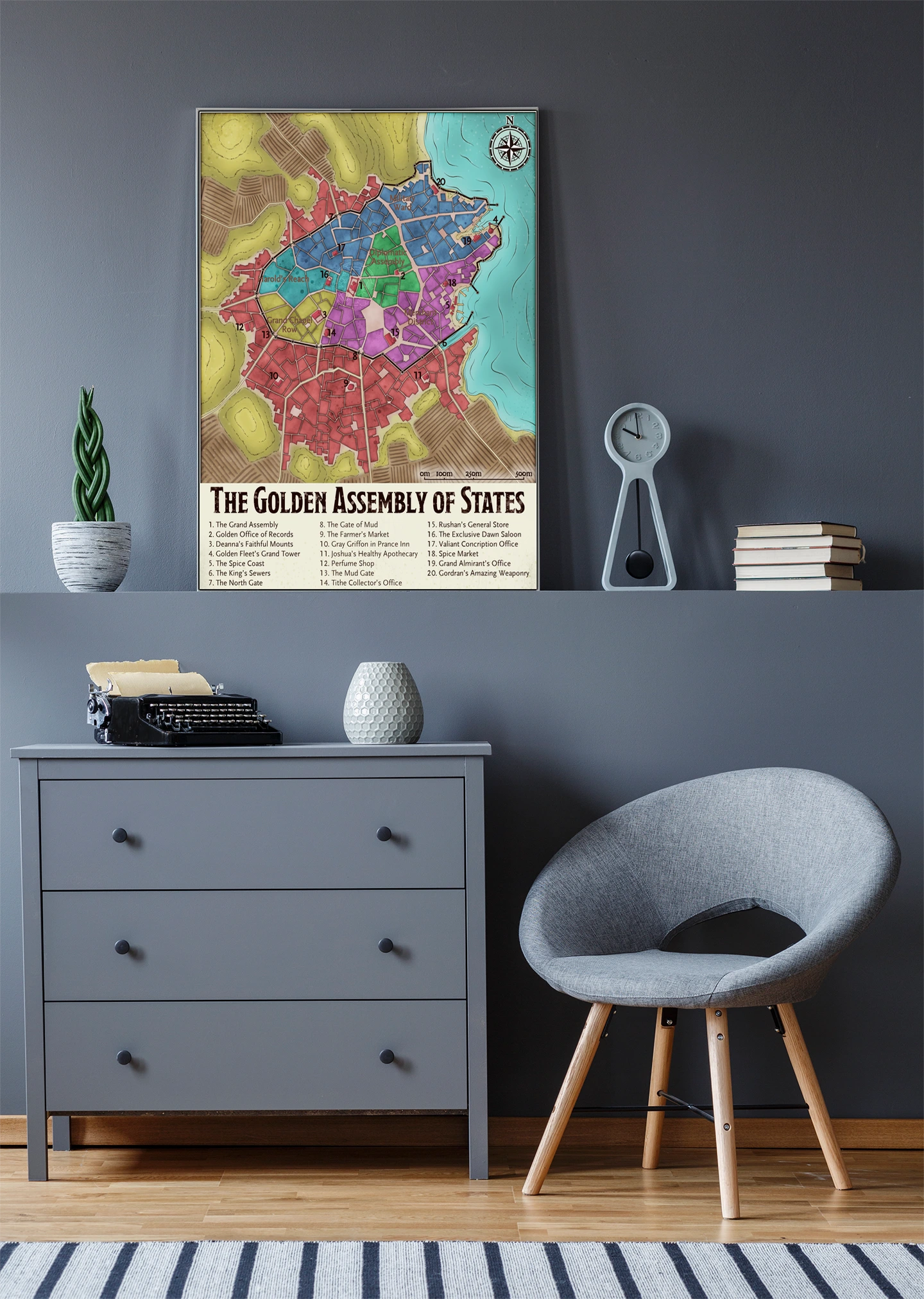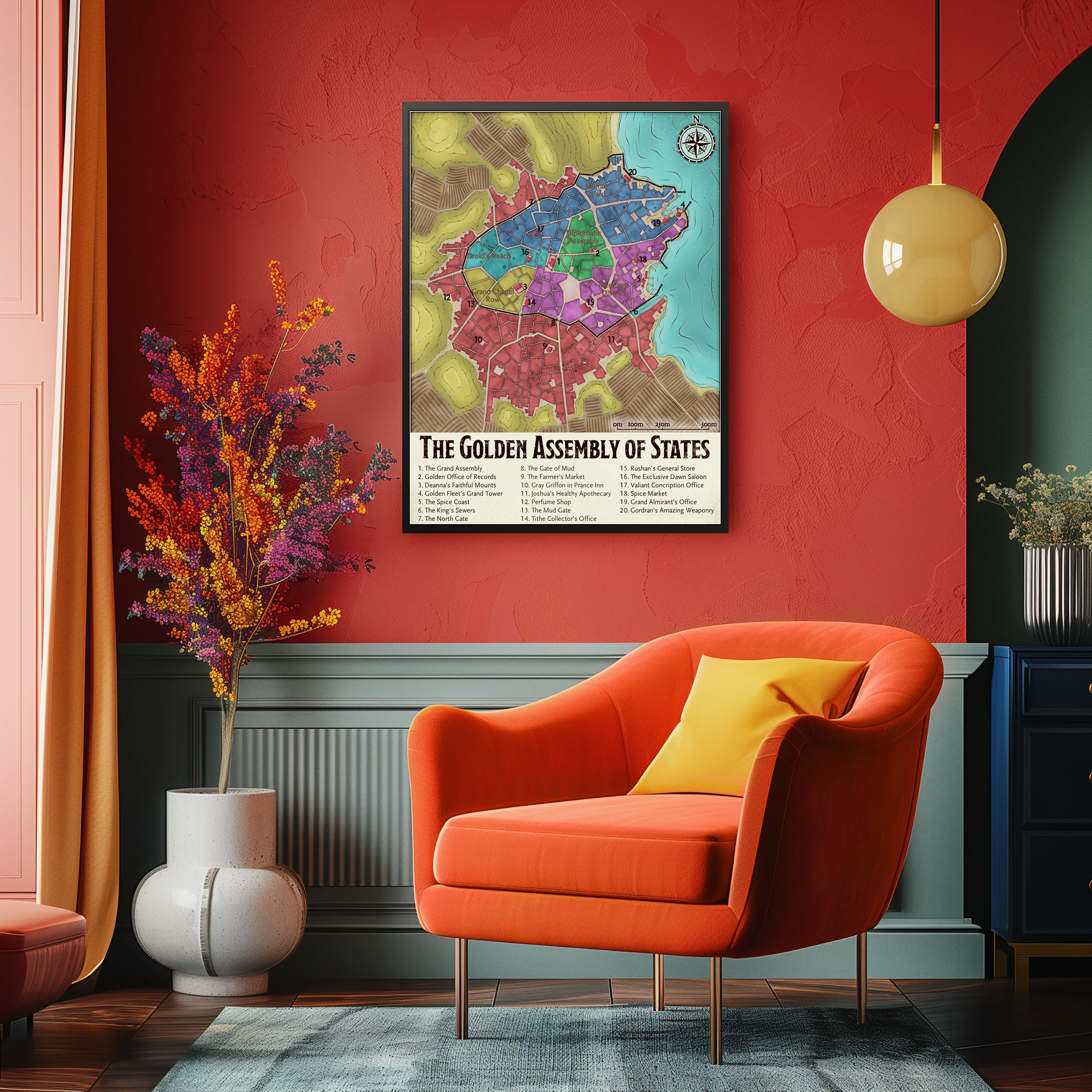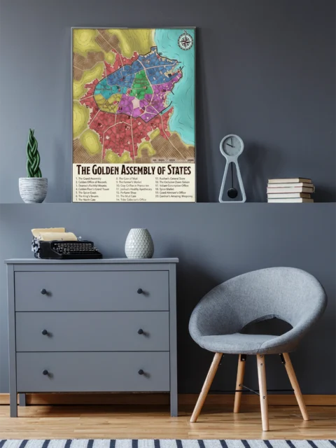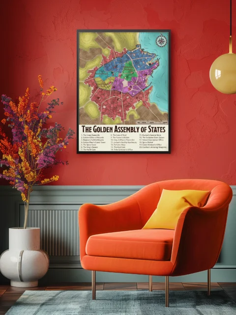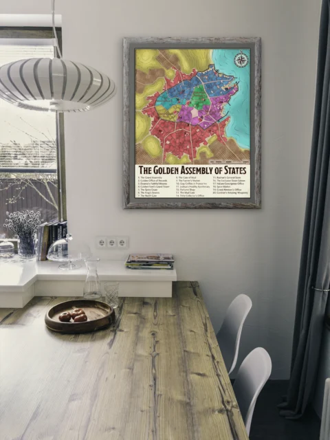 Campaign maps belong where they inform sessions and reward study between games. Dungeon masters who prep urban adventures need district layouts visible during play. The Golden Assembly of States fantasy battle map canvas print particularly serves DMs running political intrigue in waterfront cities.