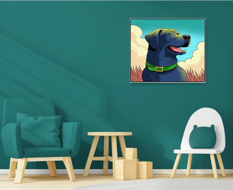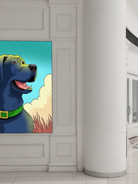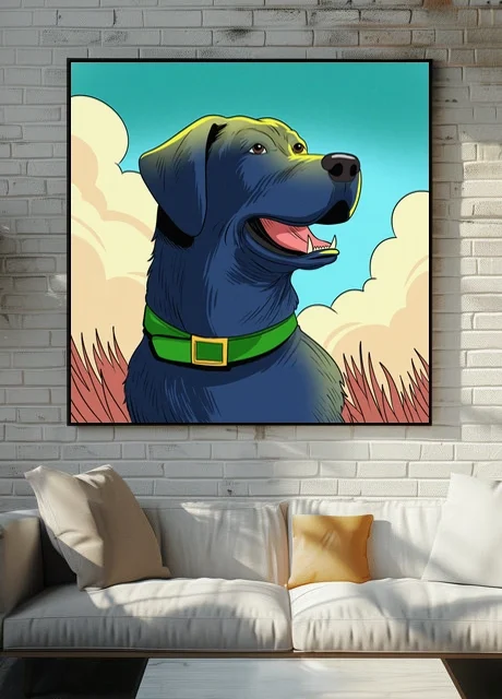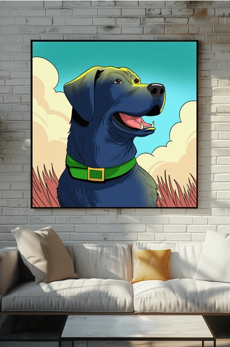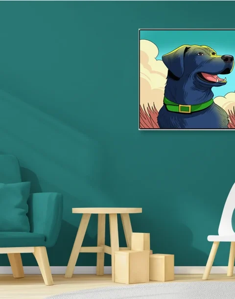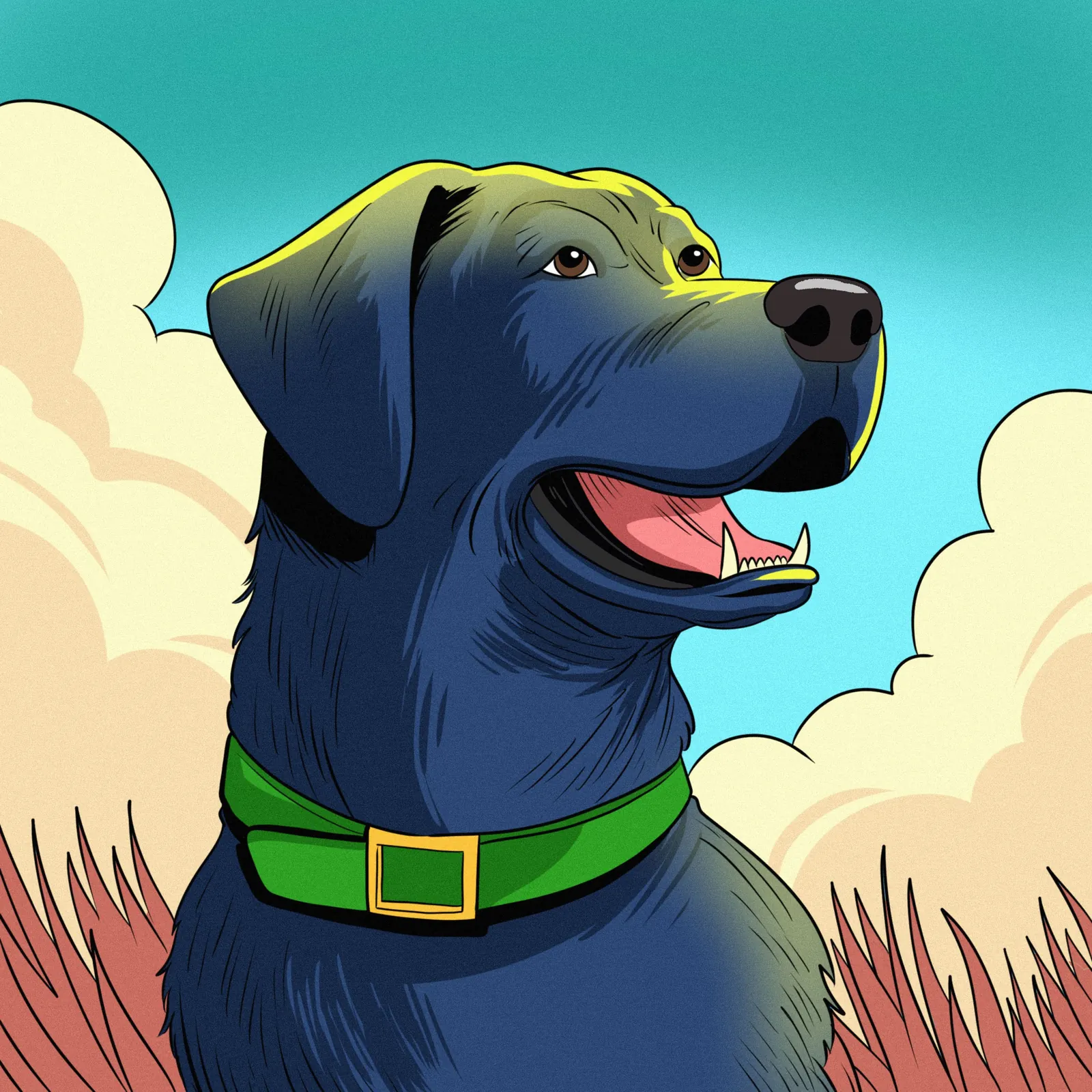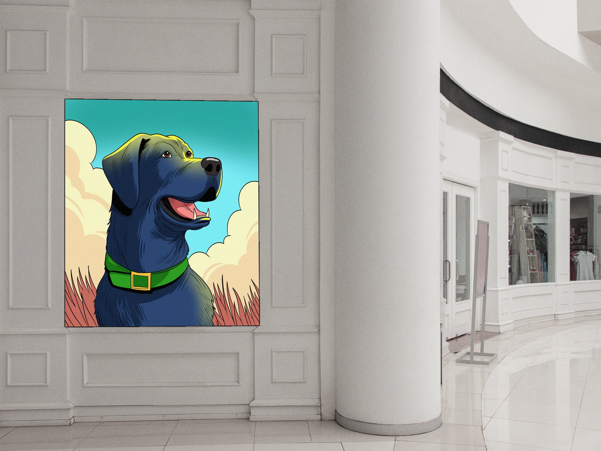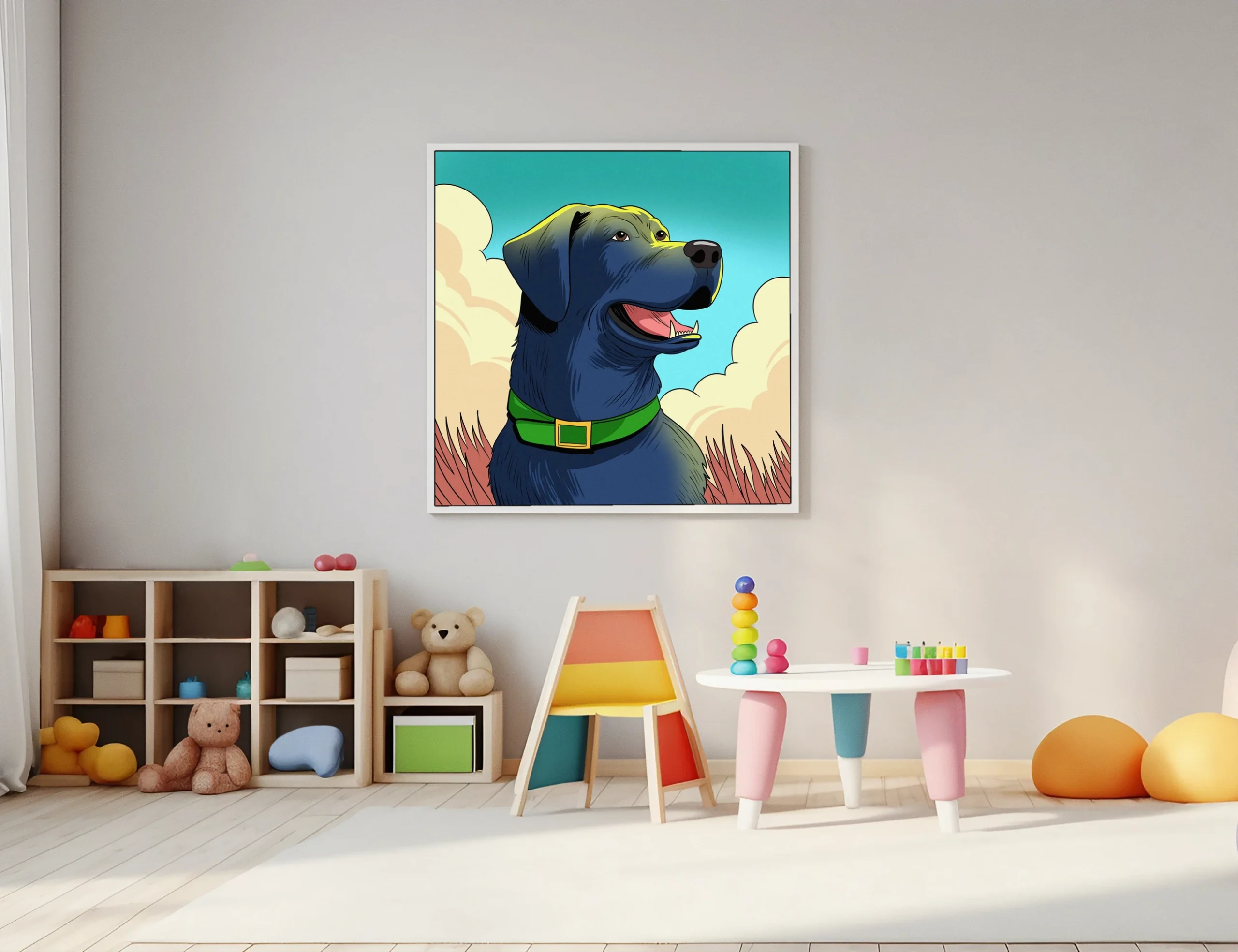 A dark blue-gray Labrador Retriever pants happily in three-quarter profile view. The good boy art trading card art canvas print captures Fabricio Vainer’s cel-shaded illustration with clean vector-style linework. Notably, yellow-green rim lighting traces the dog’s head and muzzle against turquoise sky.